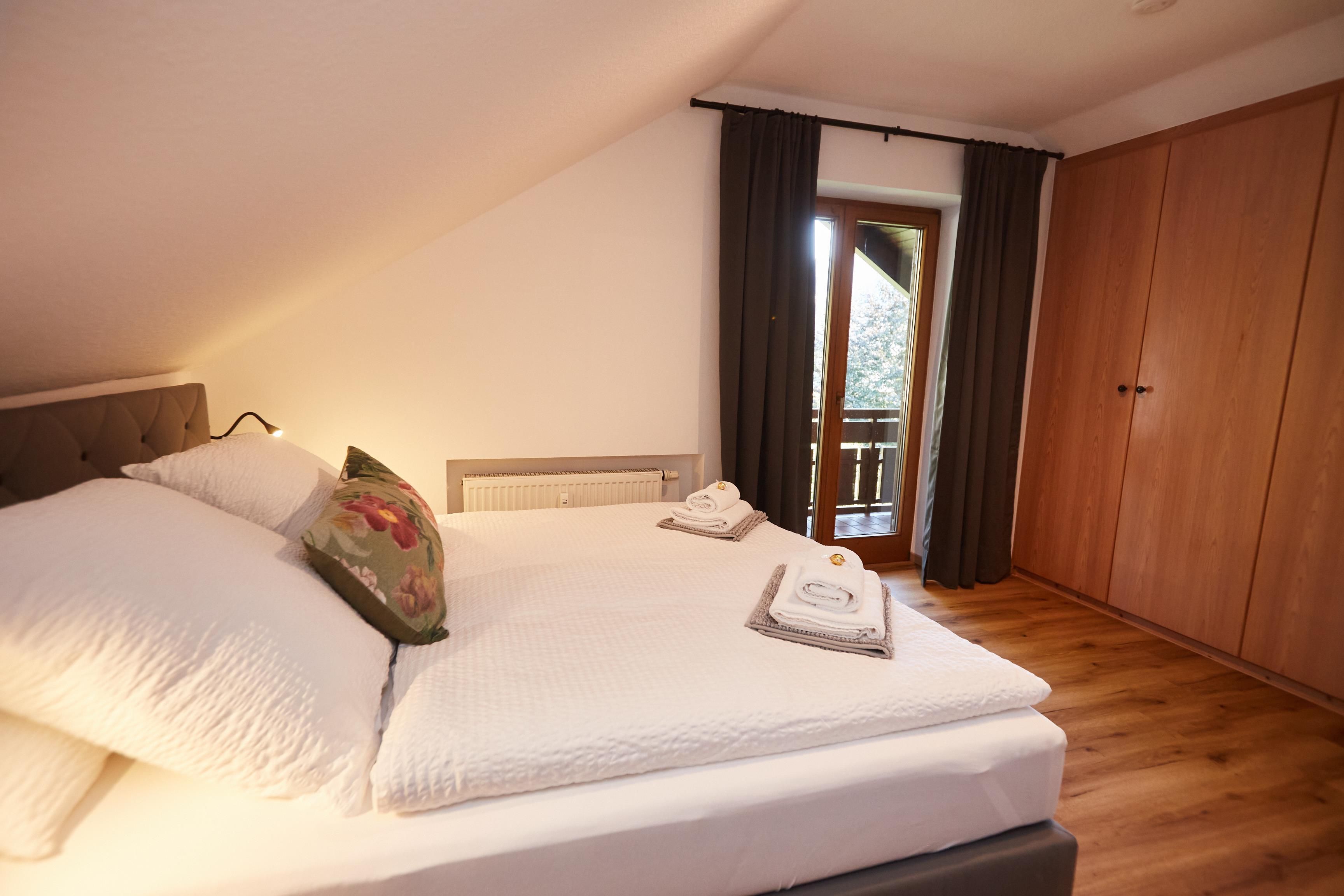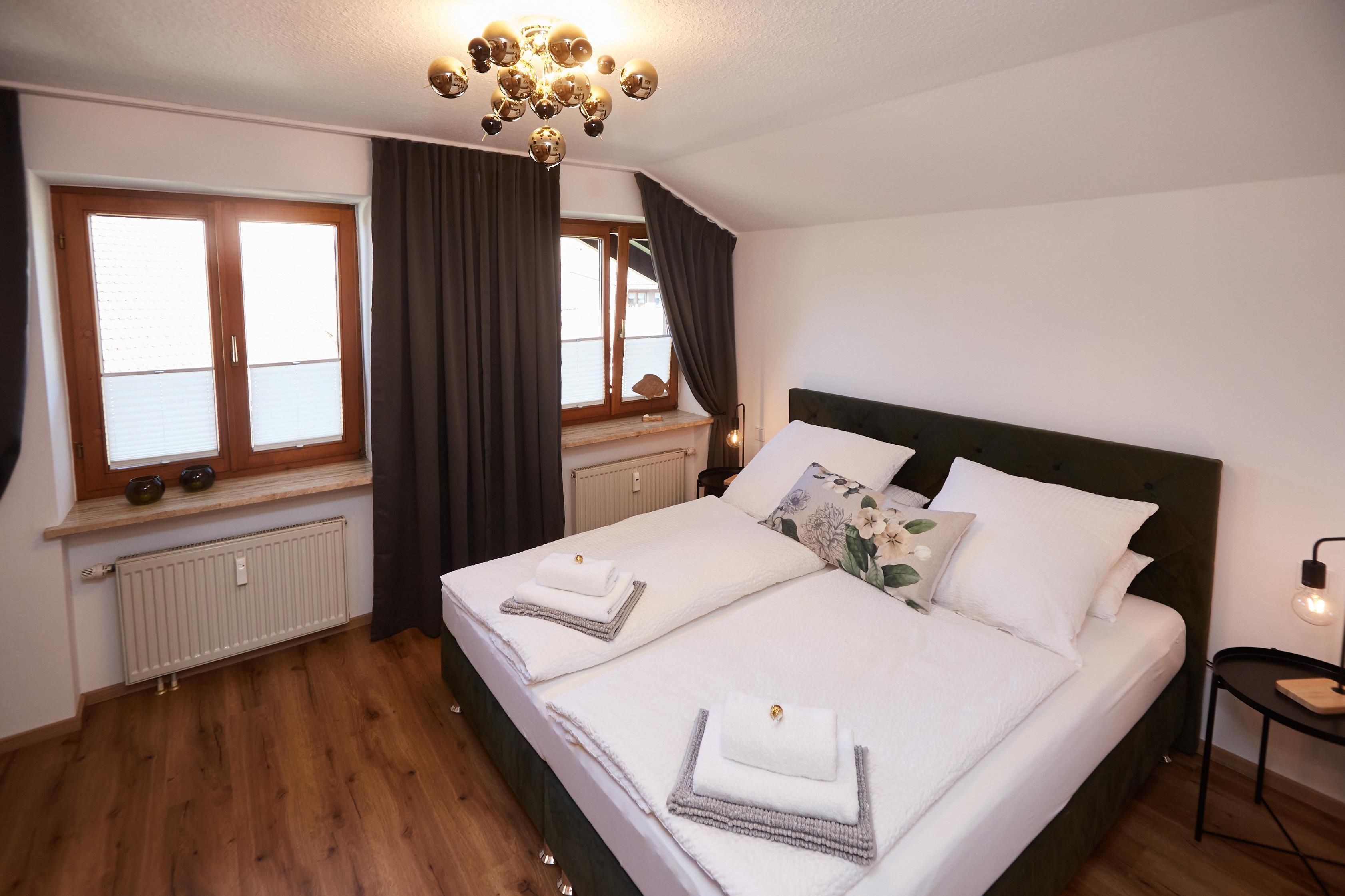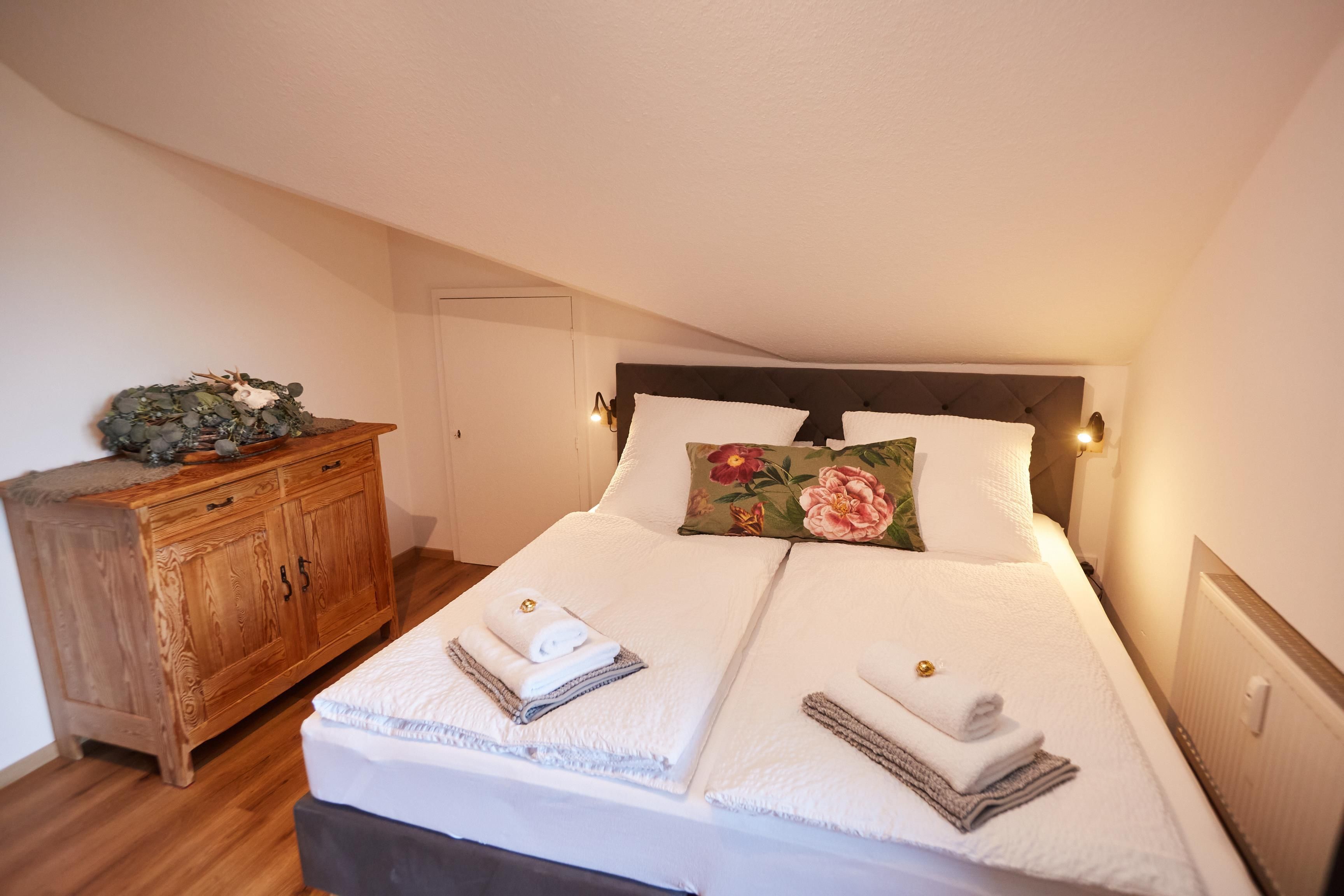 Die 90 m² große, im alpinen Lifestyle eingerichtete Dachgeschosswohnung bietet mit seinen zwei Schlafzimmern mit Kingsize Boxbetten und einer gemütlichen Couch Platz für bis zu vier Personen plus ein Kleinkind bis zu 3 Jahren, für welches wir auf Anfrage ein Reisebett und einen Hochstuhl gegen eine einmalige Gebür von 20,-€ zur Verfügung stellen.