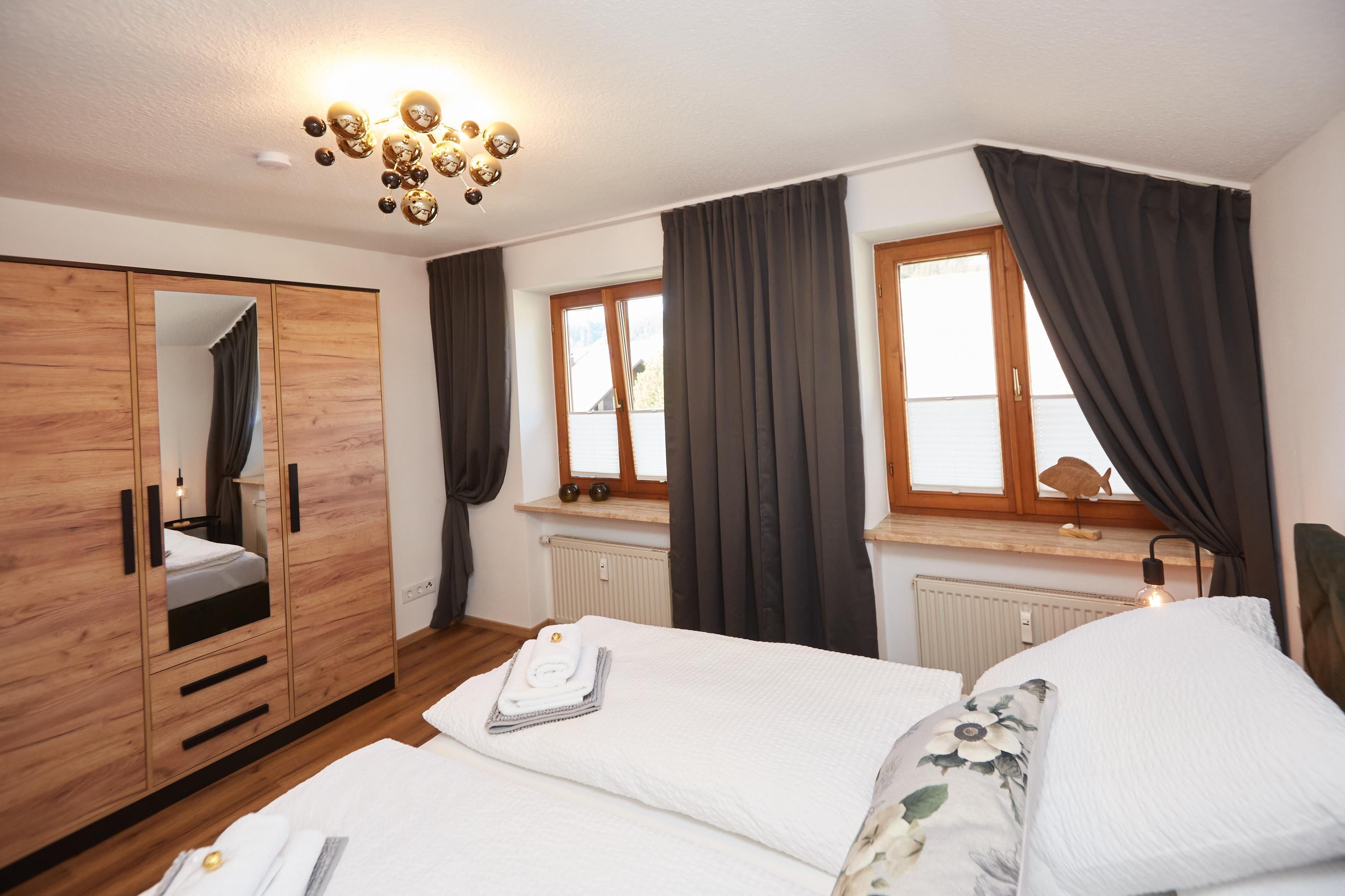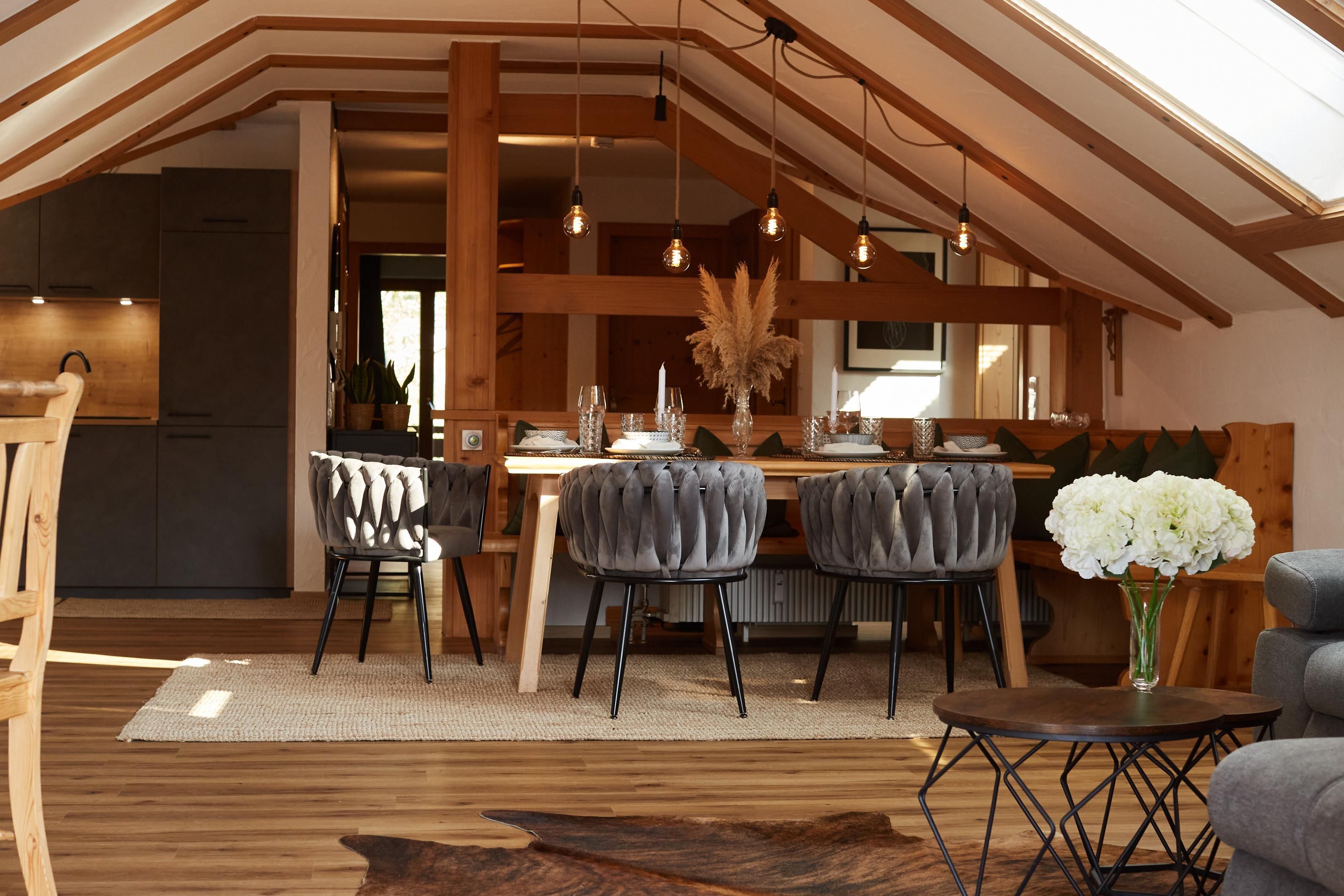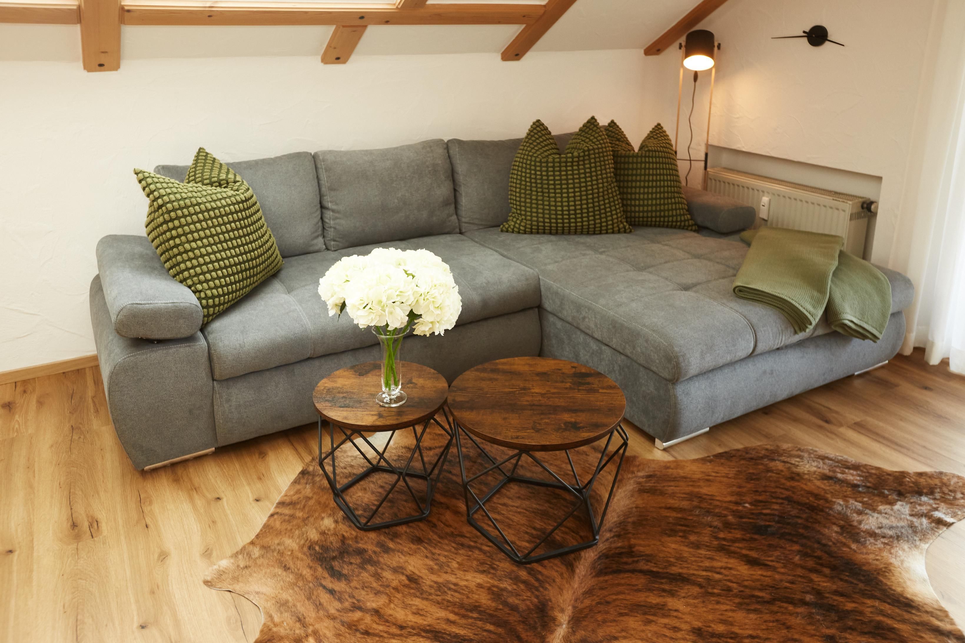 Die 90 m² große, im alpinen Lifestyle eingerichtete Dachgeschosswohnung bietet mit seinen zwei Schlafzimmern mit Kingsize Boxbetten und einer gemütlichen Couch Platz für bis zu vier Personen plus ein Kleinkind bis zu 3 Jahren, für welches wir auf Anfrage ein Reisebett und einen Hochstuhl gegen eine einmalige Gebür von 20,-€ zur Verfügung stellen.
