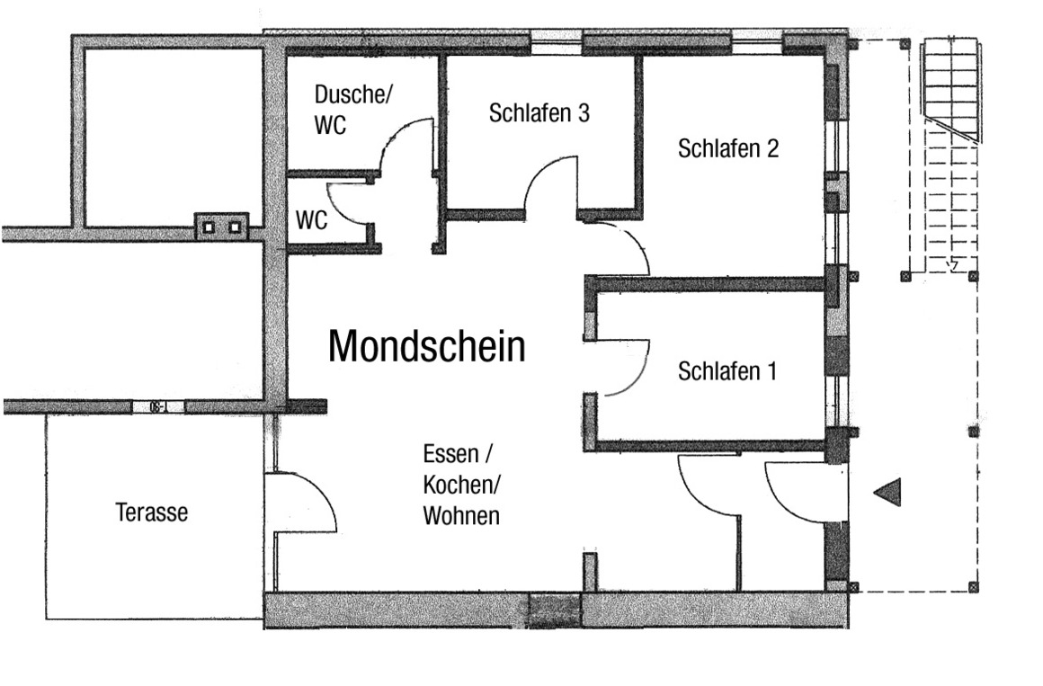 Die Whg. Mondschein mit 3 Schlafräumen ist für 5 Personen geeignet. Sie ist 95 qm groß, hat eine geräumige Wohnküche, Dusche/WC, Terrasse.