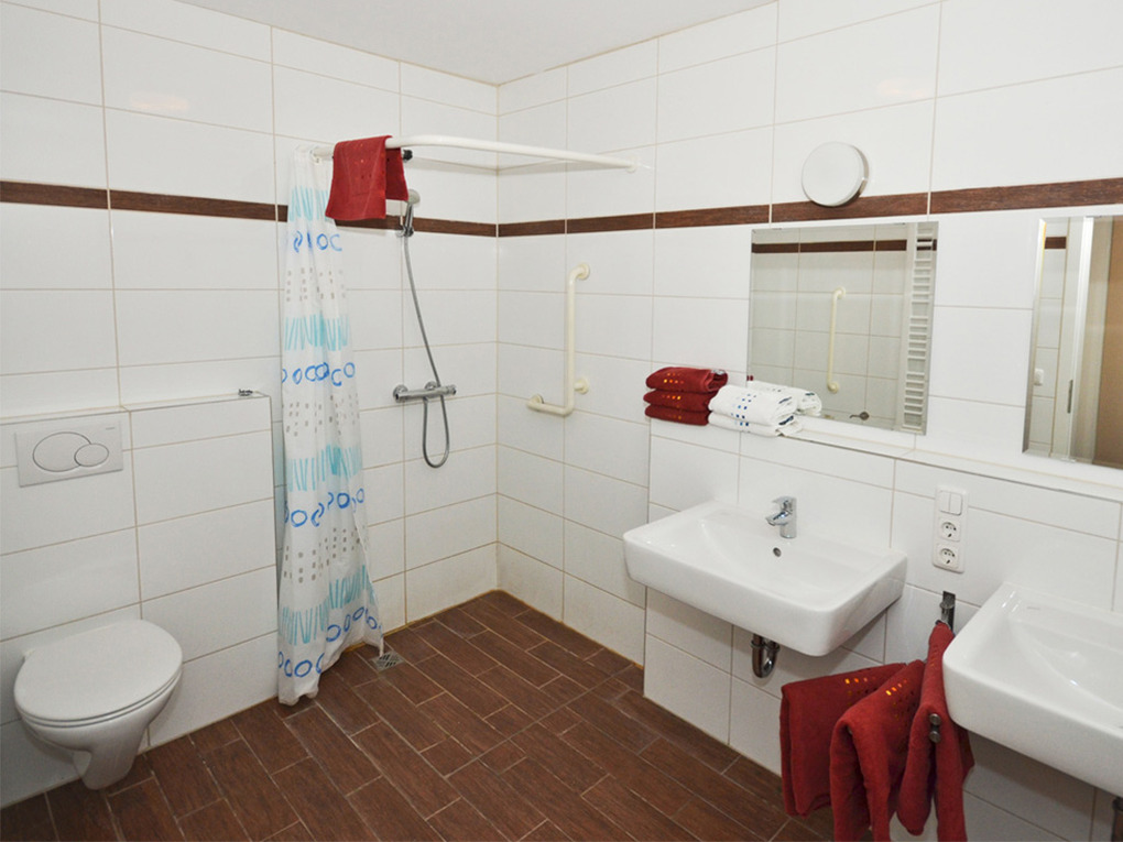 Der Wohn- und Schlafbereich erstreckt sich über eine Ebene. Neben eines extra WCs befindet sich ein rollstuhlgerechtes Bad direkt nebenan.