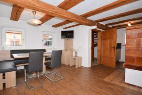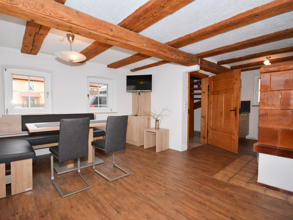 Das ehemalige Schusterei-Gebäude bietet genügend Platz für Ihre fünfköpfige Familie. Über drei Ebenen erstreckt sich die gemütliche Unterkunft und ist durch ihren historischen Charakter etwas ganz besonderes. Die Wohnstube im Erdgeschoss verfügt über einen Kachelofen, welcher an kalten Tagen angeschürt werden kann.