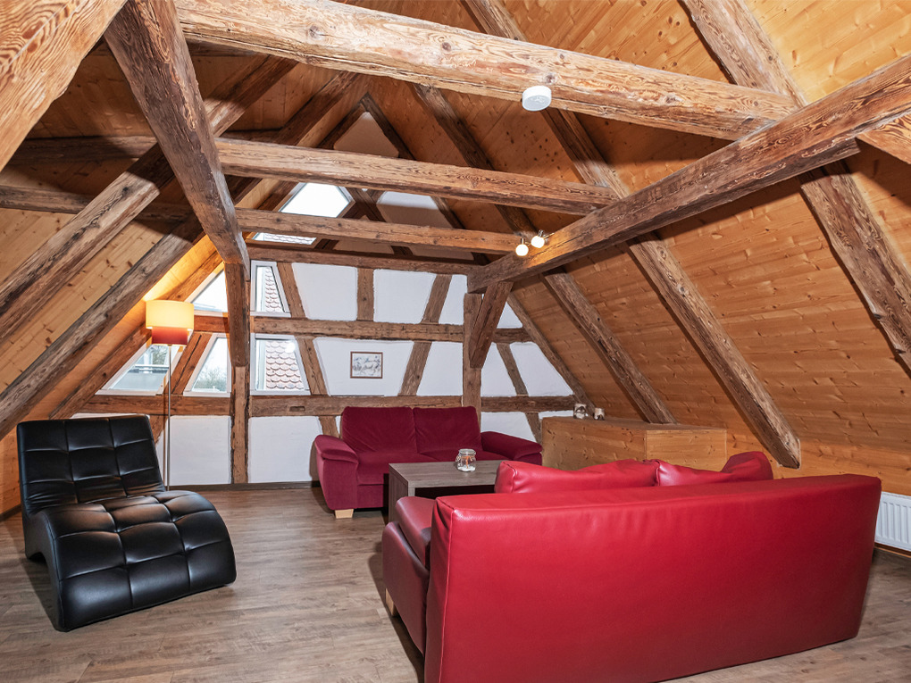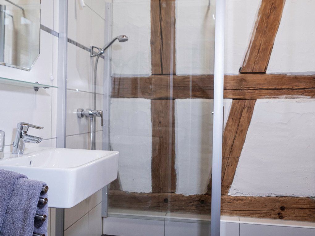 Unser Haus Wildrose ist die größte Unterkunft am Hof. Mit ihren geräumigen 115 qm bietet sie ausreichend Platz um es sich gemütlich zu machen. Das Fachwerkambiente vermittelt ein stimmungsvolles Ambiente und macht die Unterkunft zu etwas ganz Besonderem. Die zentrale Lage der Unterkunft bietet die perfekte Grundlage für Ihren Familienurlaub bei uns. Die Wohnung verfügt sowohl über einen Haupteingang, als auch über einen weiteren Zugang, erreichbar über einen ruhigen Nebengarten.