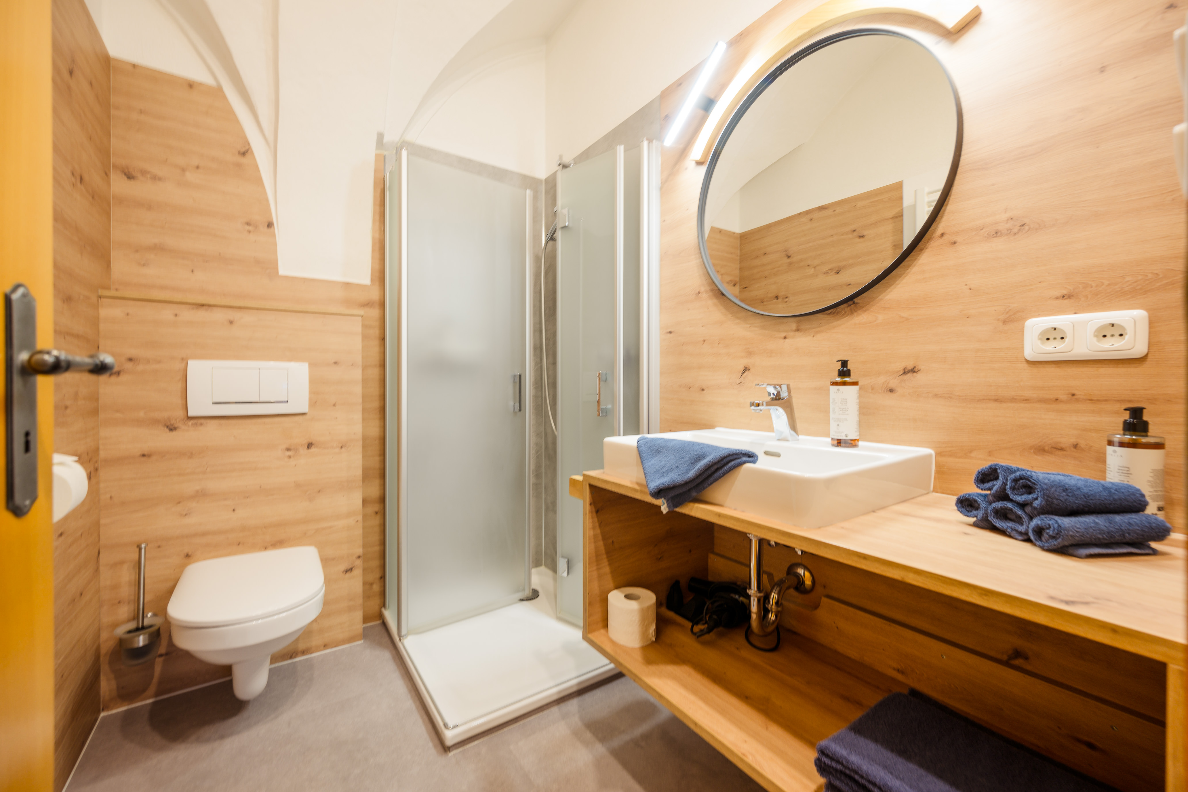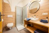 Im Bad befindet sich eine Dusche, ein Waschbecken und ein WC.