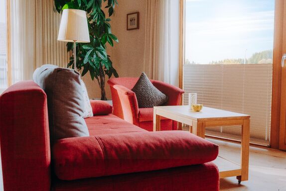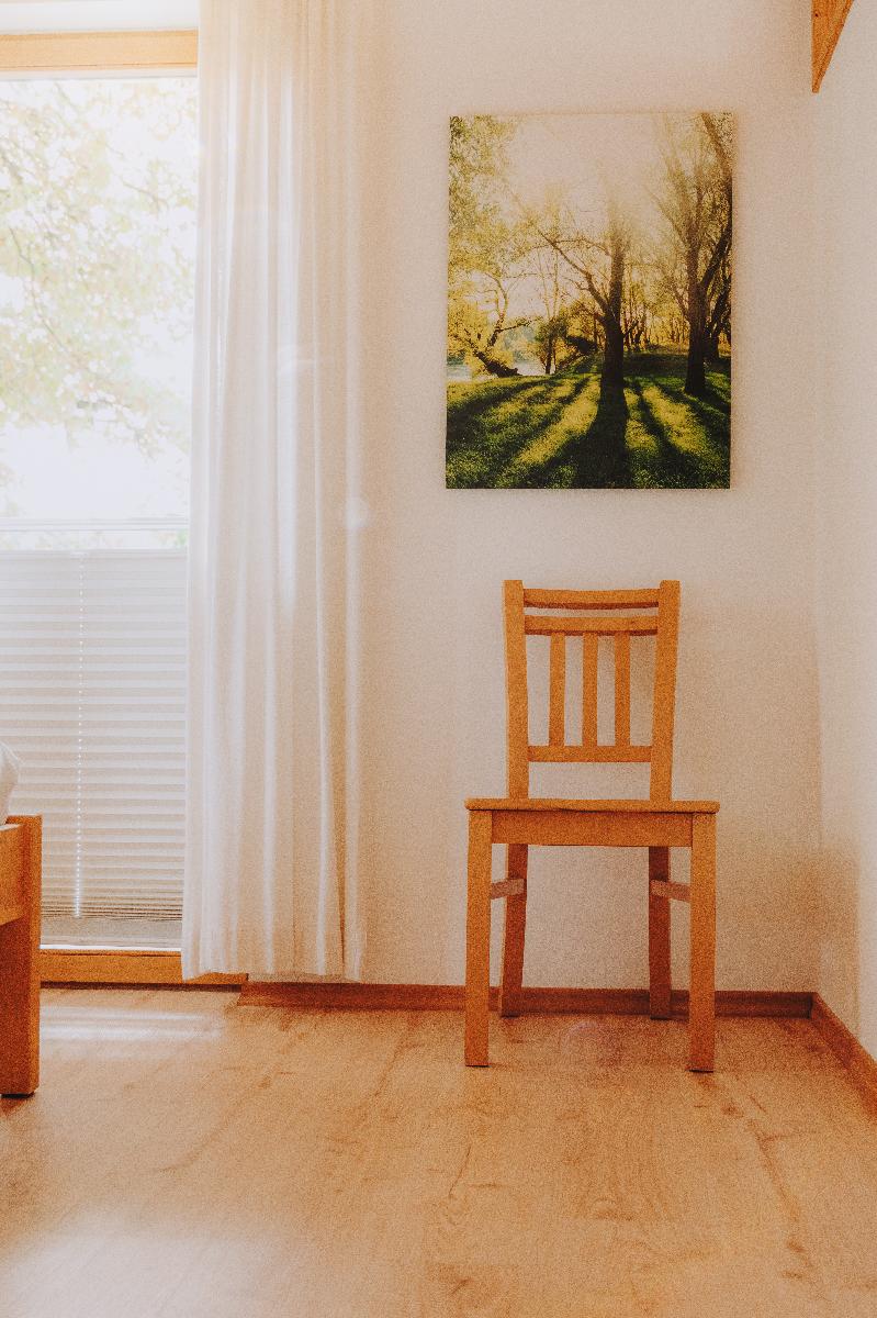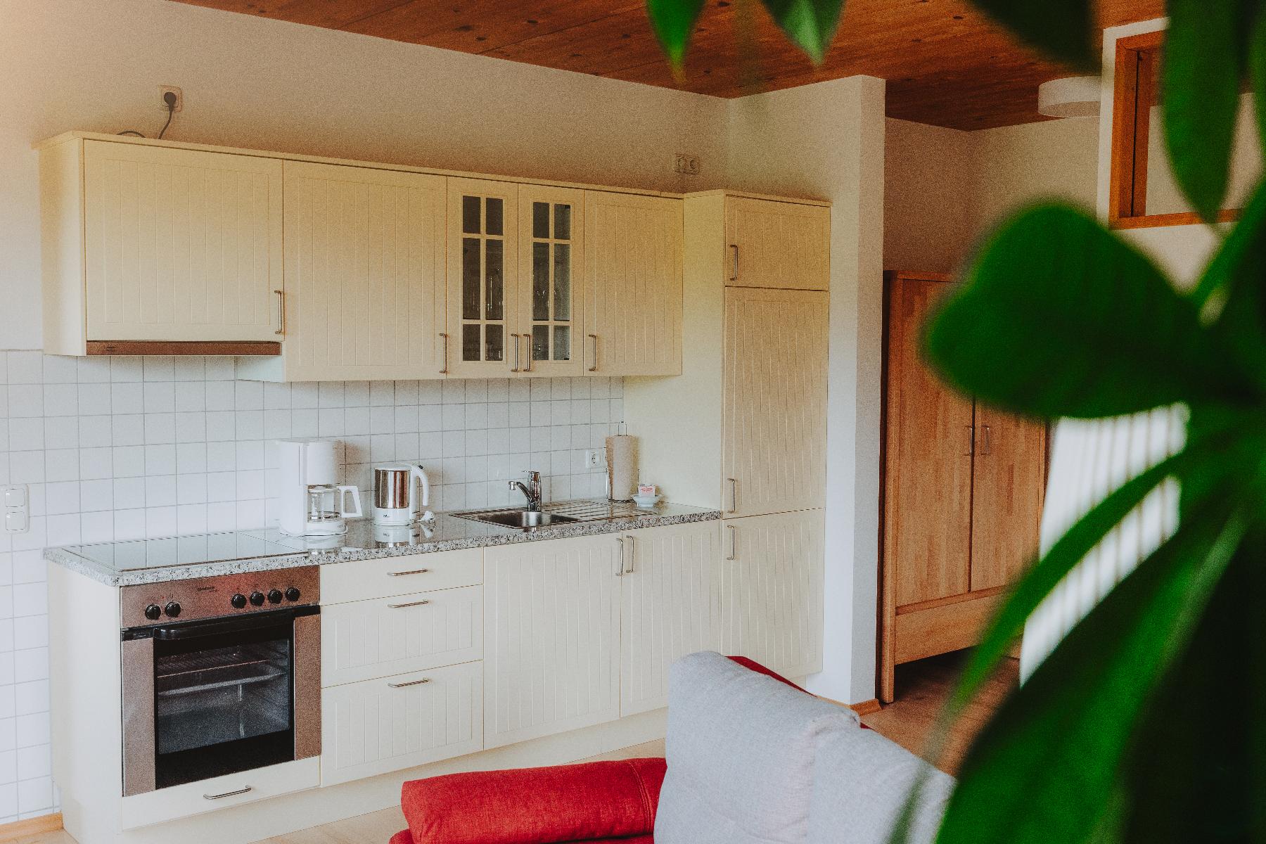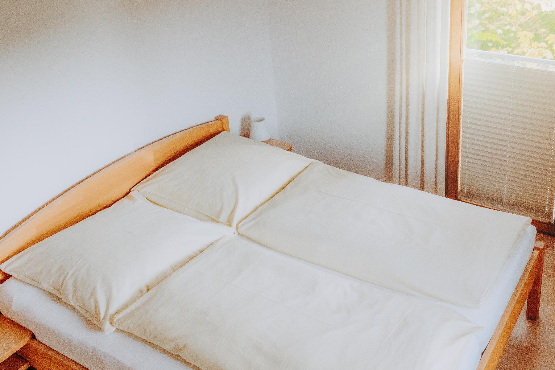 Ferienwohnung Nr. 1 im 1. Stock (42 qm) mit großem Balkon mit Liegestuhl und Sitzgruppe. Appartement ist open-plan gestaltet und hat hochwertigen Wineo-Bioboden. Voll ausgestattete Küchenzeile mit Wasserkocher und Filterkaffeemaschine. Essgruppe mit rundem Tisch aus Vollholz, Im Schlafbereich Doppelbett (160 cm) aus Vollholz mit verstellbarem Lattenrost und Wende-Matratzen in zwei wählbaren Festigkeiten. Großes oder kleineres Kopfkissen zur Auswahl. Netzfreischalter im Schlafbereich. Möglichkeit für dritte Person auf dem Sofabett zu schlafen. DU/WC mit wohliger Fußbodenheizung. Handtücher und Bettwäsche inklusive. Verdunkelungsvorhänge. Gratis WLAN und SAT-TV.