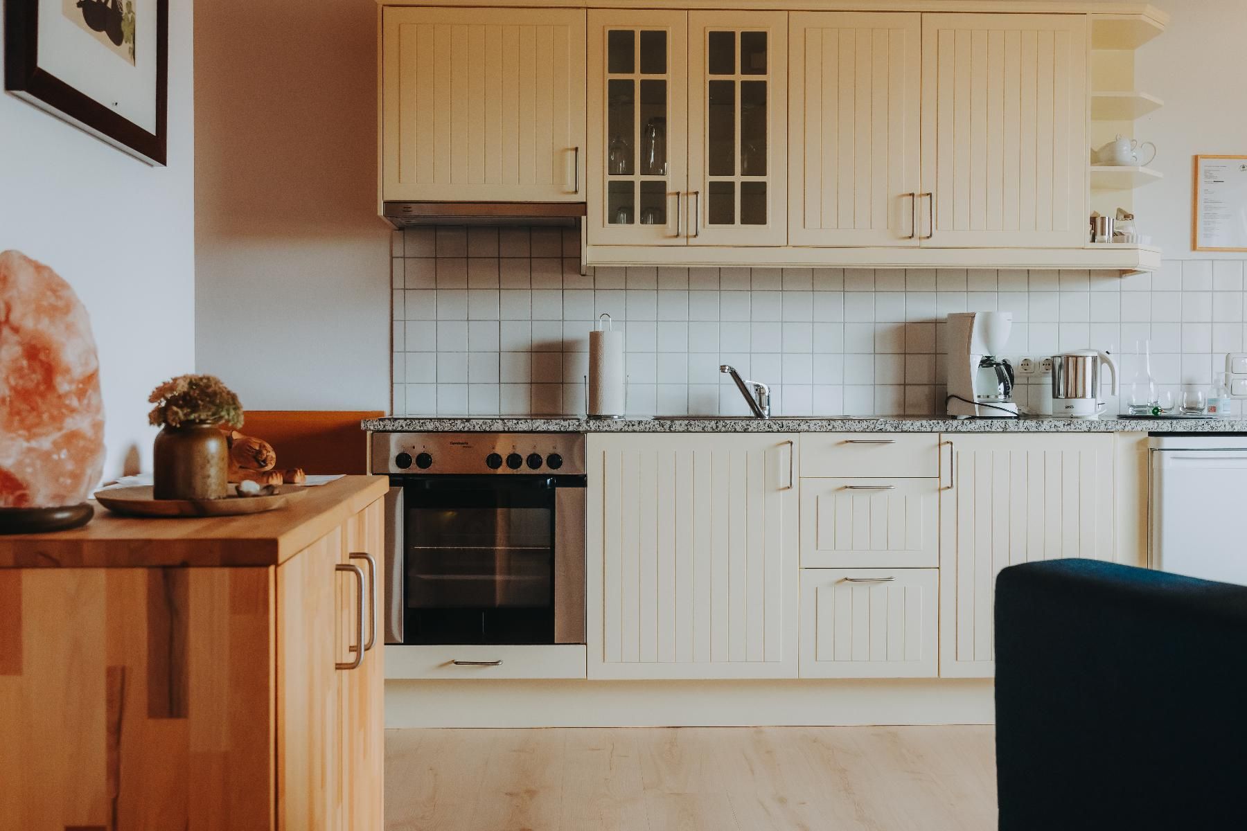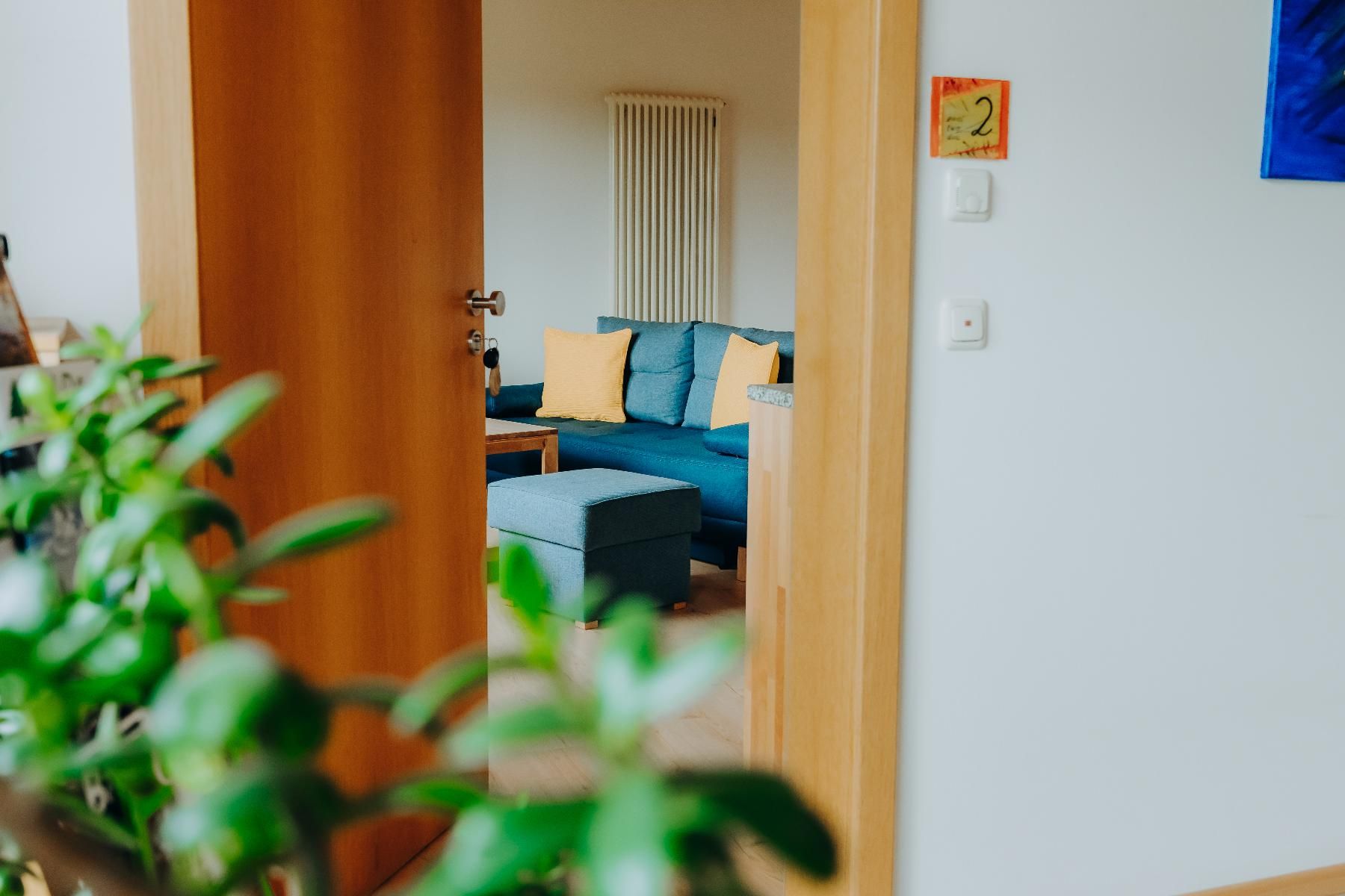 Ferienwohnung Nr. 2 im 1. Stock (42 qm) mit großen Balkon mit Liegestuhl und Sitzgruppe, und einem kleineren Balkon. Appartement ist open-plan gestaltet und hat hochwertigen Wineo- Bioboden. Voll ausgestattete Küchenzeile mit Wasserkocher und Filterkaffeemaschine. Schreinergefertigte Essecke.