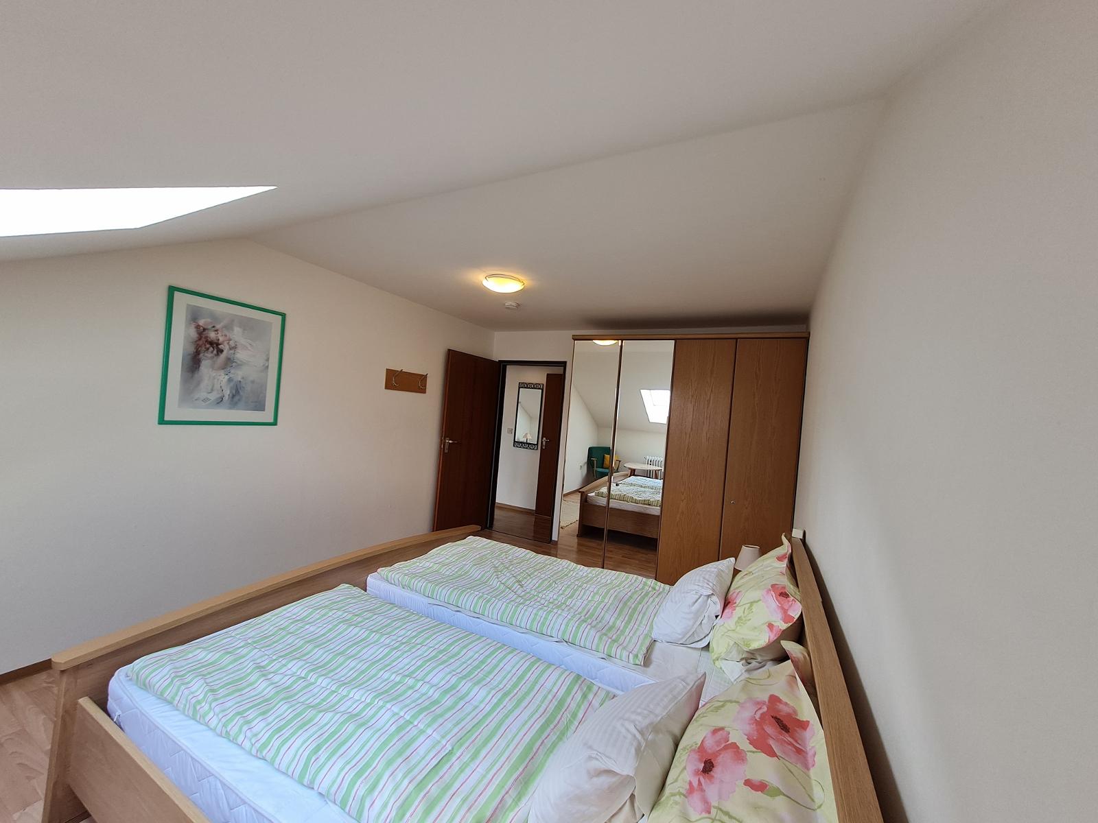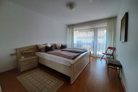 Das helle freundliche Schlafzimmer hat direkten Zugang zum Balkon wie auch das Wohnzimmer.