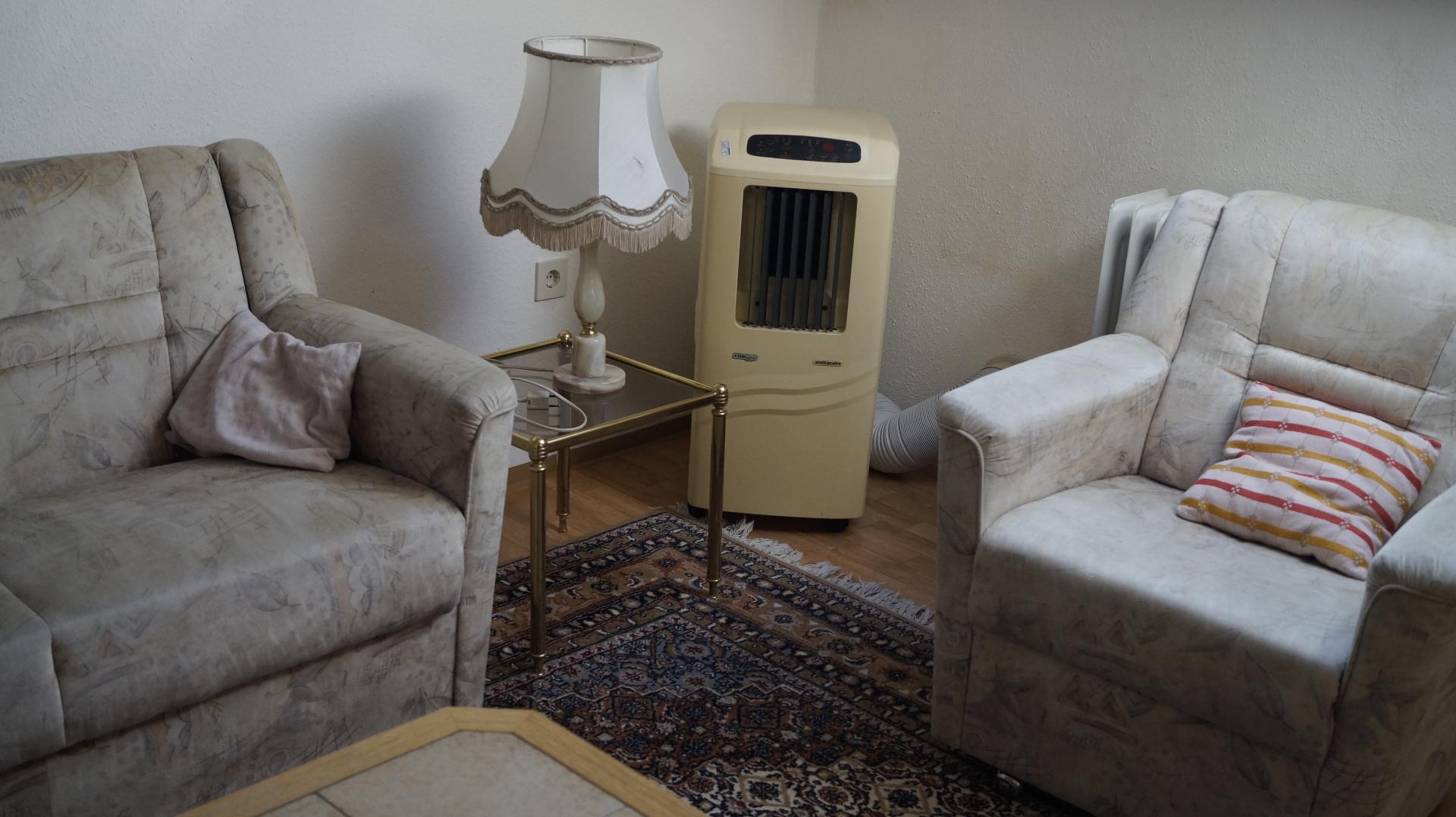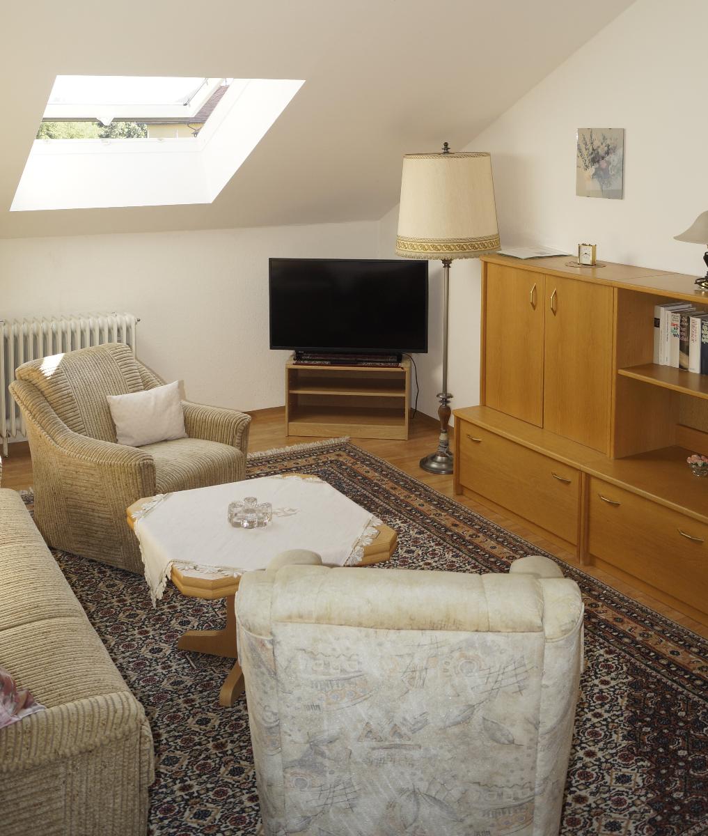 Im Wohnzimmer befindet sich eine Schlafcouch und ein Wandfernseher.