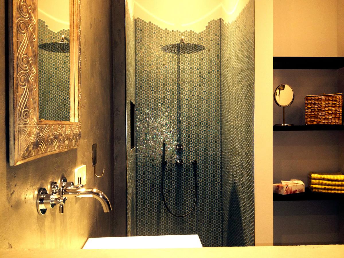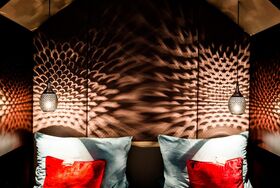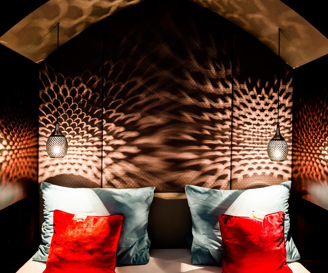 Schlafzimmer mit Boxspringbetten, Badezimmer mit schimmernden Sternfliesen und Regenschauerdusche, gemütlicher schicker Wohn- und Essbereich am großen Panoramafenster und voll ausgestattete Küche mit Kaffee und Tee inklusive; und private Outdoor-Sauna bei 2 Haustypen