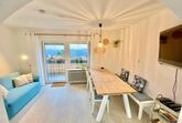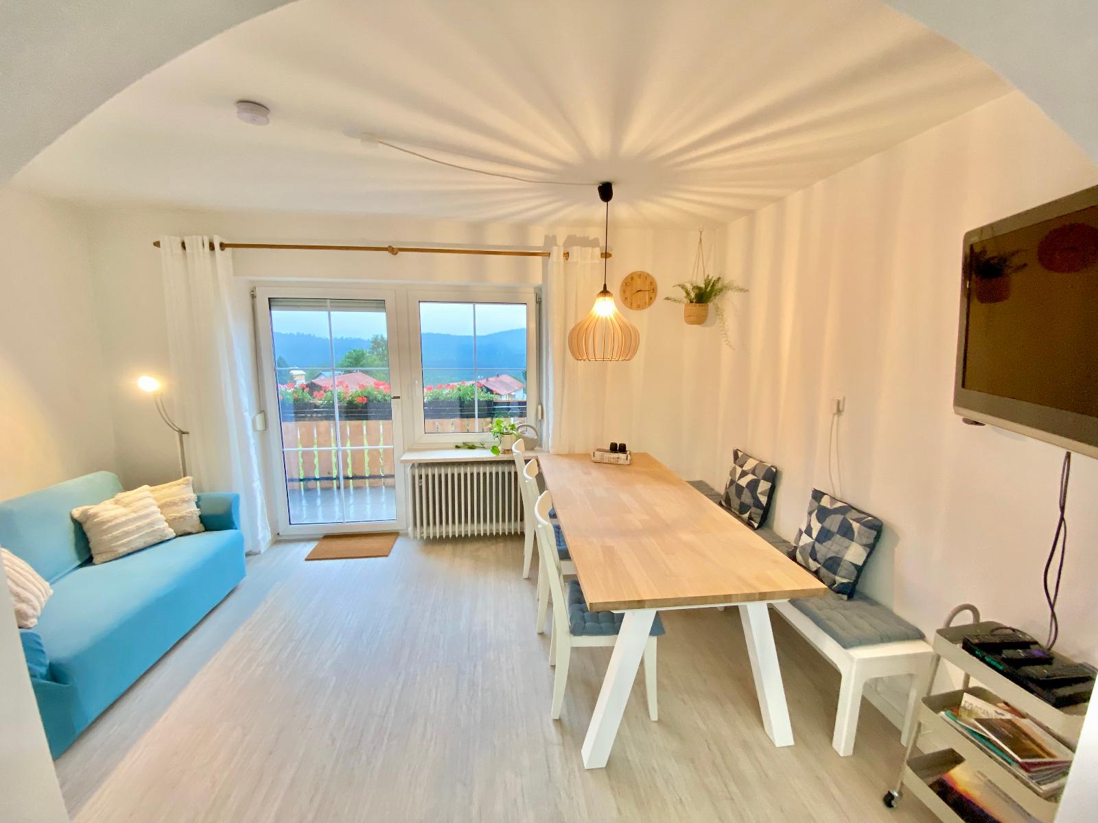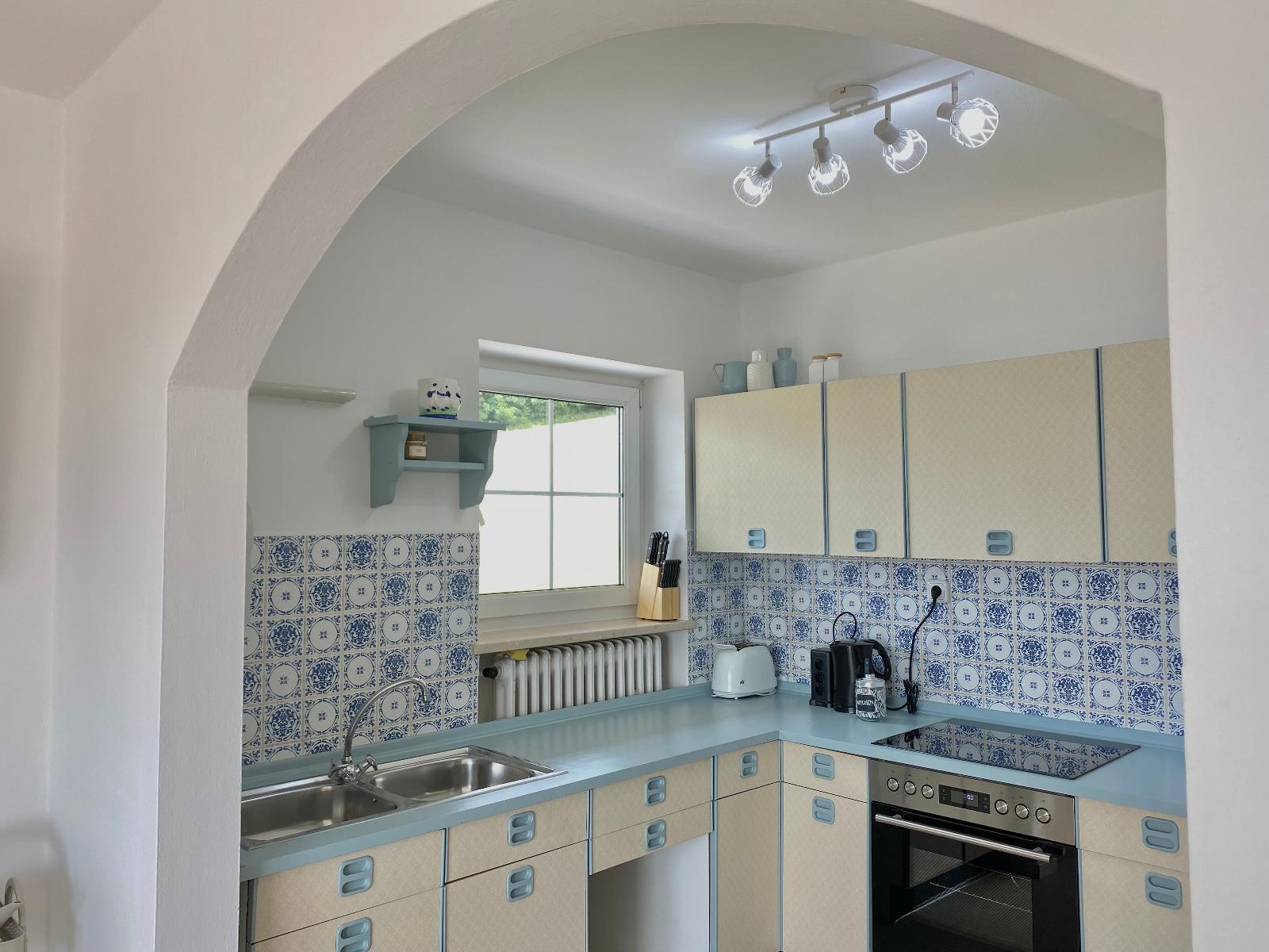 Die gut ausgestattete Wohnküche mit neuen Elektrogeräten und Spülmaschiene bietet einen Essbereich und eine Couch, sowie einen großen Fernseher. Der Zugang zum umlaufenden Balkon befindet sich ebenfalls hier.