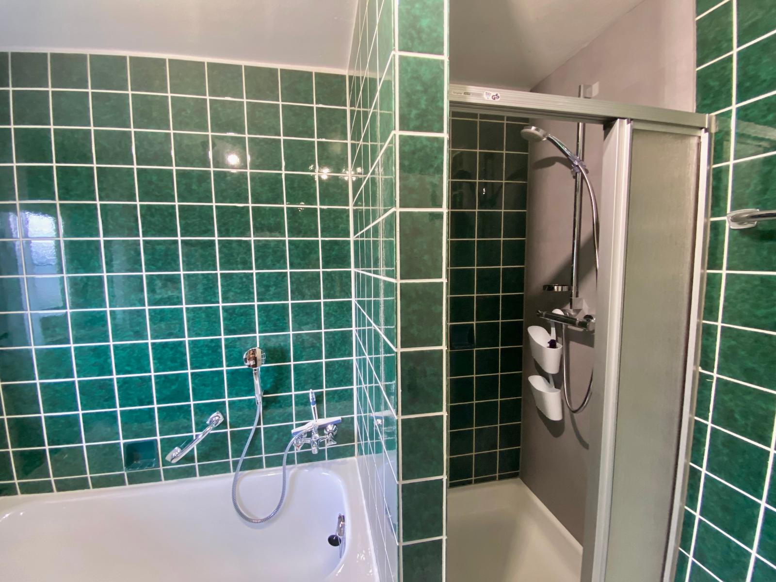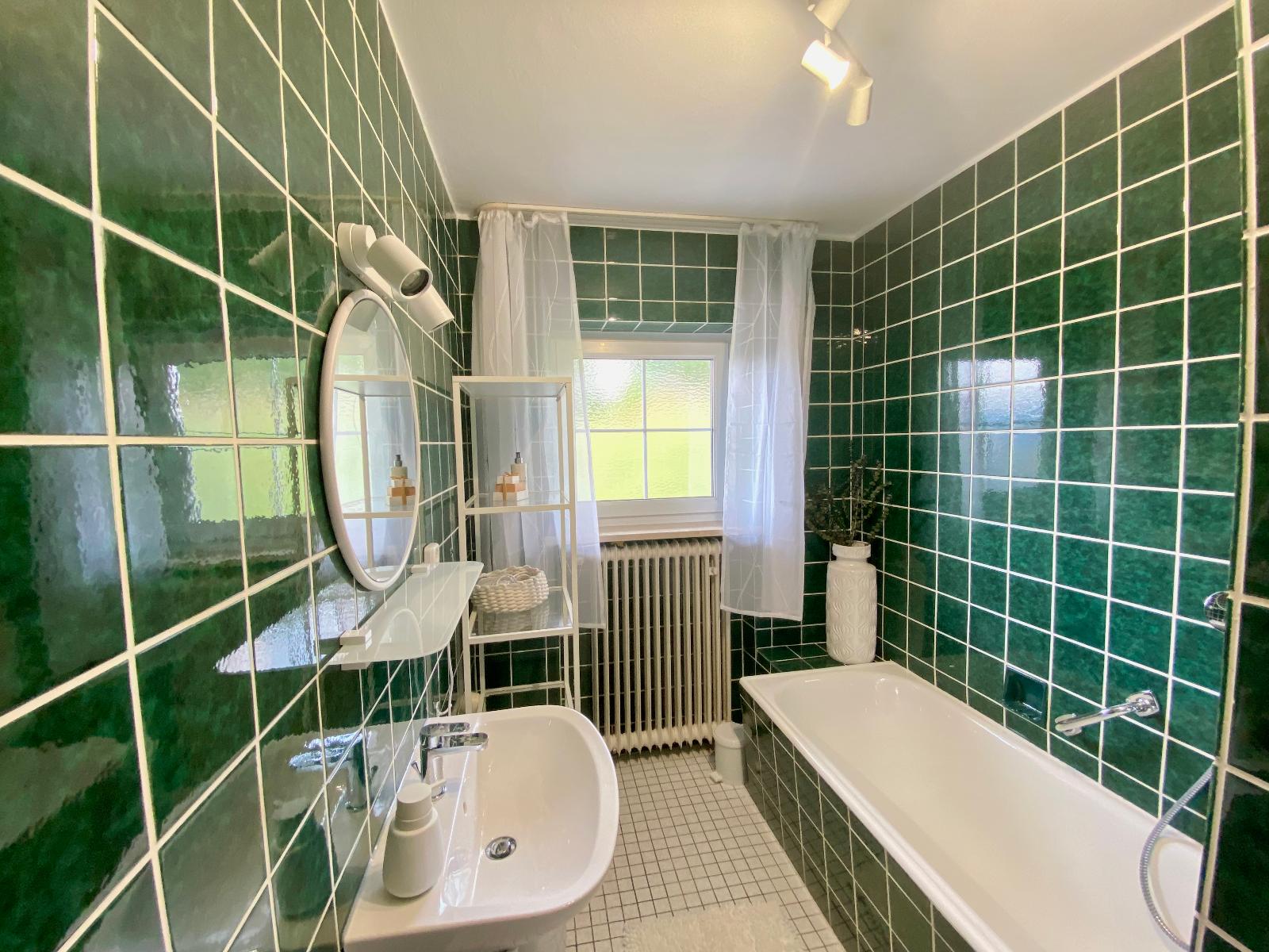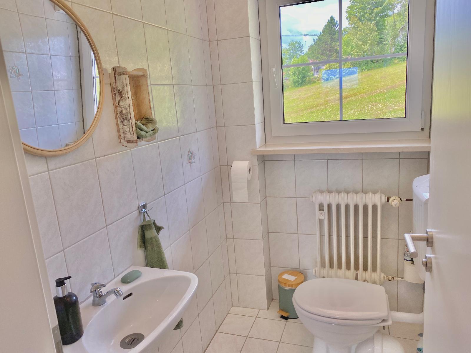 Das helle und gut belüftbare Badezimmer ist mit Wanne, Duschkabine, Waschbecken und Föhn ausgestattet. Die Toilette befindet sich in einem eigenen abschließbaren Raum und verfügt ebenfalls über Fenster und Waschbecken.