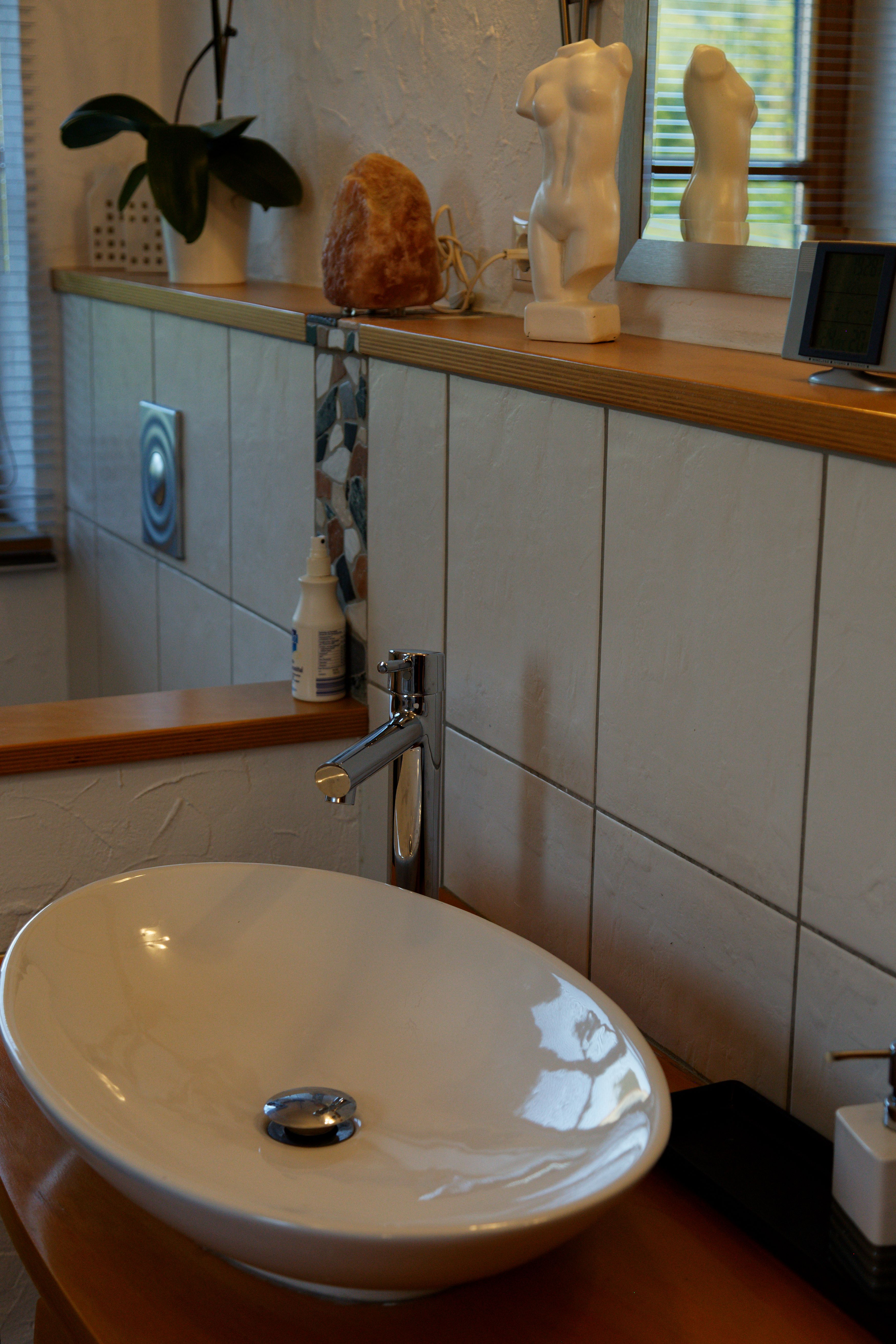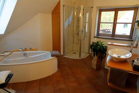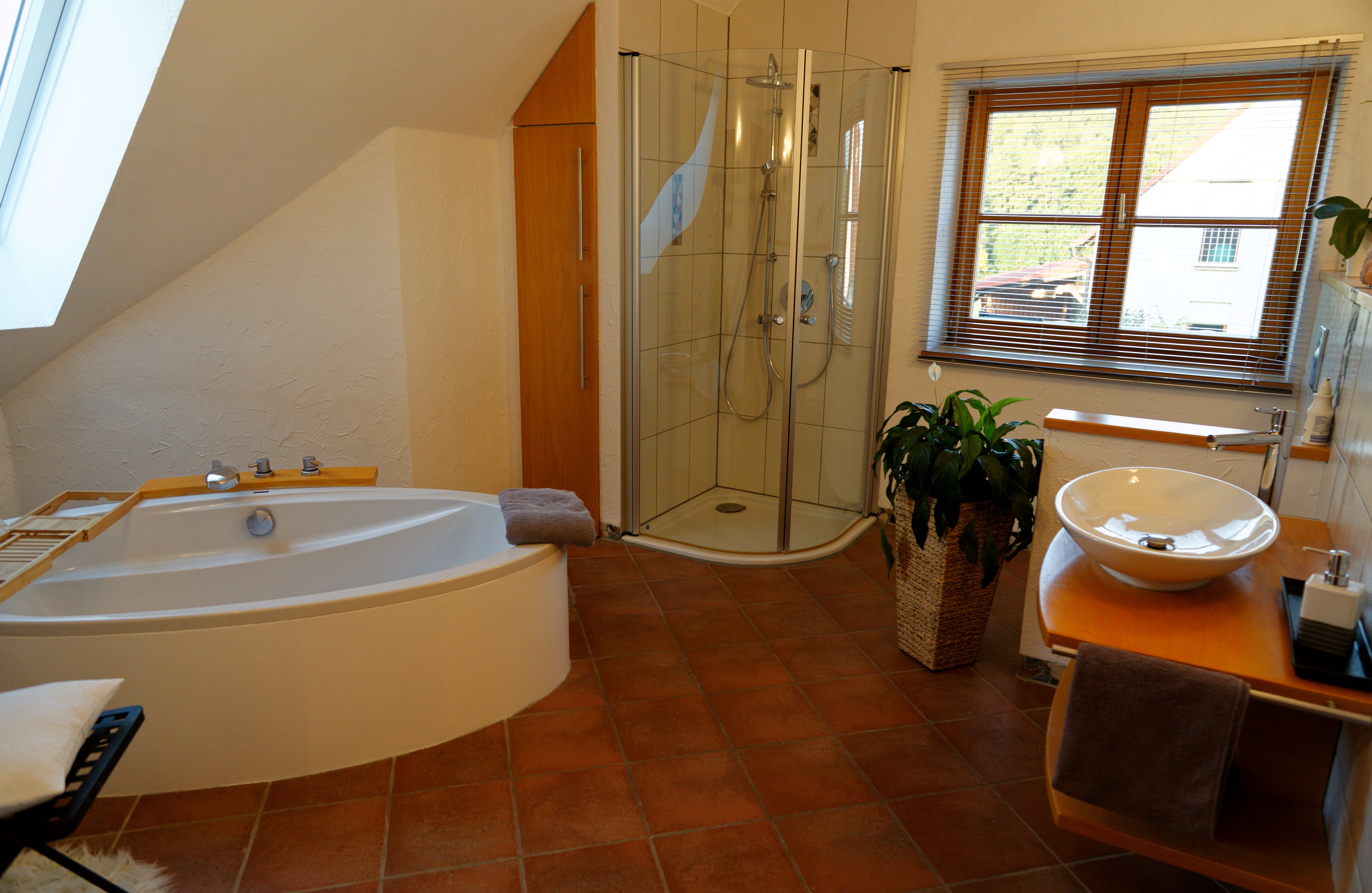 Das große Badezimmer mit freistehender Badewanne und Regendusche lässt keine Wünsche offen.