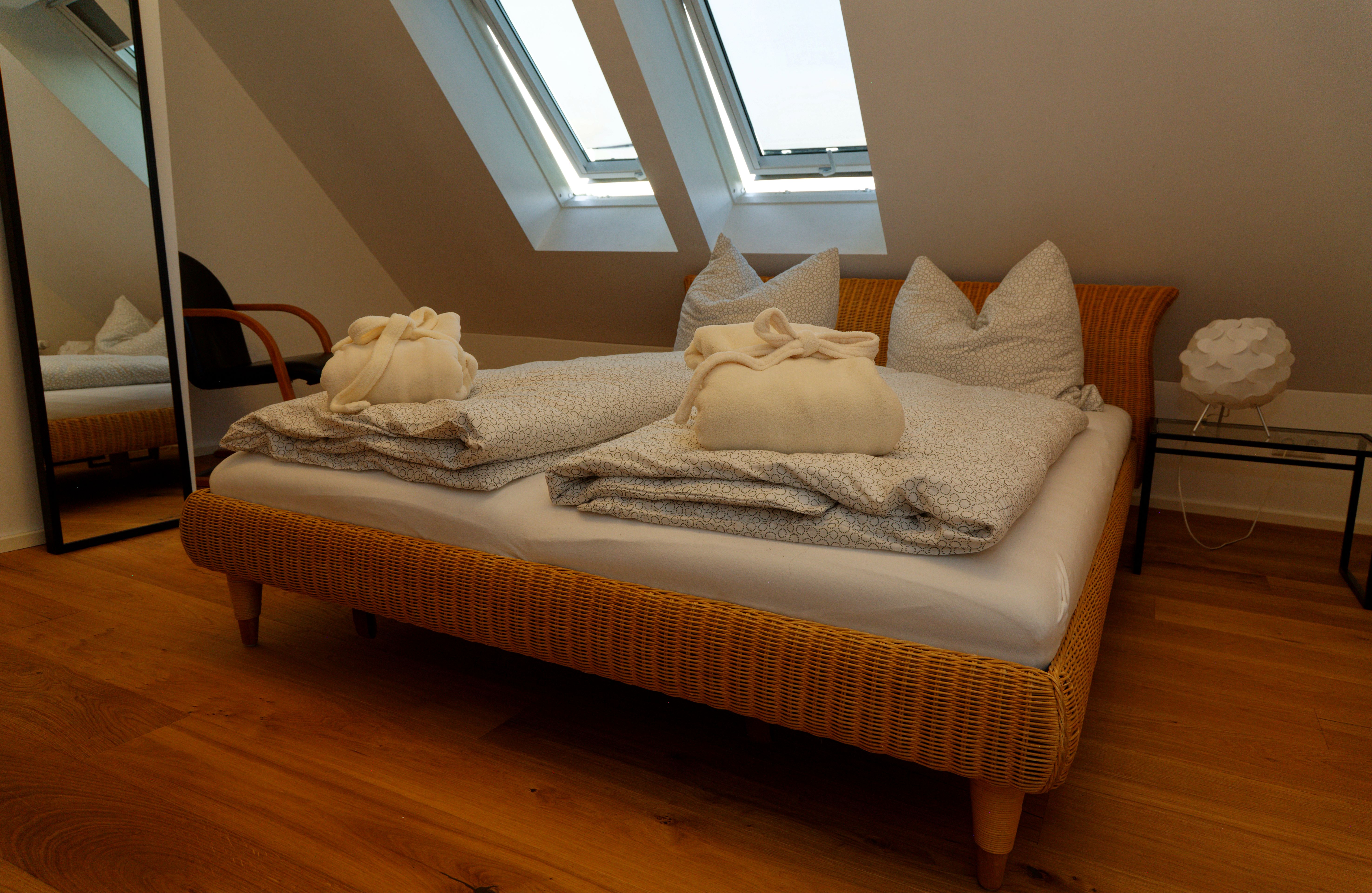 Zum Schlafbereich im Dachgeschoss gelangenSie über eine Holztreppe. Hier erwartet Sie ein bequemes Doppelbett mit Blick auf den Sternenhimmel durch die beiden großen Dachfenster.