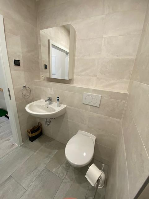 Bad mit Dusche und WC, Fön, Spiegelschrank