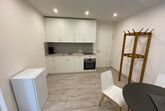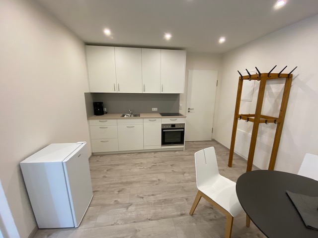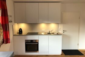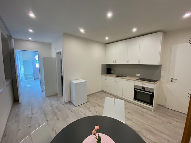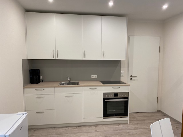 - gut ausgestattete Küchenzeile mit Backofen, Kochfeld, Dunstabzug, Spülmaschine, Kaffeemaschine, Kühlschrank, Geschirr, Töpfe, Besteck
