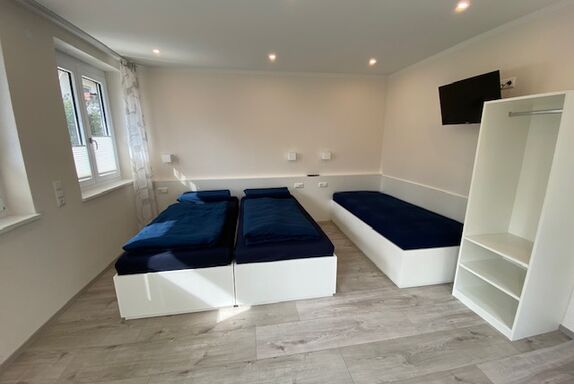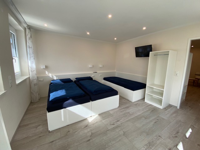 Wohn-/Schlafzimmer: ein Doppelbett mit der Möglichkeit zu zwei Einzelbetten und zusätzlich ein Einzelbett,