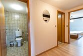 Das Badezimmer mit Glasduschkabine und einem Spiegel ergänzen sich perfekt zum separate Toilettenraum.