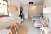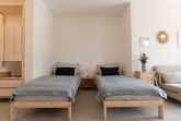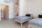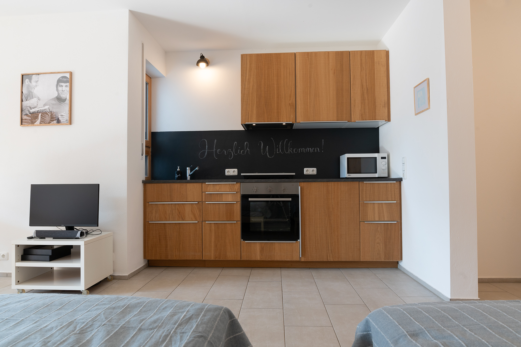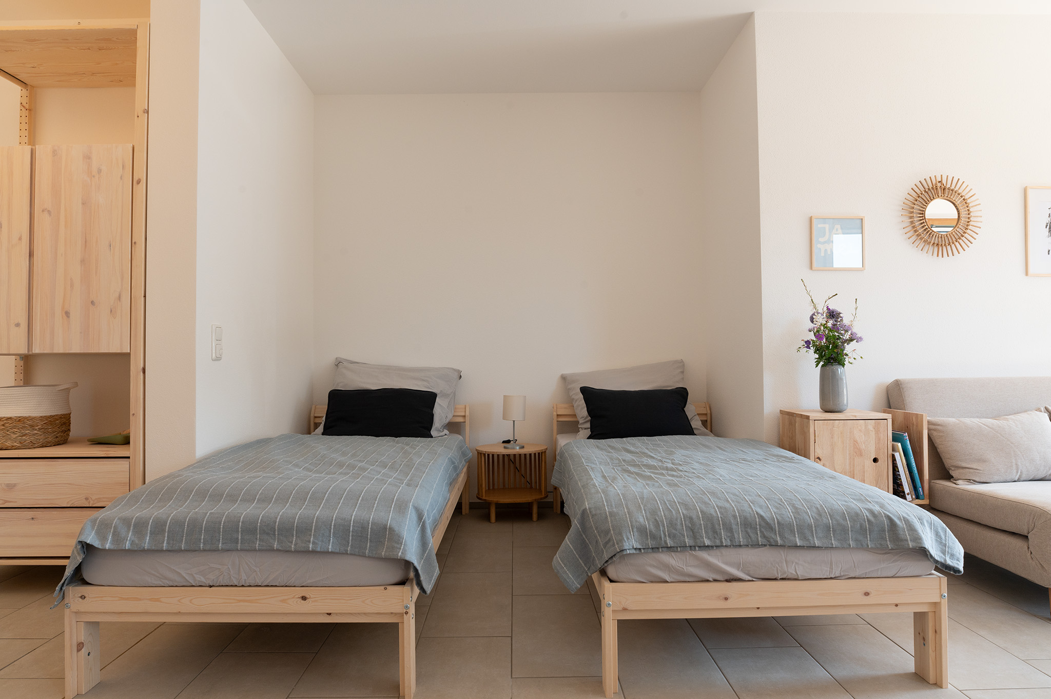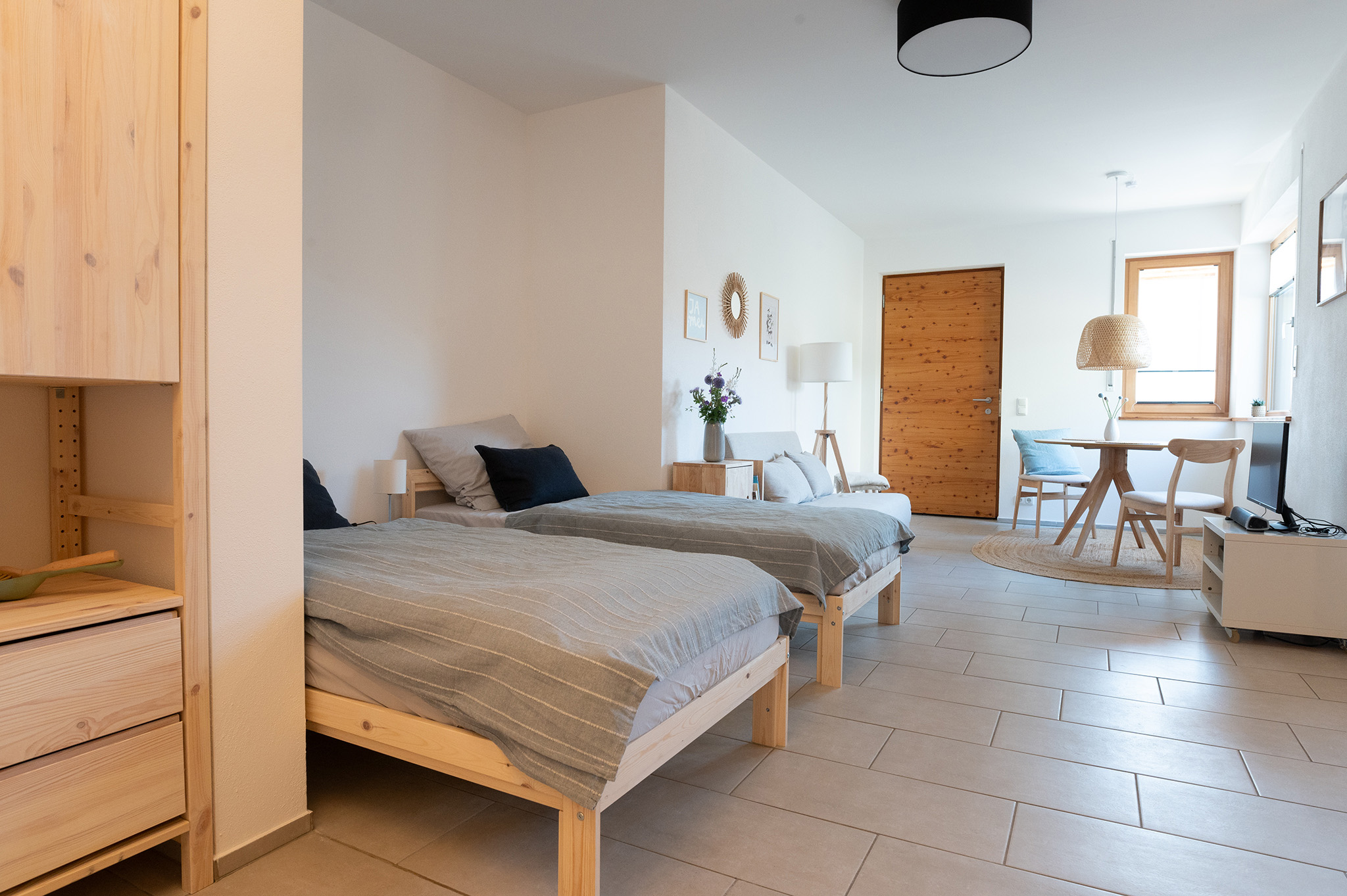 Die Wohnung verfügt über einen separaten Eingang mit eigener Haustüre. Der geräumige Wohn-und Schlafbereich bietet eine gemütliche Essecke mit schönen Einblicken in den Garten. Auf dem Sofa können Sie in der für Sie bereit gestellten Literatur schmökern oder vor dem Fernseher den Abend ausklingen lassen. Selbstverständlich haben Sie in der Wohnung und im Garten WLAN-Zugang. Die beiden Einzelbetten können auf Wunsch zusammengeschoben werden. In der Küchenzeile finden Sie ein separates Induktionskochfeld, Backofen, French Press, Kühlschrank mit Gefrierfach, Mikrowelle und allerhand Koch-und Essgeschirr.