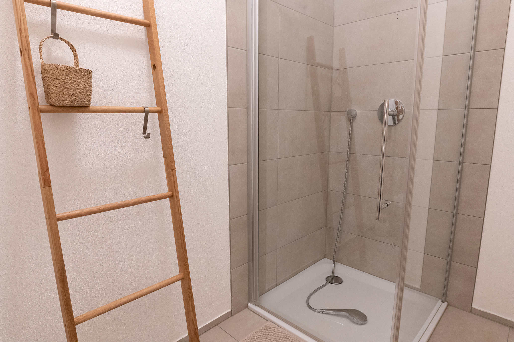 Im hinteren Bereich der Wohnung befindet sich ein kleiner Ankleidebereich mit Standspiegel. Das funktionale Badezimmer verfügt über Dusche, WC und Waschbecken.