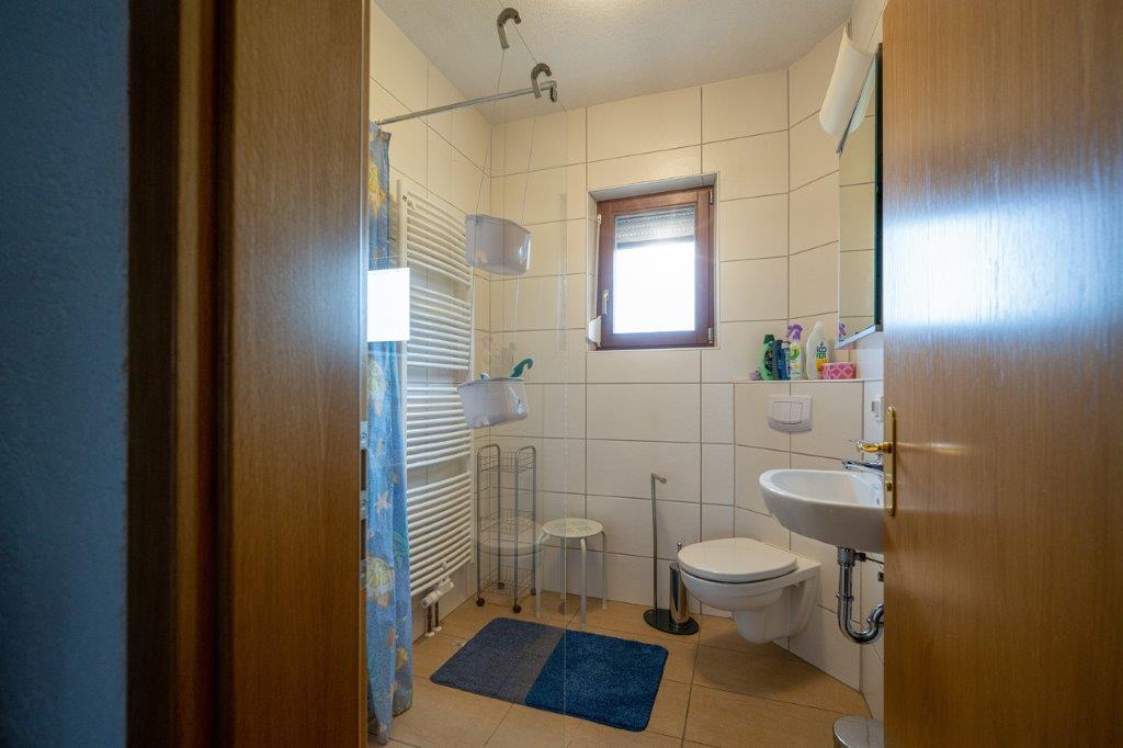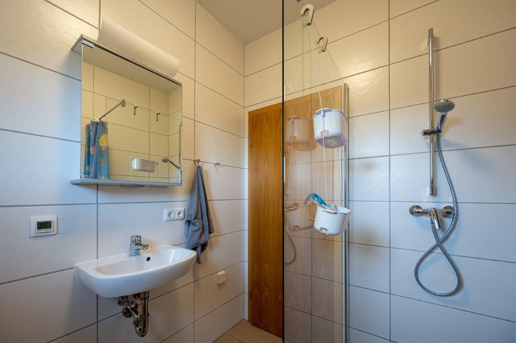 Das Bad hat eine ebenerdige Dusche, Waschbecken und WC.