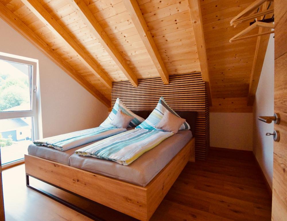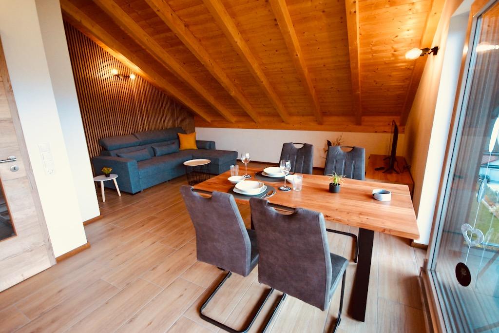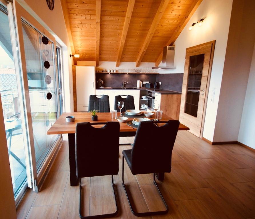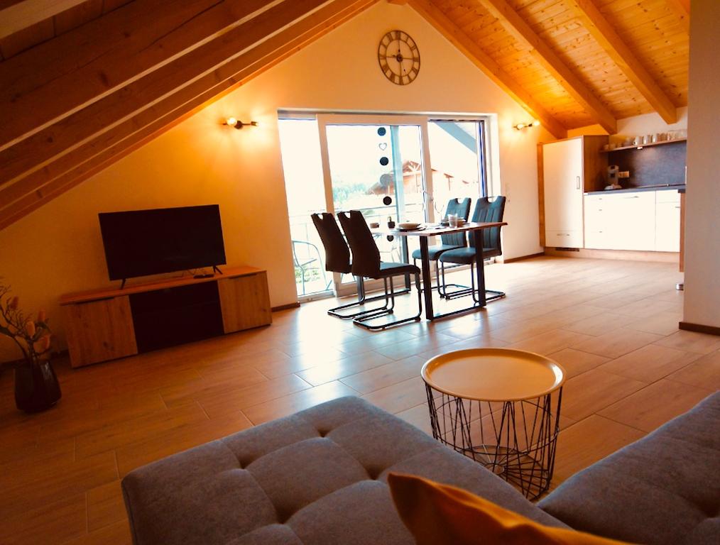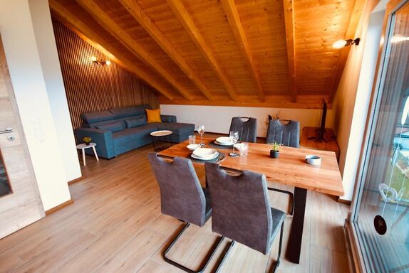 Unsere Dachgeschoss Wohnung Geißkopf umfasst ca 74qm und besticht durch den Sichtdachstuhl, die liebevolle Ausstattung und Dekoration.