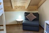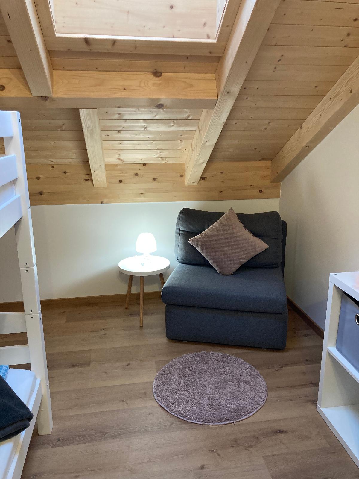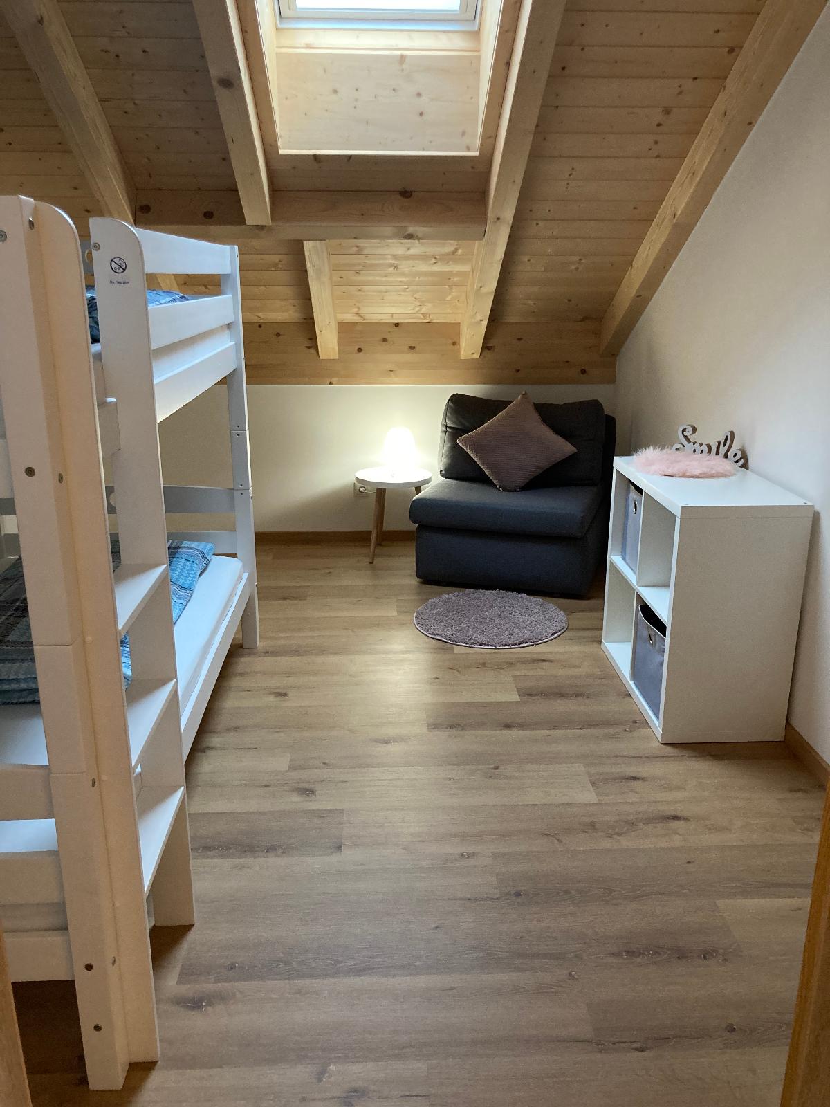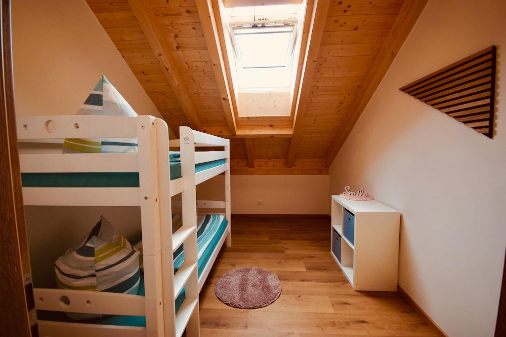 Das Kinderzimmer ist mit einem Etagenbett, Ablagefächer und einem elektrischem Dachfenster ausgestattet. Außerdem kann auf einem Schlafsessel ein drittes kleineres Kind problemlos im Zimmer übernachten.