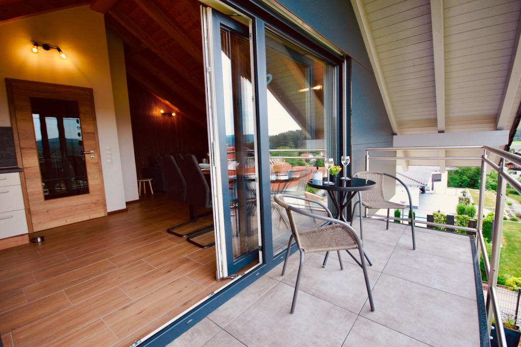 Essen und Trinken vor einer großen Glasschiebetür mit Zugang zum kleinen Süd Balkon mit einer schönen Aussicht.