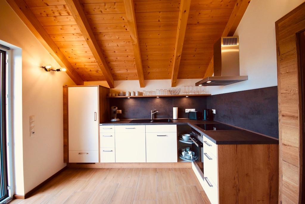 Helle, moderne Wohnküche, gut ausgestattete Küche mit Cerankochfeld, Backofen, Geschirrspüler, Senseo Padmaschine, Toaster, Wasserkocher, Eierkocher, einem Kühlschrank mit Gefrierfach.