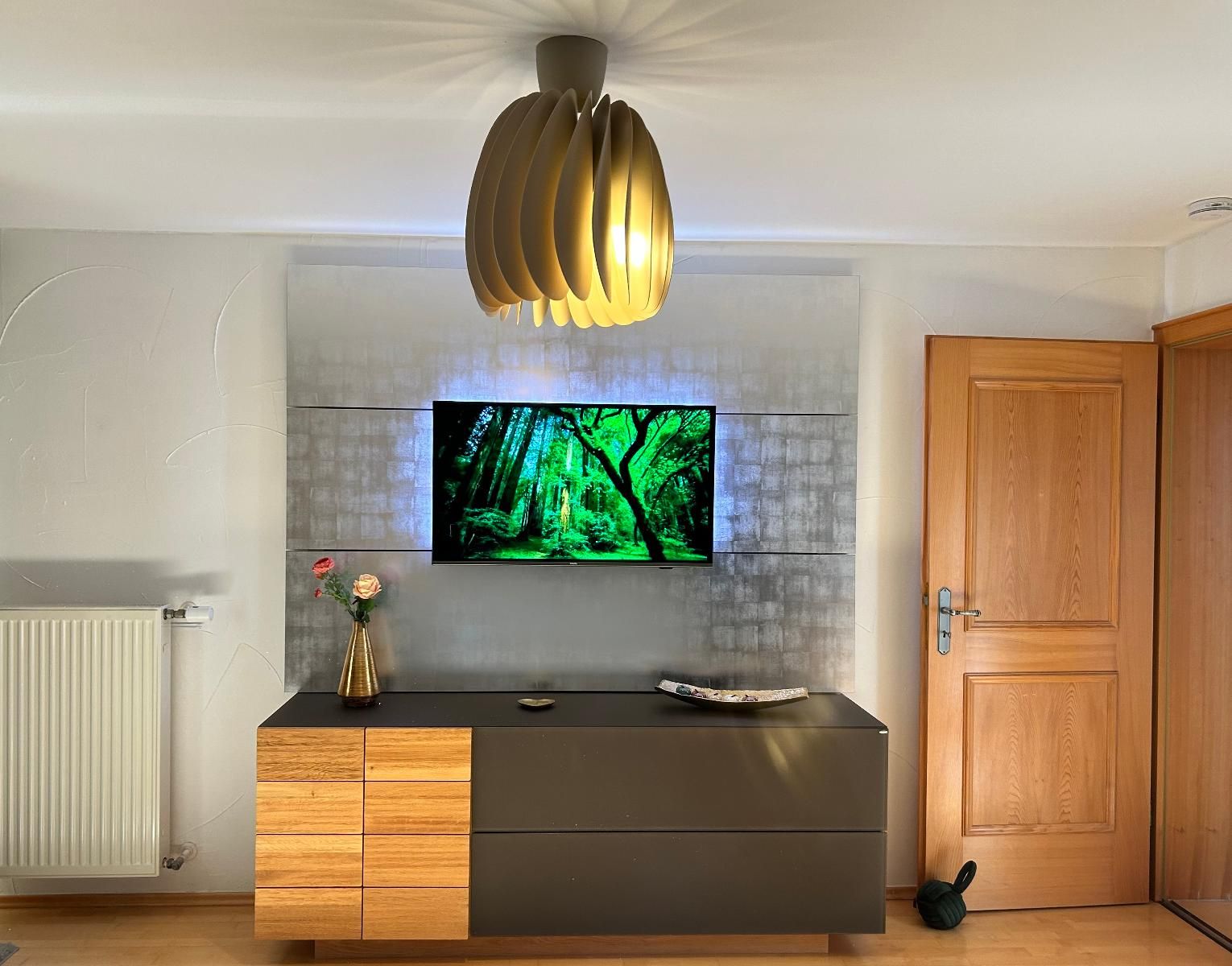 Schlafzimmer 1: Boxspringbett, elektrischen Lattenrost, Tempur-Matratzen, Ambilight-TV und Voglauer-Schränken.