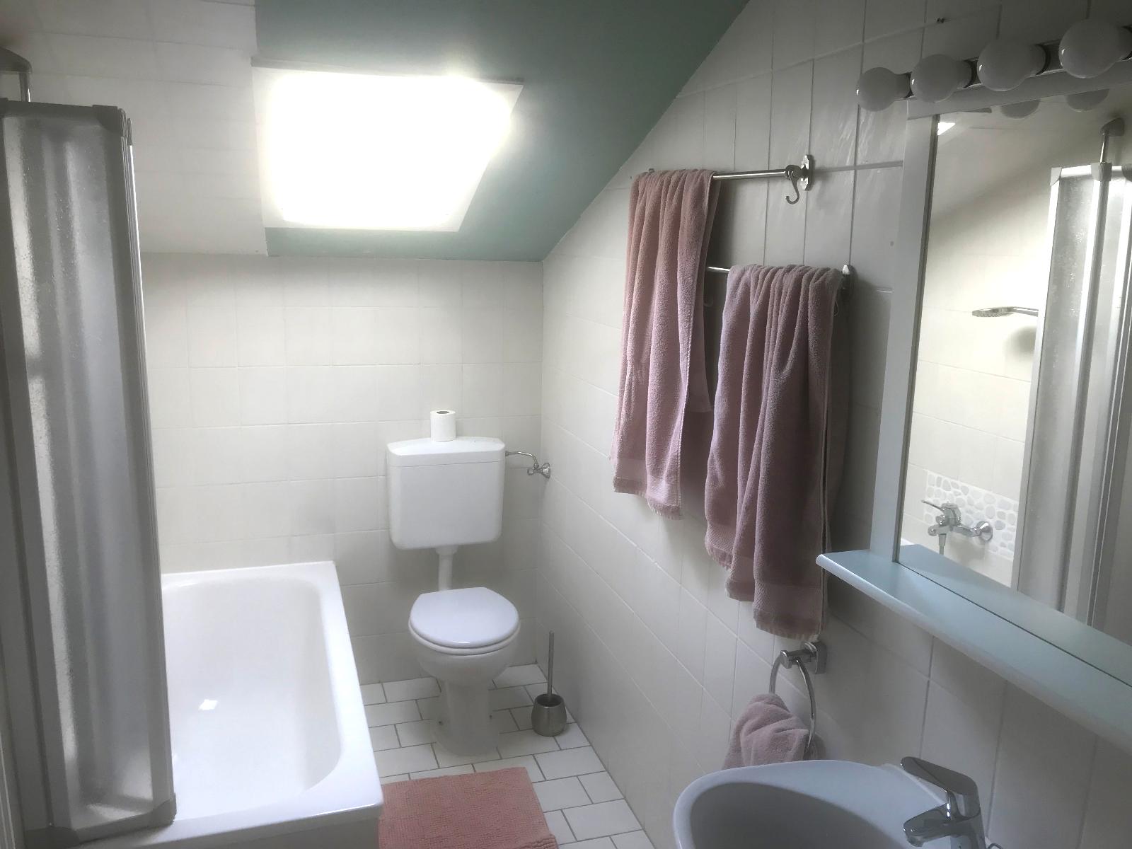 Badewanne, WC, Waschtisch und Waschmaschine. Die Nutzung von