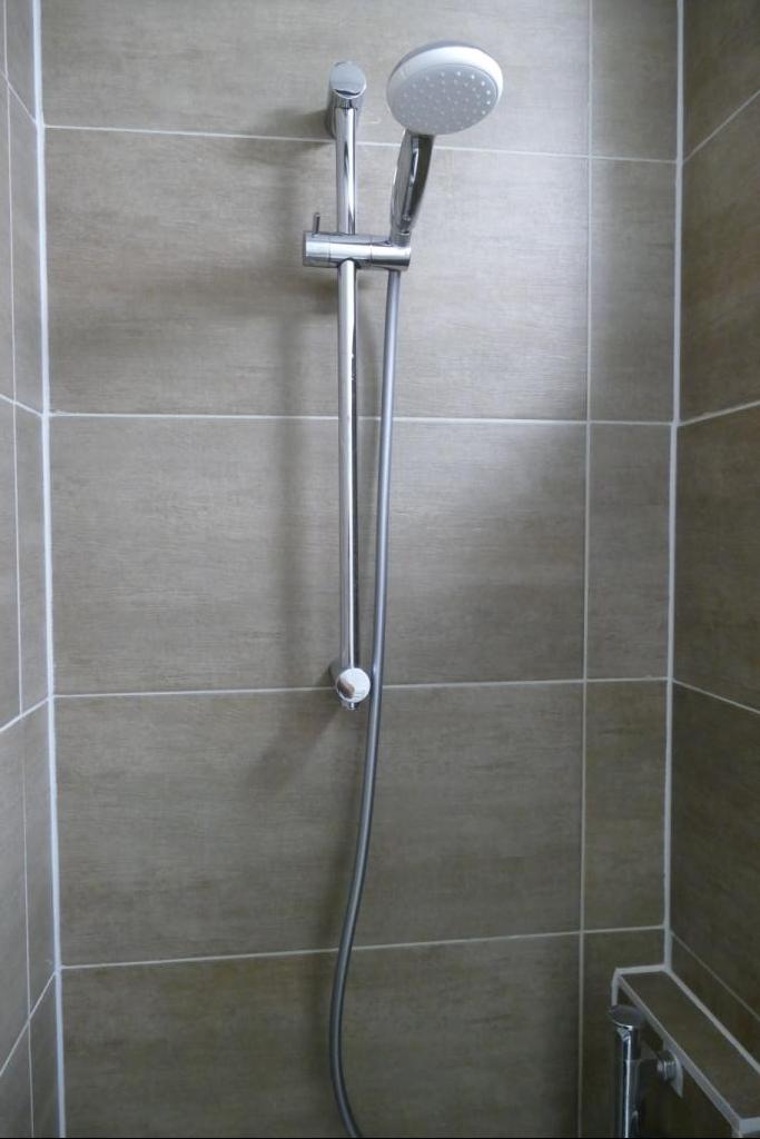 Das moderne Badezimmer verfügt über Dusche/WC, Föhn, Spiegel.