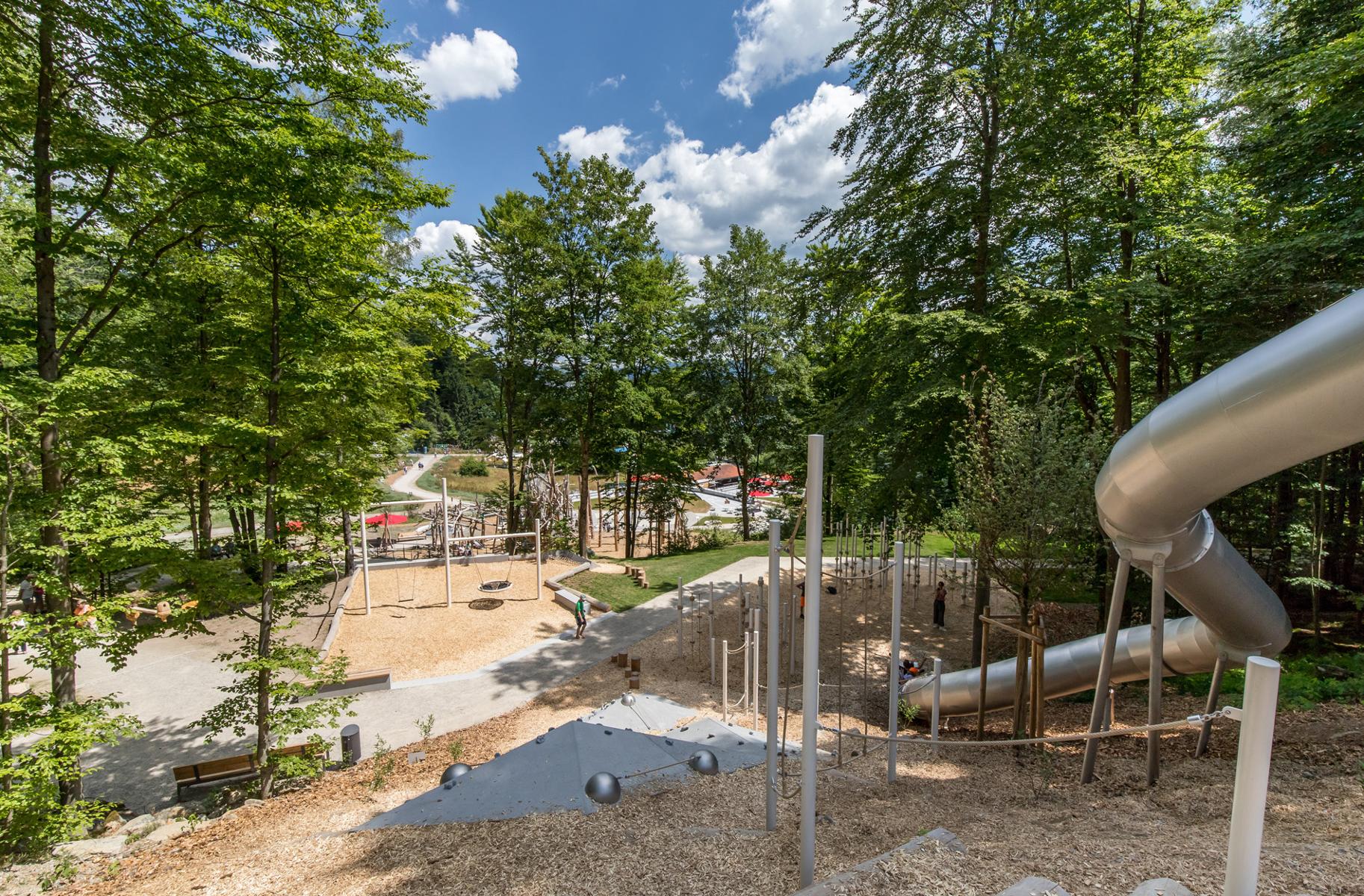 Direkt neben der Ferienanlage befindet sich ein großer Kletterspielplatz mit einzigartiger Kletterwolke und ein Bewegungsparcours.