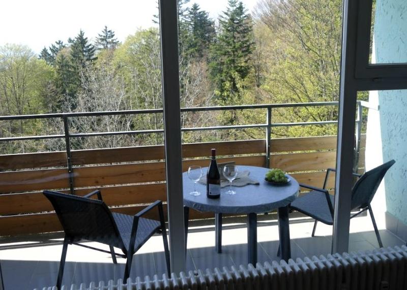 Die in der obersten Etage von Haus N im Ferienpark Geyersberg gelegene Appartement bietet einen atemberaubenden Ausblick auf die Mittelgebirgslandschaft des Bayerischen Waldes.