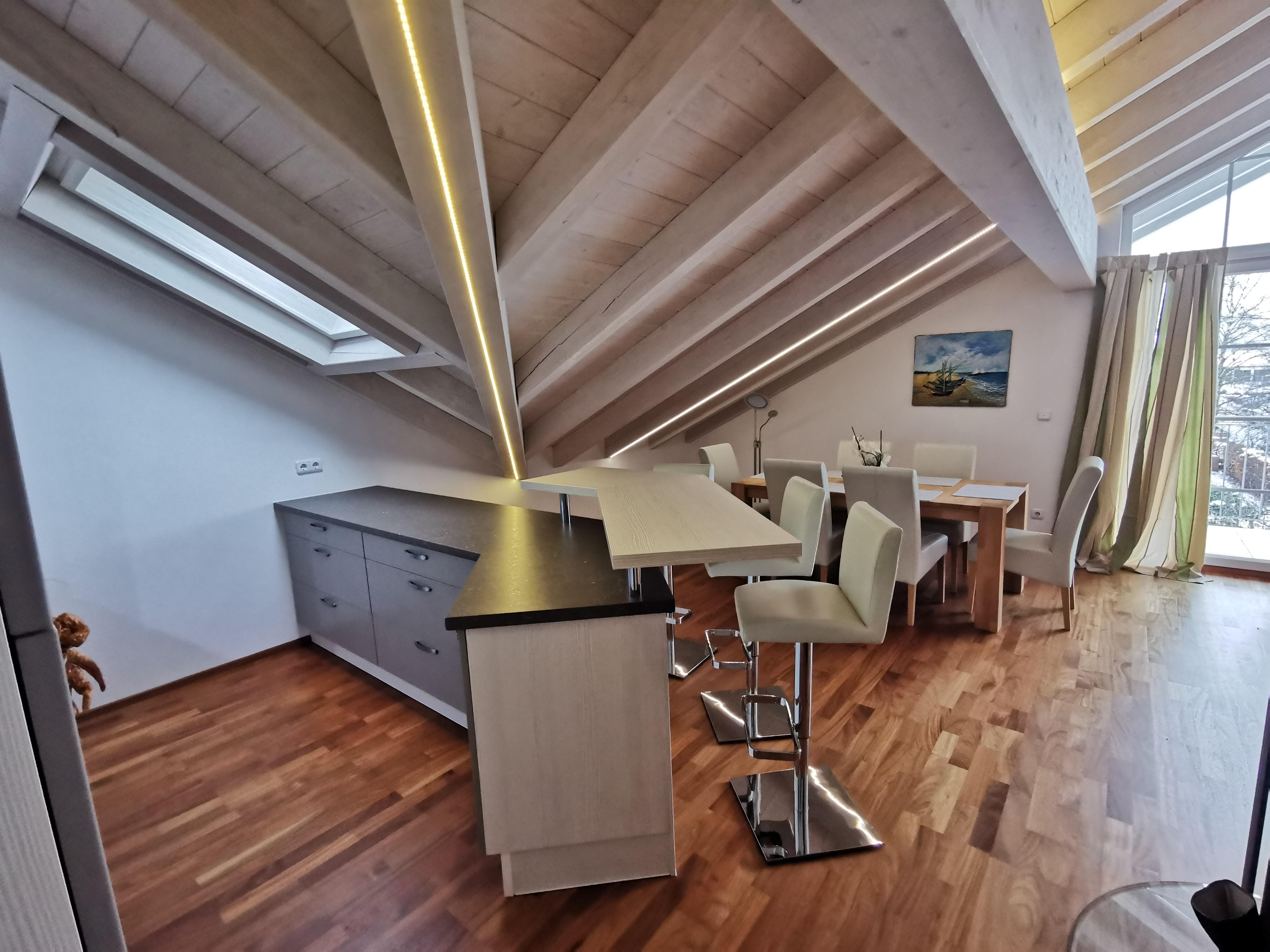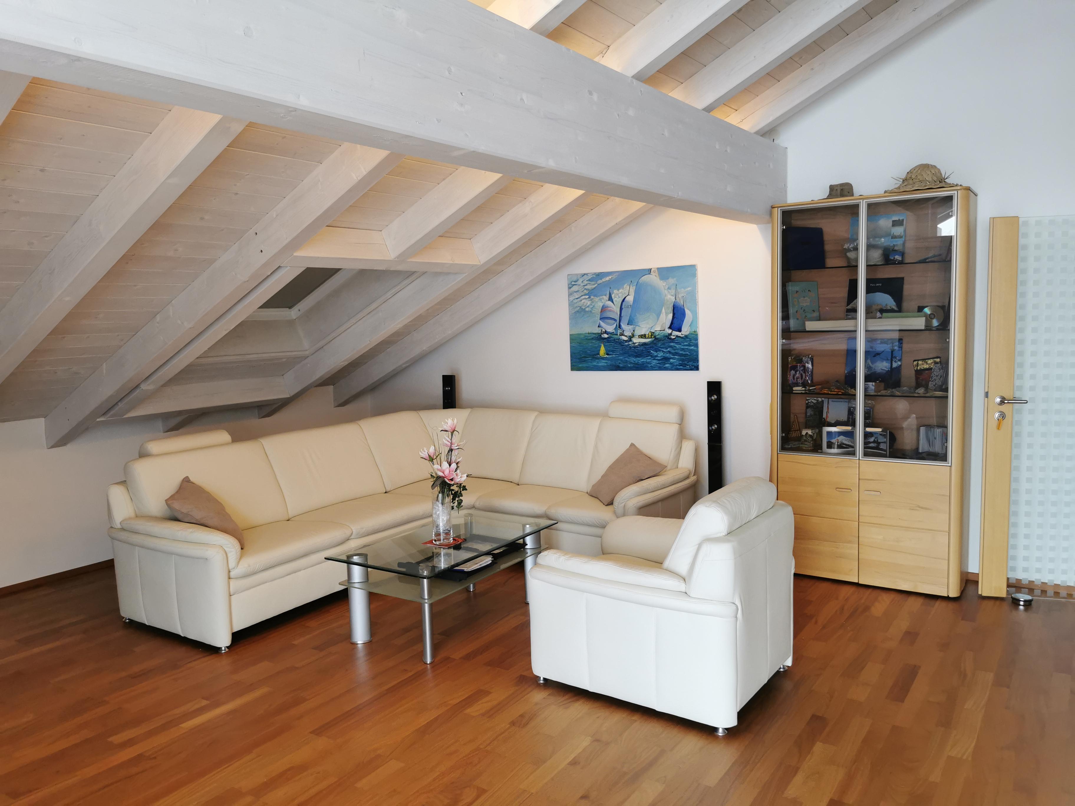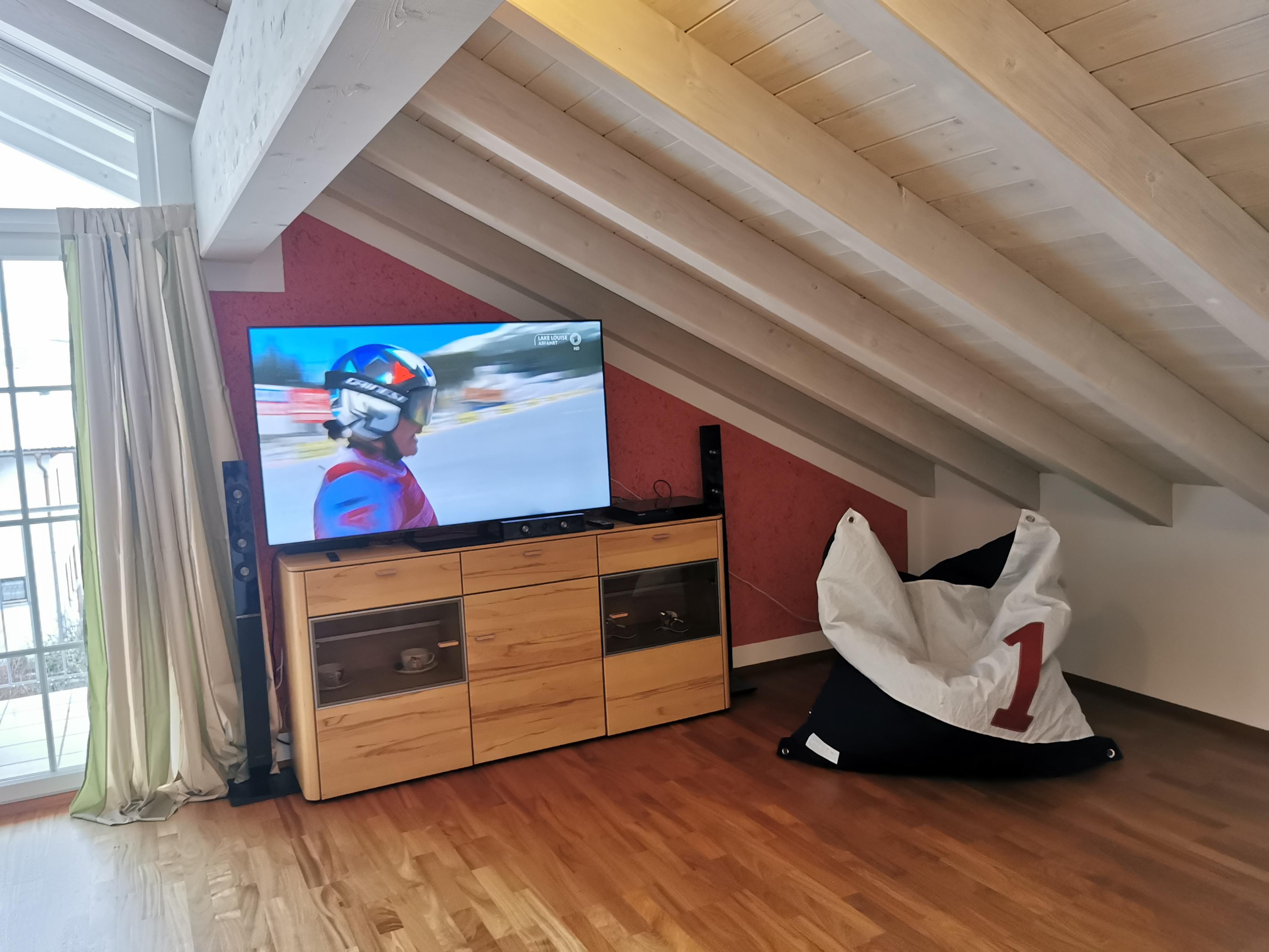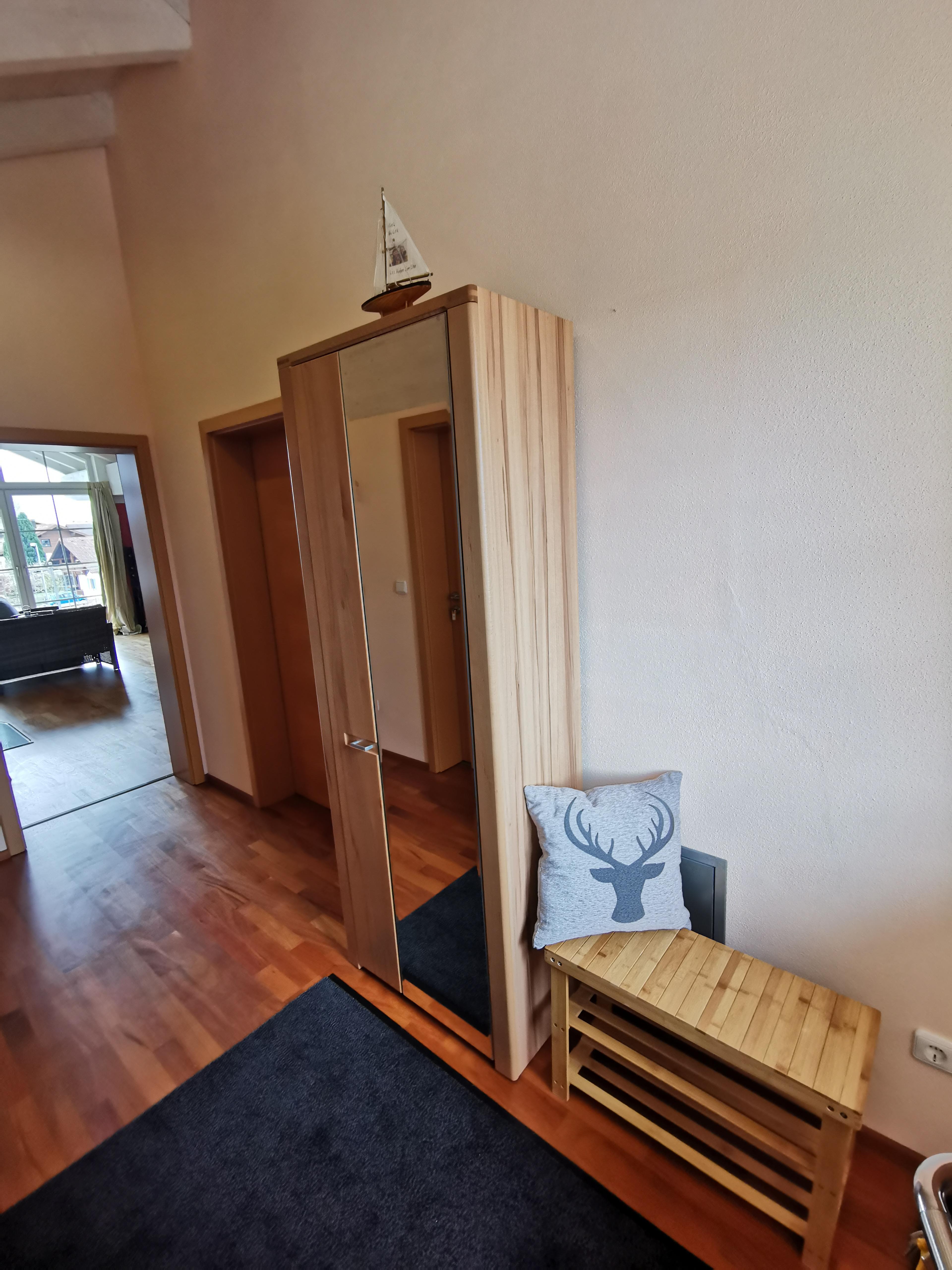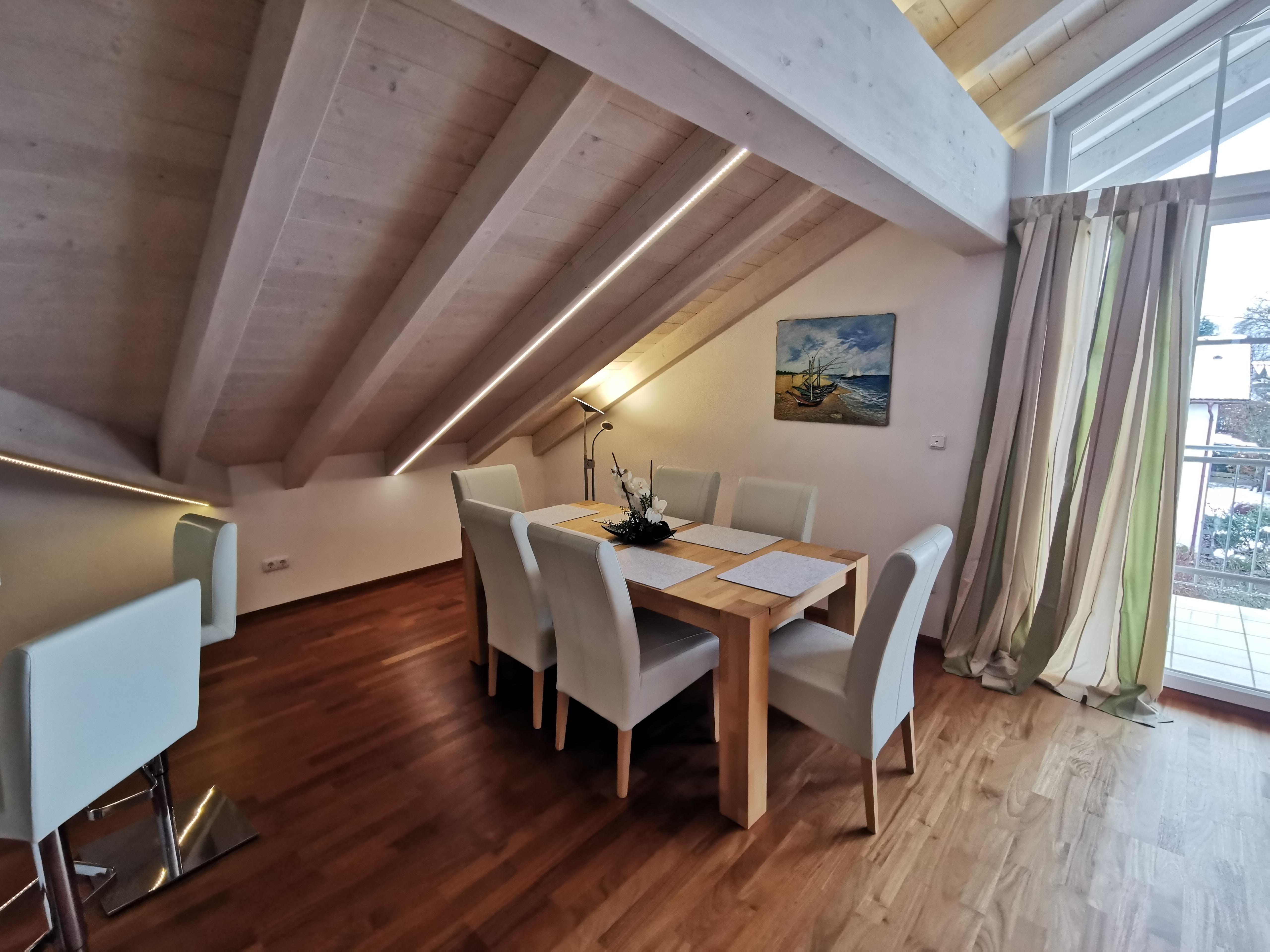 Ruhige Ferienwohnung mit gemütlichem Wohnzimmer. Wohnzimmer mit 65 Zoll LED-Fernseher. Komplett ausgestattete Küche mit Spülmaschine. Ein Schlafzimmer das mit Doppelbett/ komfort-Matratzen und Allergiker-Betten ausgestattet ist. Geölter Parkettboden mit Fußbodenheizung. Bad mit Eckbadewanne und separater Regenwalddusche, WC. Südbalkon mit Bergblick und Sitzgelegenheit. Stellplatz, kostenfreier Internetanschluss 100MBit/s.