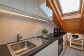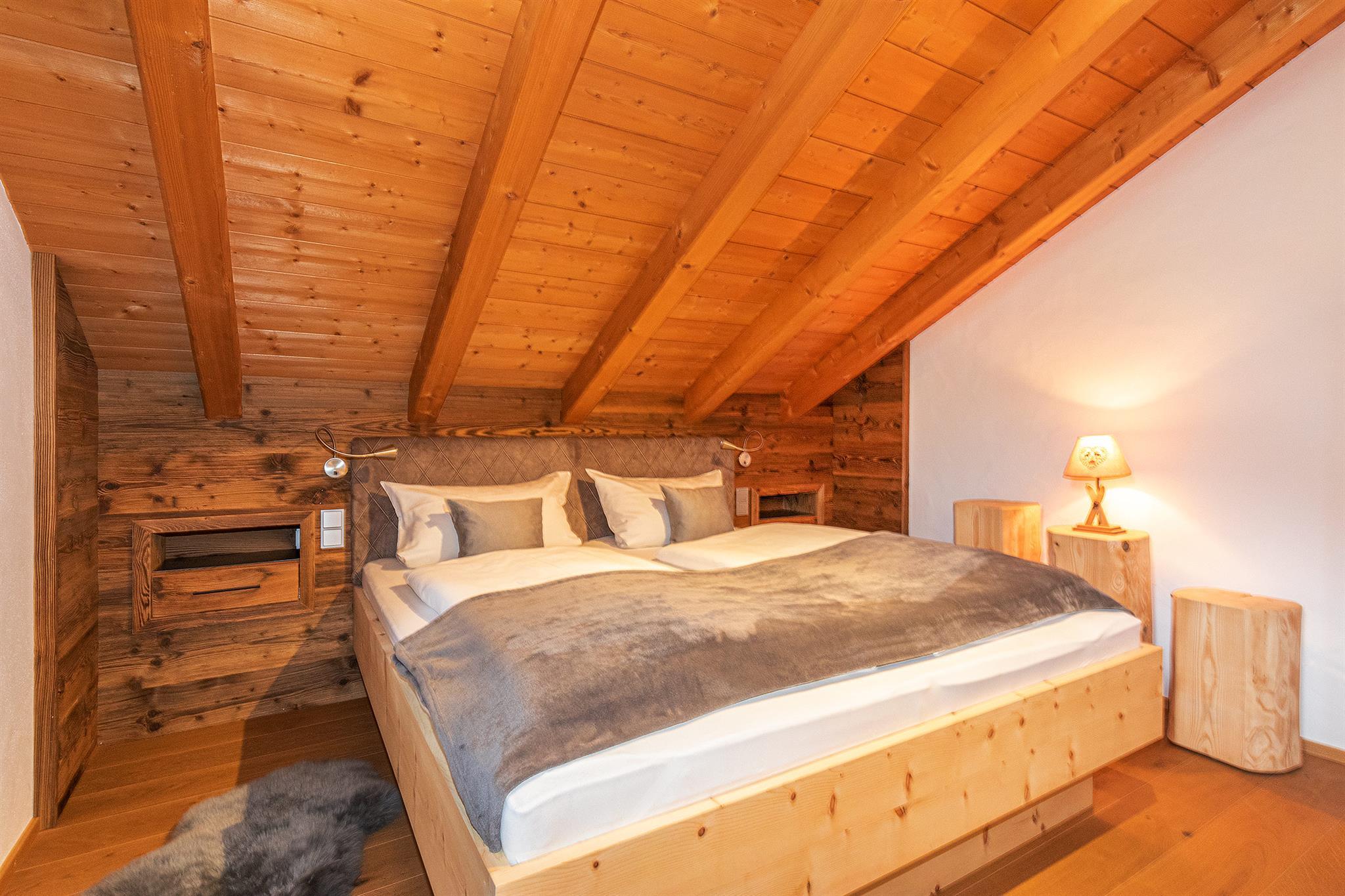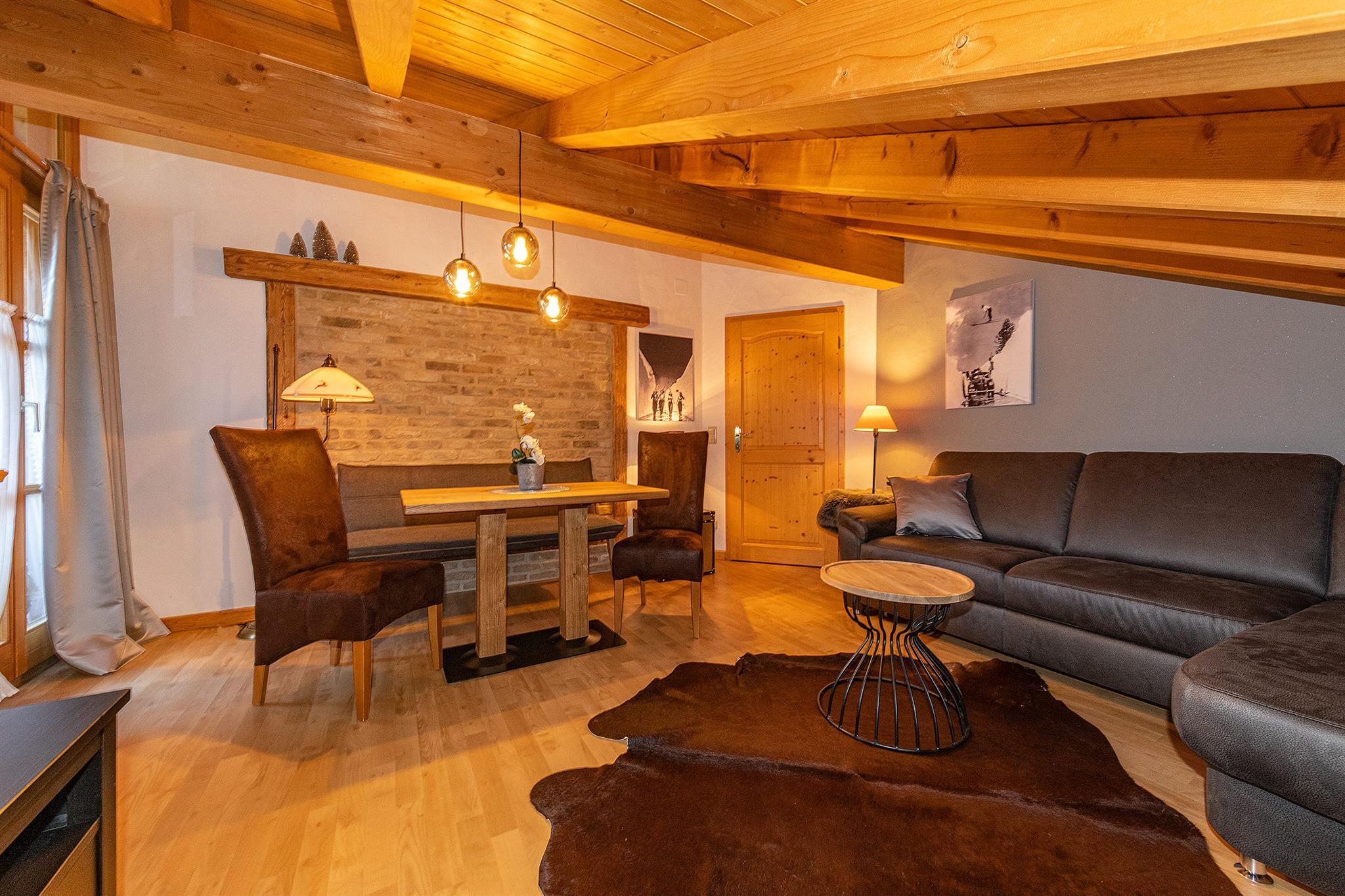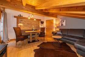 Alpiner Wohnbereich unter offenem Holzdachstuhl - liebevoll eingerichtetes Wohnzimmer mit Couchgarnitur und gemütlicher Essecke, Kabel-TV (Flachbild), Radio-CD-Player - behagliches Naturholzschlafzimmer aus Zirbenholz mit Doppelbett und Ganzkörperspiegel - komplett ausgestattete Küche mit Cerankochfeld, Backofen, Kühlschrank mit Gefrierfach, Spülmaschine, Microwelle, Toaster, Wasserkocher und Kaffeemaschine - Bad mit Dusche/WC, Haarföhn und Kosmetikspiegel - Naturholzmöbel und hygienische Fußböden mit Fußbodenheizung - möblierter Westbalkon - Sonne bis spät abends -