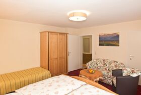 Doppelzimmer mit Dusche/WC, Dreibettzimmer auch als Doppelzimmer möglich. Alle Gästezimmer mit Frühstück bzw. die Ferienwohnungen ohne Frühstück. Parkplätze am Haus.