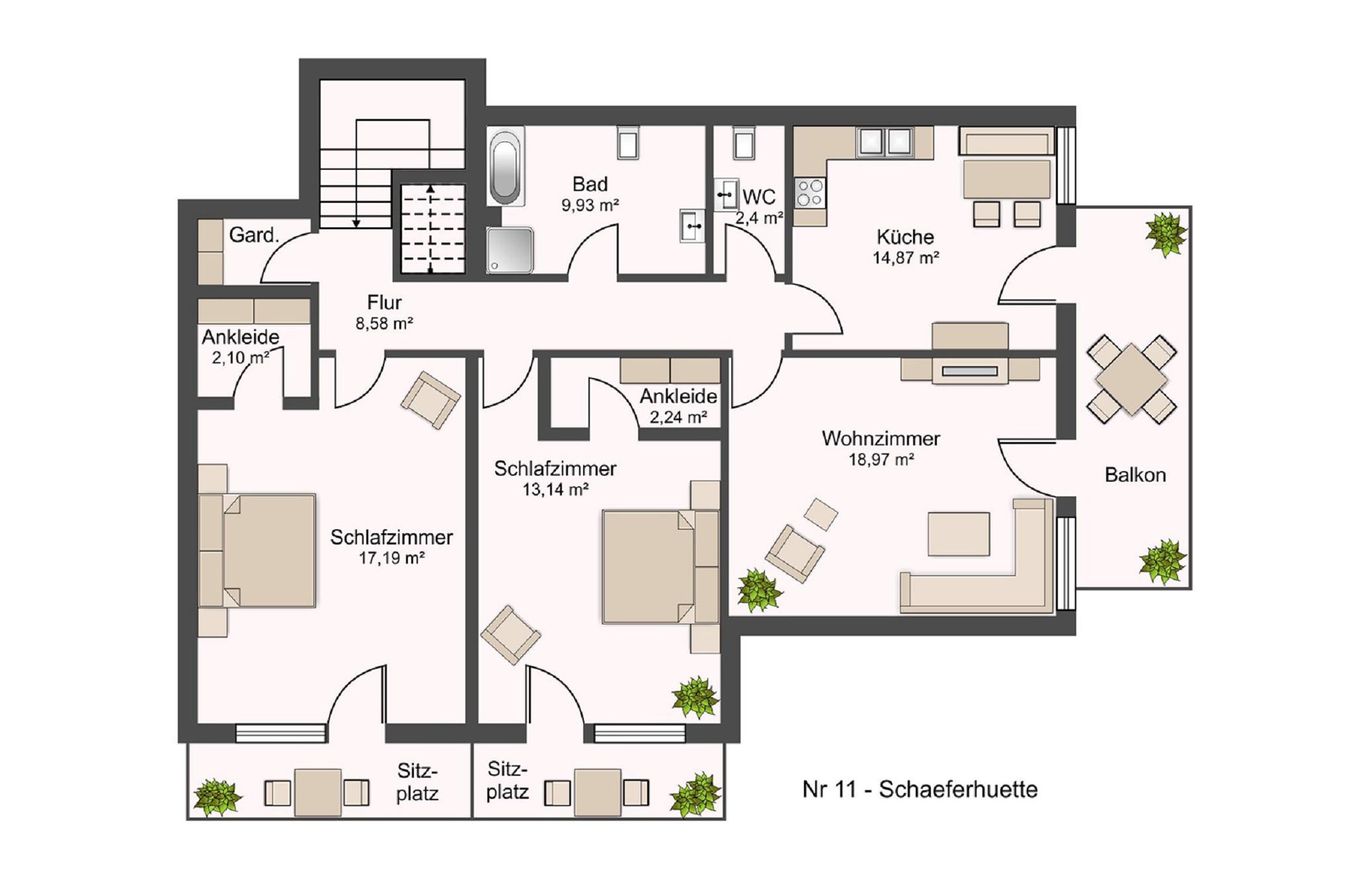 Ferienwohnung Schäferhütte Mehr Privatsphäre mit separatem Aufgang Zur Ferienwohnung Schäferhütte gelangen Sie über einen abgeschlossenen Aufgang. Durch die Zirbenholzbetten ist eine erholsame Nacht nach einem aufregenden Allgäuer Erlebnistag schon fast garantiert. Besonders die Ankleidezimmer in den beiden Schlafzimmern, die drei Balkone und die freistehende Badewanne machen die Schäferhütte zu einem ganz besonderen Feriendomizil.