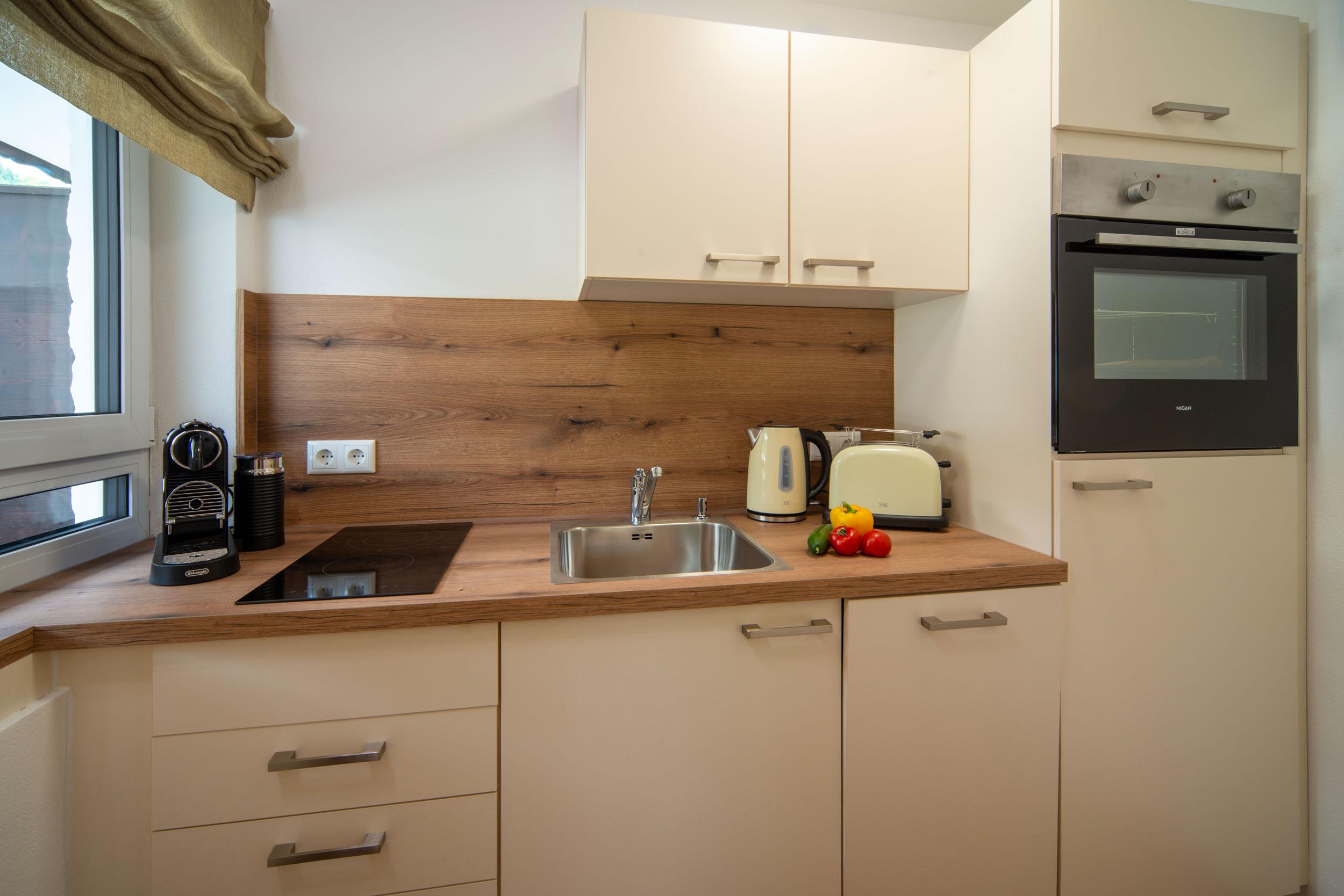 • separate Küche mit Nespresso Maschine, Milchaufschäumer, Toaster, Cerankochfeld, Backofen, Kühlschrank, Spülmaschine, Wasserkocher