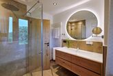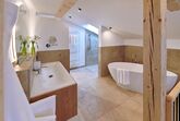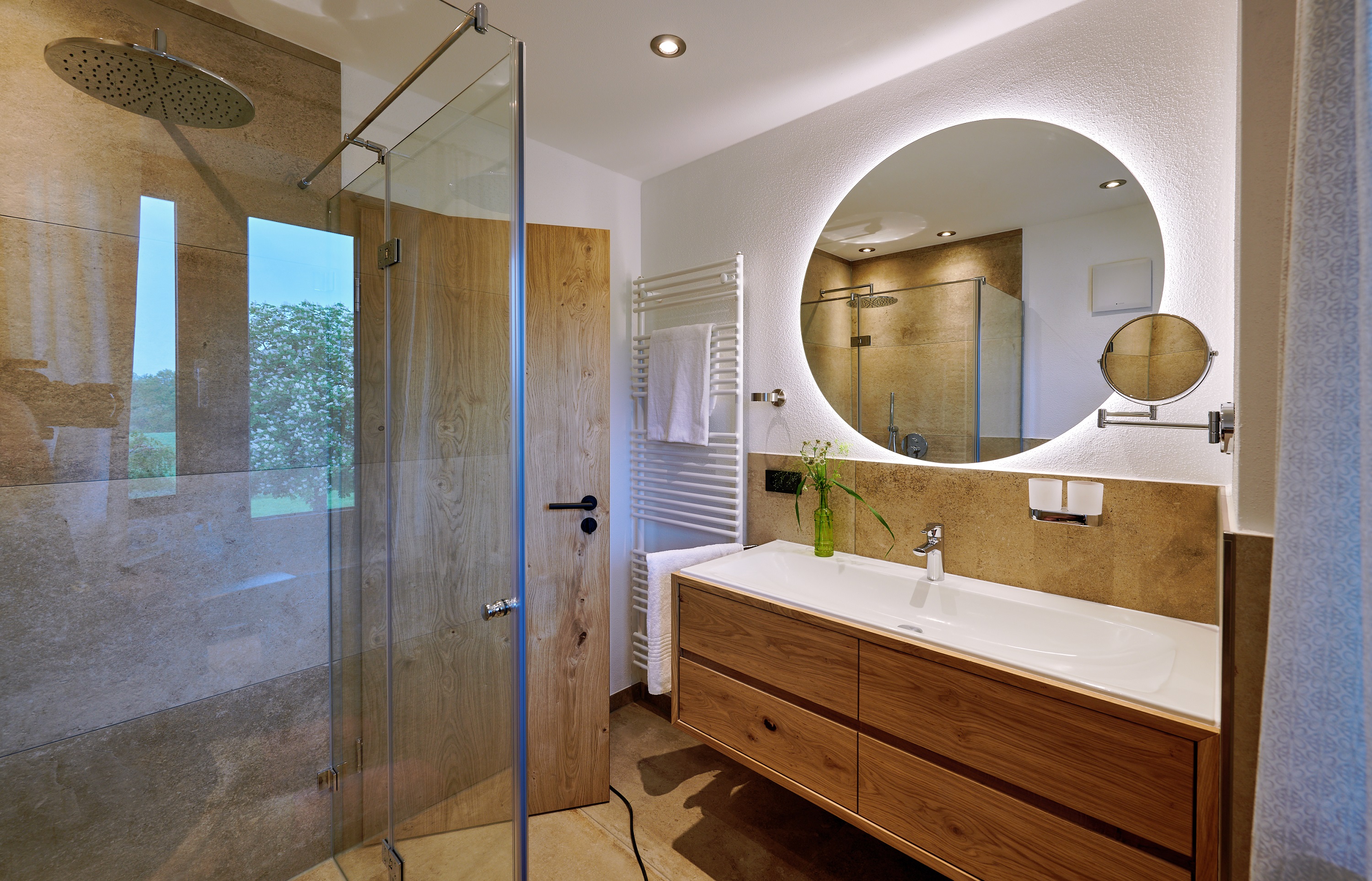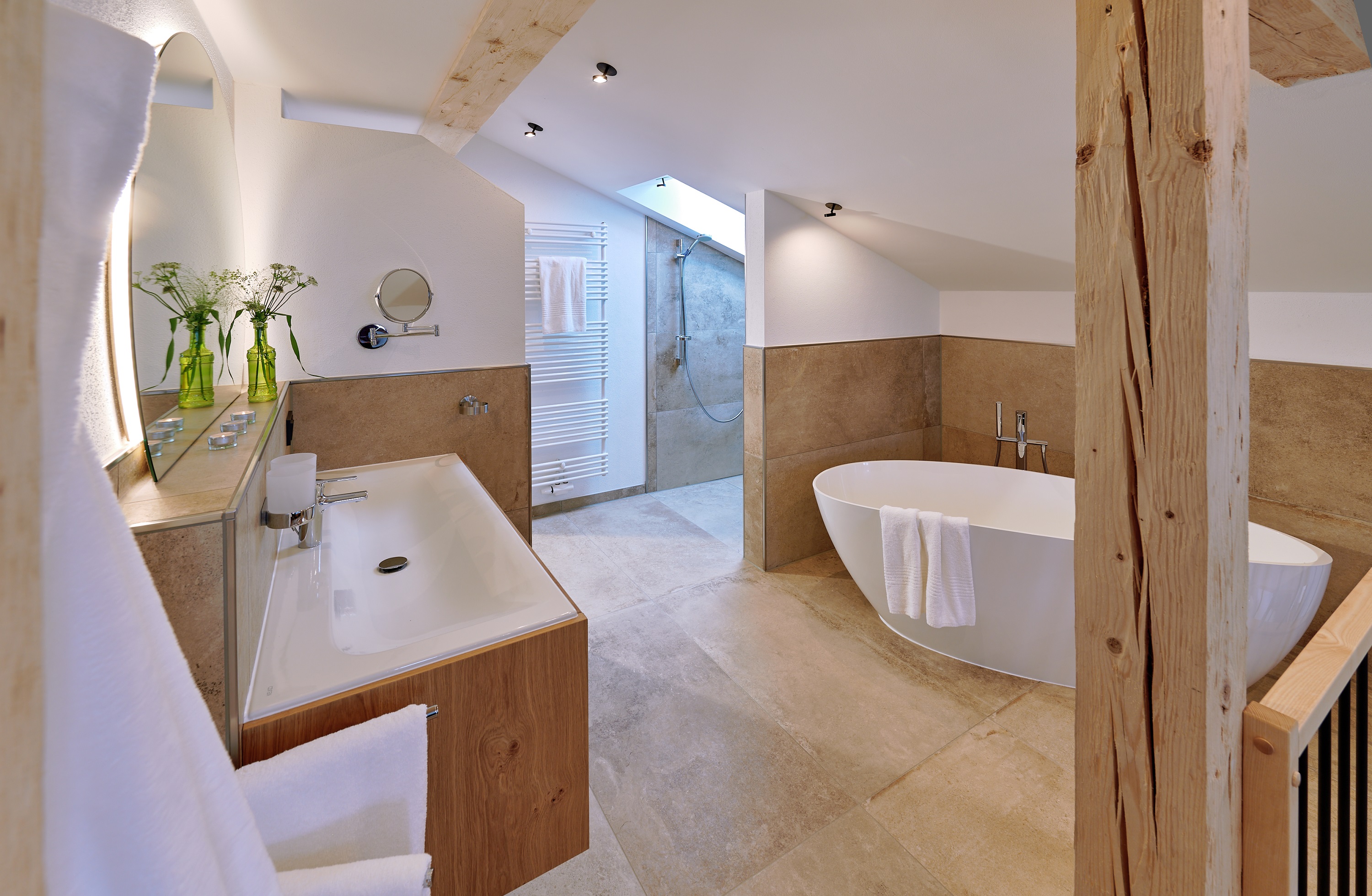 • 1 Eltern-Badezimmer mit begehbarer bodengleicher Dusche, frei stehender Badewanne, WC, Föhn, beheizbarem Handtuchtrockner und Schminkspiegel