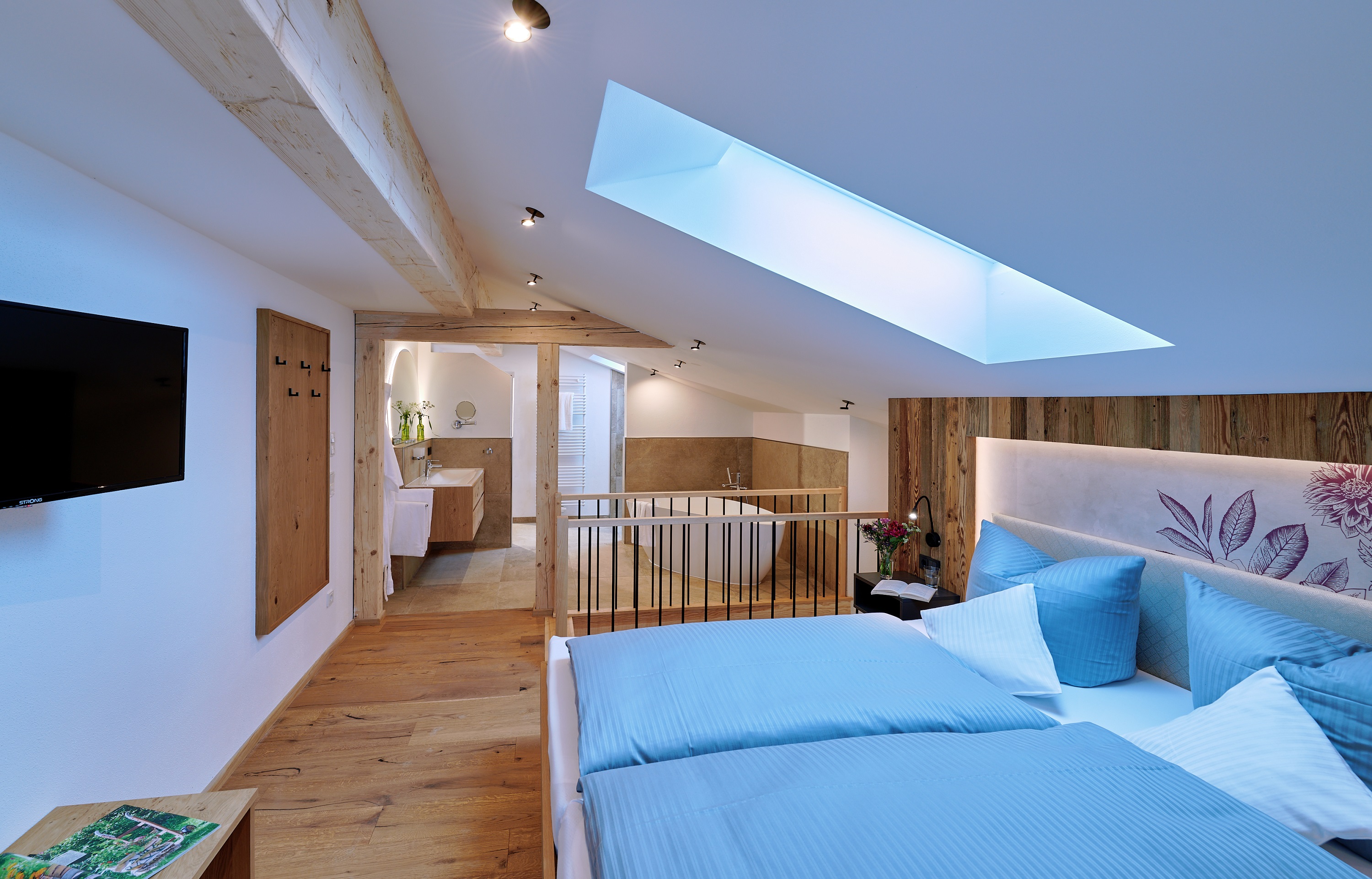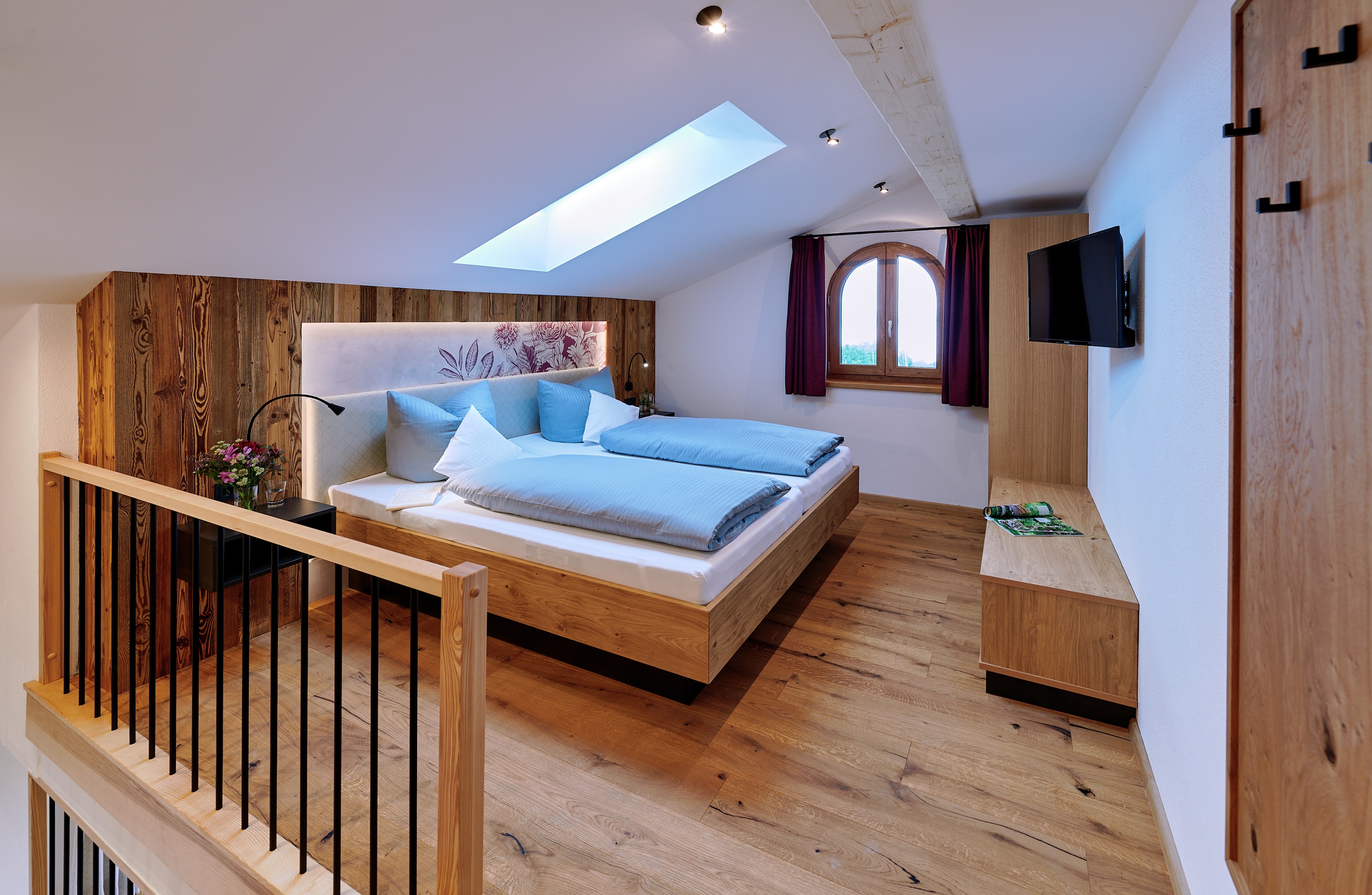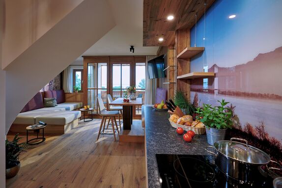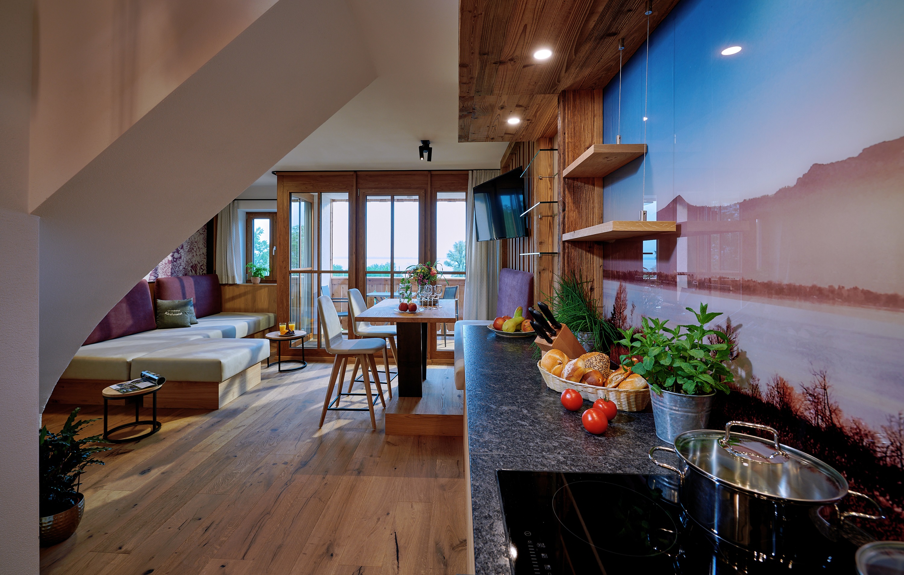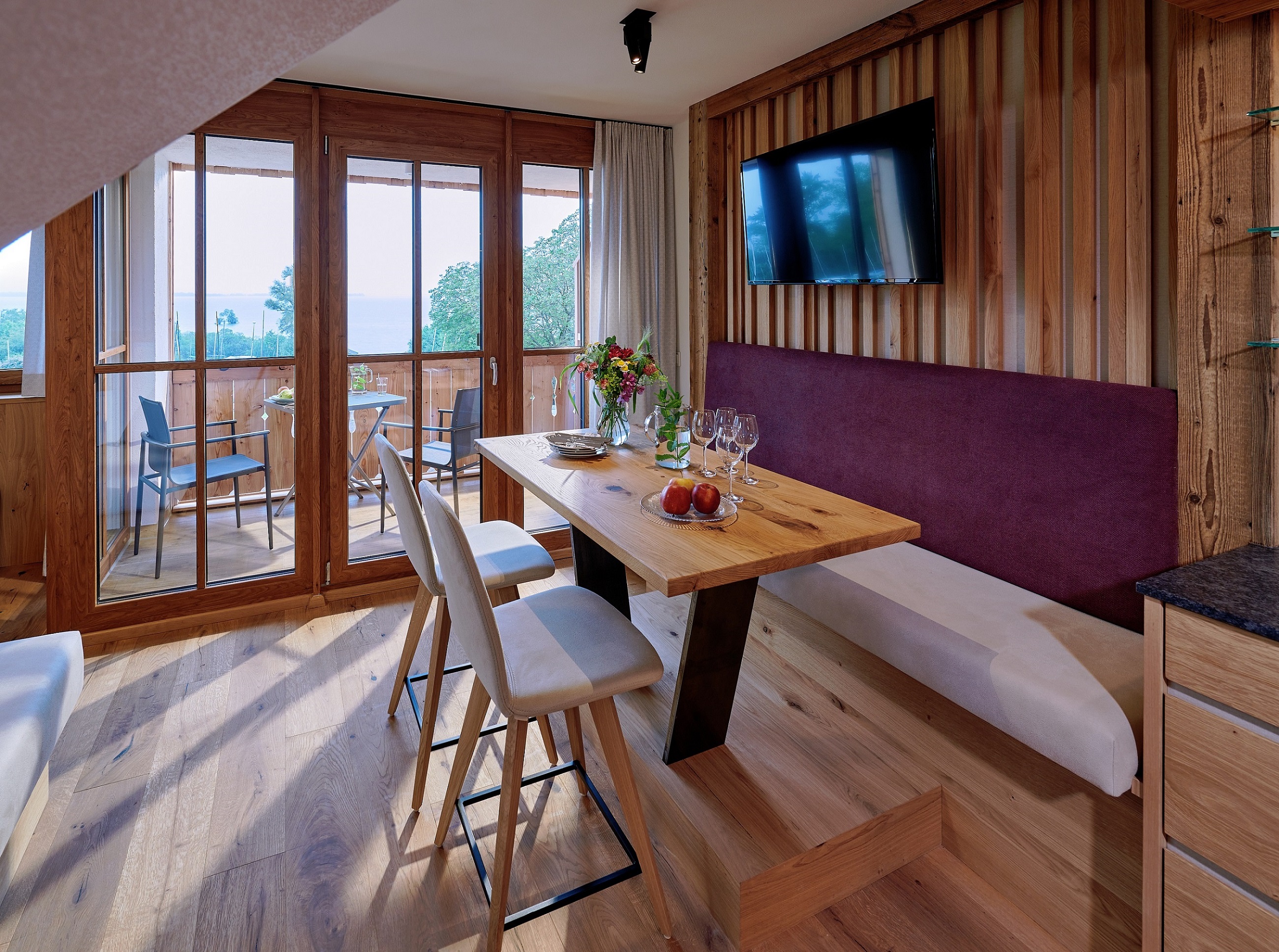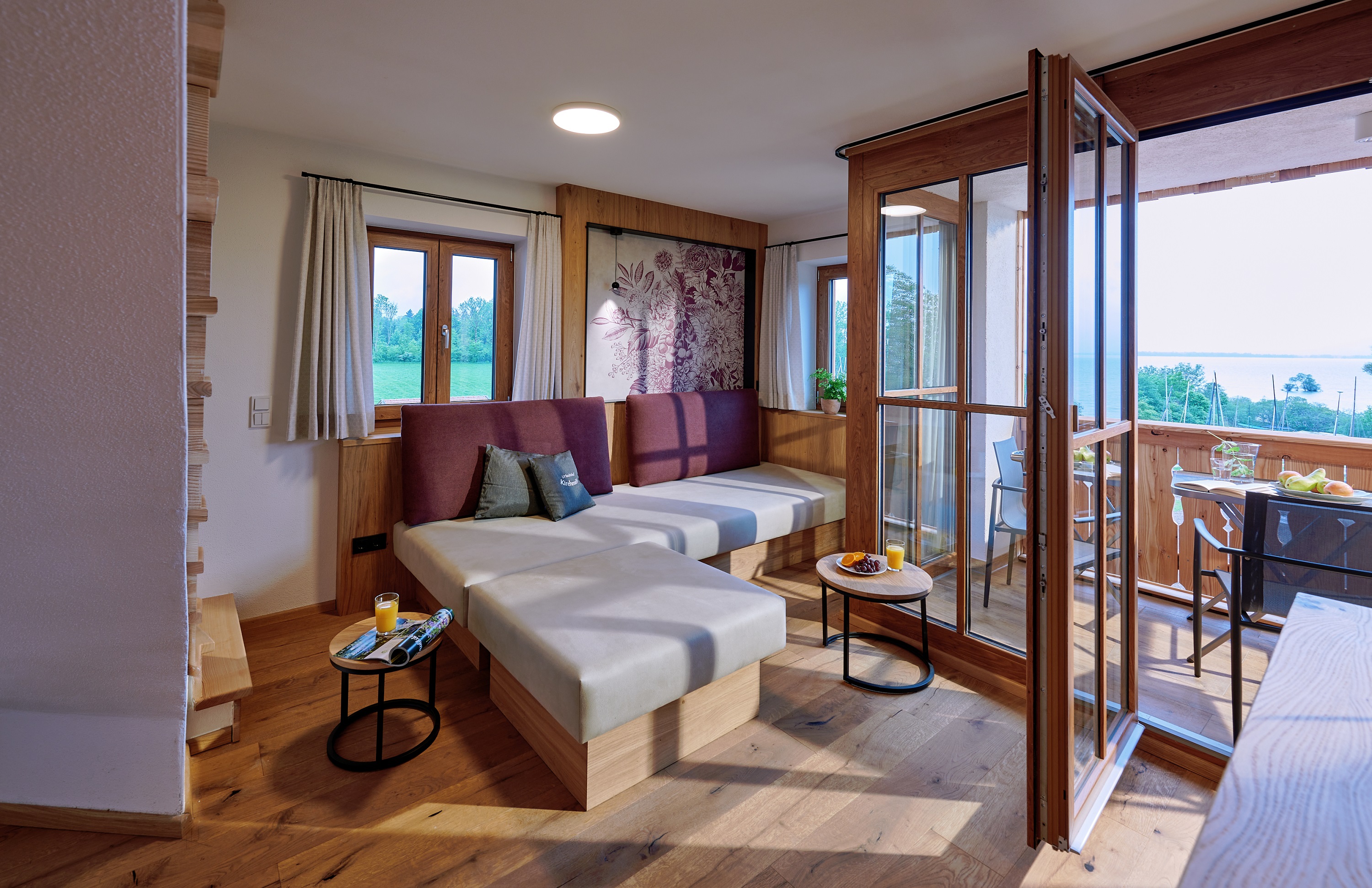 In der liebevoll mit natürlichen Materialien ausgestatteten 5-Sterne-Luxus-Ferienwohnung Herreninsel wirst du dich sofort wie zu Hause fühlen. Die dezenten, aufeinander abgestimmten Farben kombiniert mit viel Echtholz sorgen für einen urigen Charakter, und die vielen Glastüren und Dachfenster lassen die Wohnung hell und lichtdurchflutet wirken. Die beiden luxuriös gestalteten Badezimmer, eines davon mit frei stehender Badewanne, runden das Wohlfühlambiente ab. Eines der Highlights der Wohnung stellt der große Südbalkon mit traumhaftem Seeblick dar.