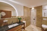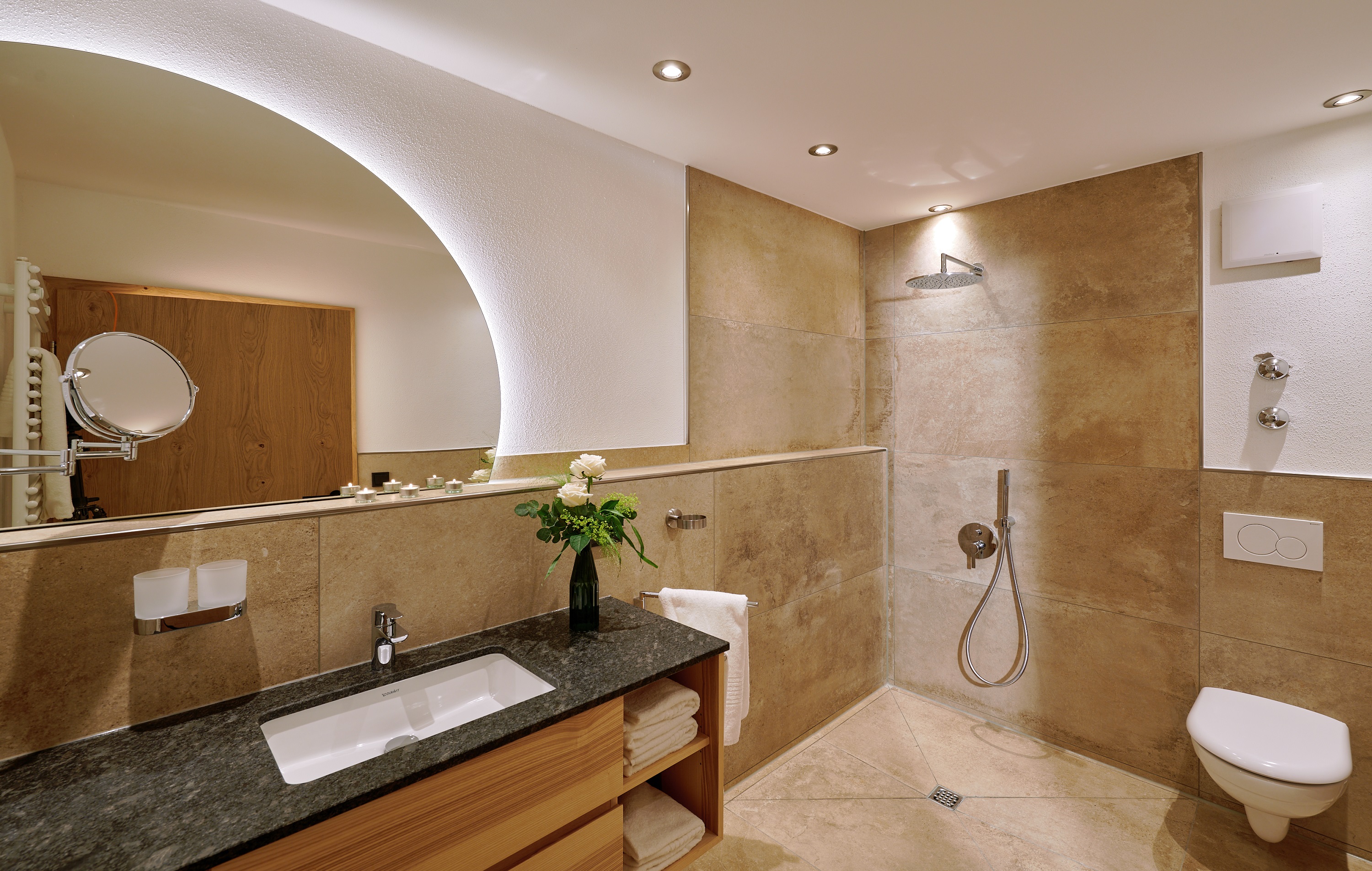 • 1 Badezimmer mit begehbarer bodengleicher Regendusche, WC, Föhn, beheizbarem Handtuchtrockner und Schminkspiegel