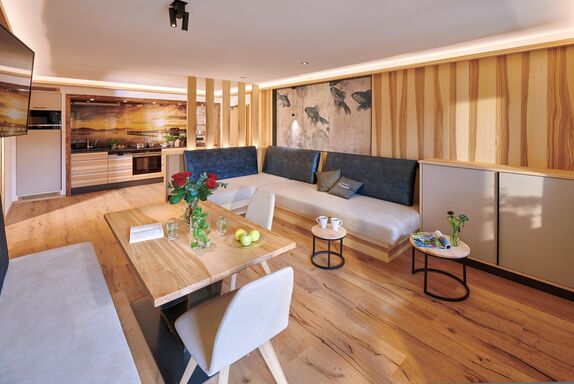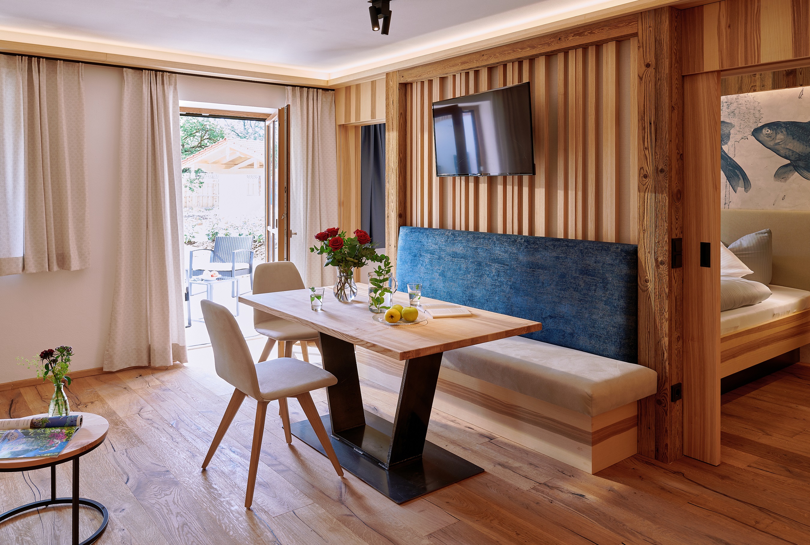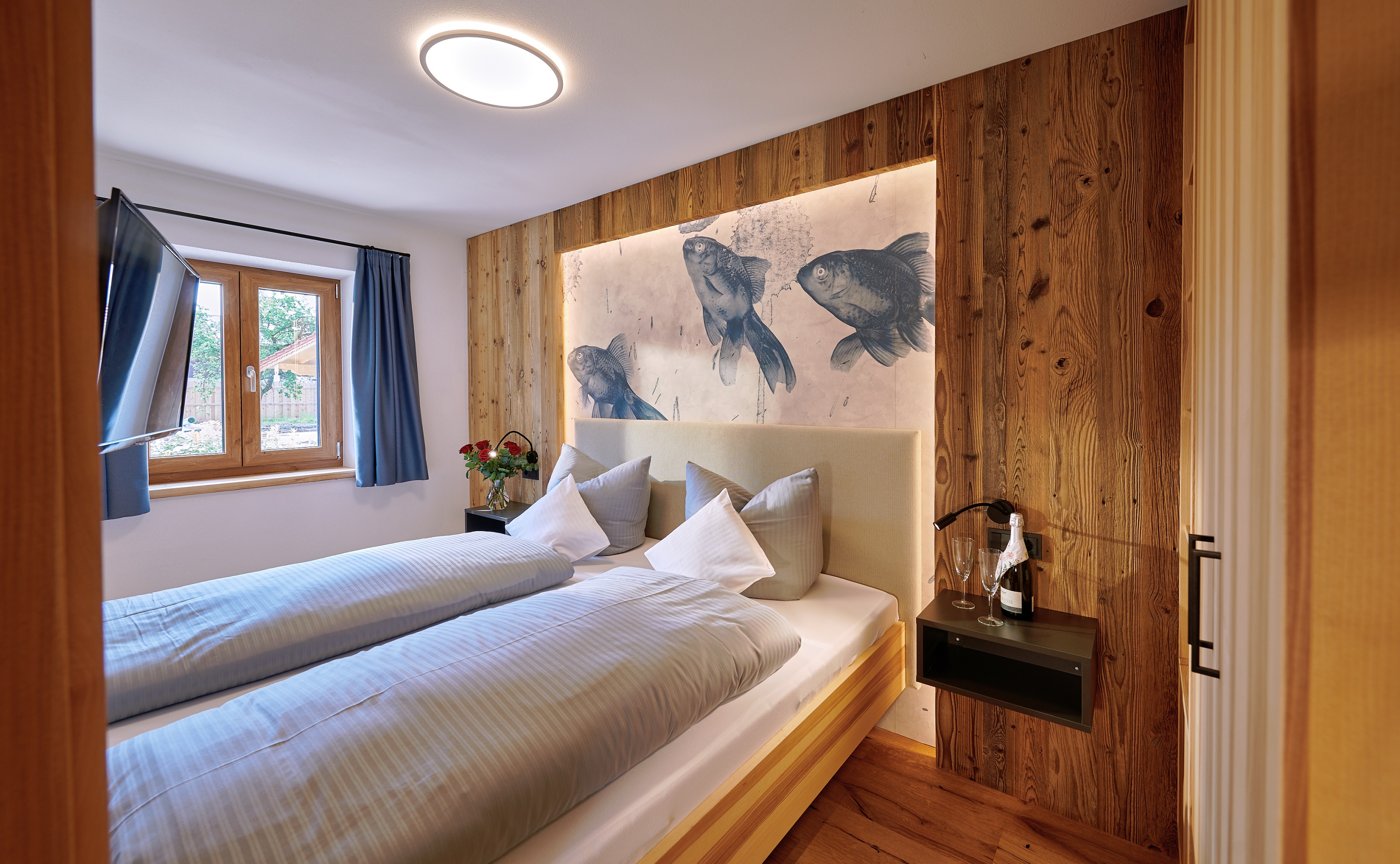 Erholung und Entspannung findest du in unserer luxuriösen 5-Sterne-Ferienwohnung Tiroler Ache im Erdgeschoss des Urlaubshofes Kirchmaier. Sofort nach deiner Ankunft wirst du dich in deinem Urlaubszuhause wohlfühlen. Das helle und offene Flair mit viel Echtholzausstattung wird durch die harmonisch aufeinander abgestimmte Inneneinrichtung sowie das luxuriöse Badezimmer mit Regendusche abgerundet. Auf der großzügigen Westterrasse mit Seeblick kannst du die Seele baumeln lassen, die traumhafte Natur rund um unseren Ferienhof genießen und bei einem unvergesslichen Sonnenuntergang den Urlaubstag ausklingen lassen.