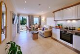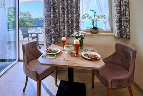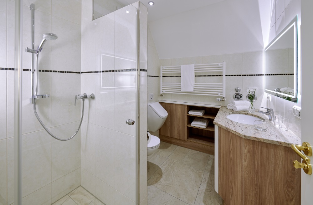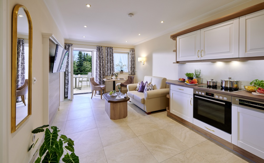 Die Ferienwohnung ist in Richtung Nord-Ost zur Kirche und zum Kurpark ausgerichtet. Der Balkon befindet sich an der Ostseite. Alle Fewos sind ausgestattet mit Flachbild-Fernseher 40 bzw. 43 Zoll, Herd mit Backofen, Spülmaschine, Kühlschrank mit Gefrierfach, Kaffeemaschine, Toaster, Kochgeschirr, Geschirr, Safe, Föhn, WLAN, Geschirrtücher, Bettwäsche und Handtücher.Für alle Gäste: Aufzug, Aufenthaltsraum im EG, Waschmaschine und Trockner im EG, Terrasse im EG, Park (5000 m²) mit Liegen, ausreichend Parkplätze, abschließbare Fahrradgarage und Sauna.