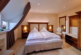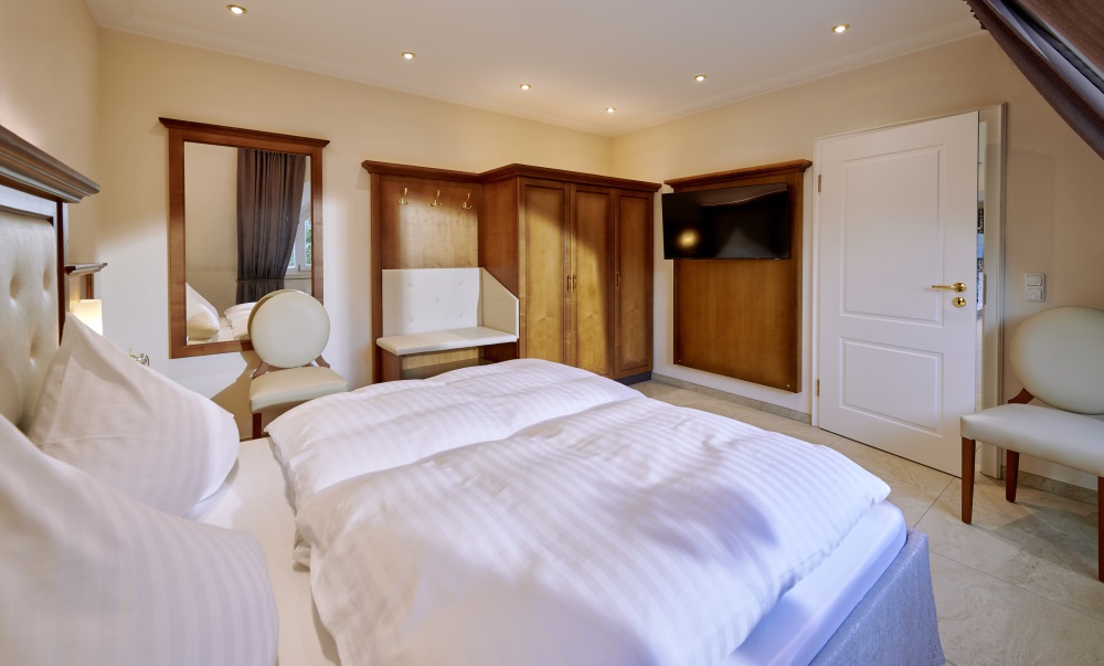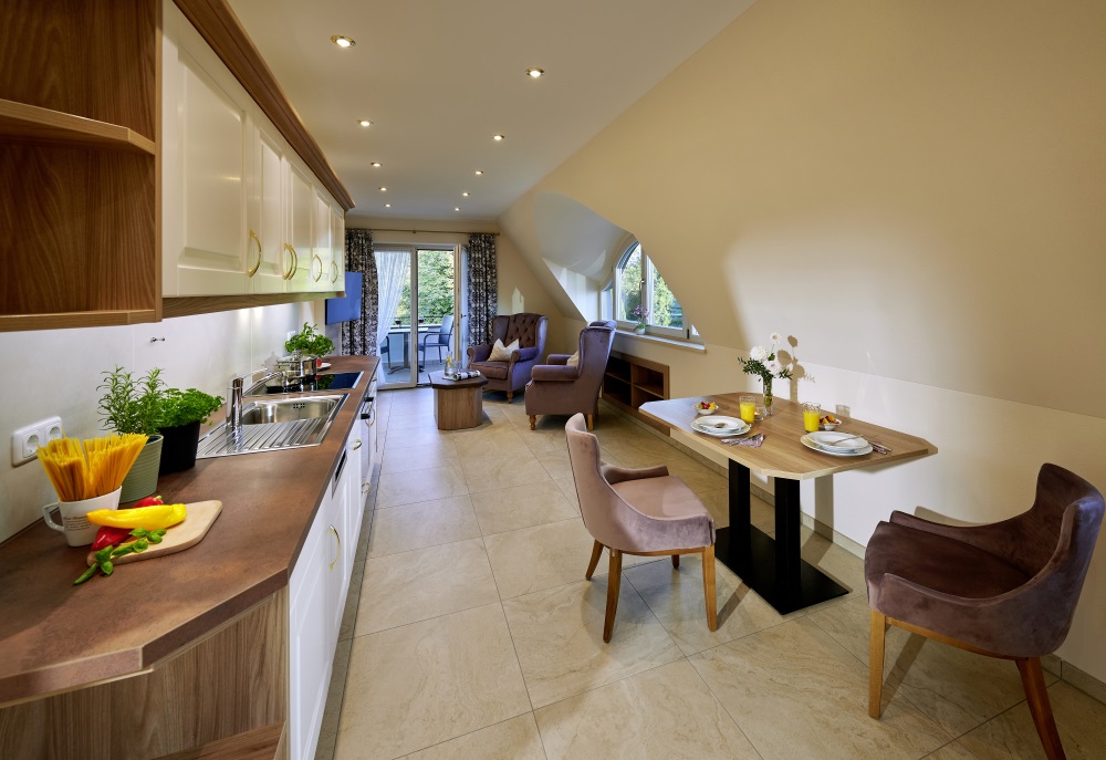 Die Ferienwohnung ist in Richtung Kurpark und Kirche (Nord-Ost) ausgerichtet. Der Balkon befindet sich auf der Ostseite. Alle Fewos sind ausgestattet mit Flachbild-Fernseher 40 bzw. 43 Zoll, Herd mit Backofen, Spülmaschine, Kühlschrank mit Gefrierfach, Kaffeemaschine, Toaster, Kochgeschirr, Geschirr, Safe, Föhn, WLAN, Geschirrtücher, Bettwäsche und Handtücher.Für alle Gäste: Aufzug, Aufenthaltsraum im EG, Waschmaschine und Trockner im EG, Terrasse im EG, Park (5000 m²) mit Liegen, ausreichend Parkplätze, abschließbare Fahrradgarage und Sauna.