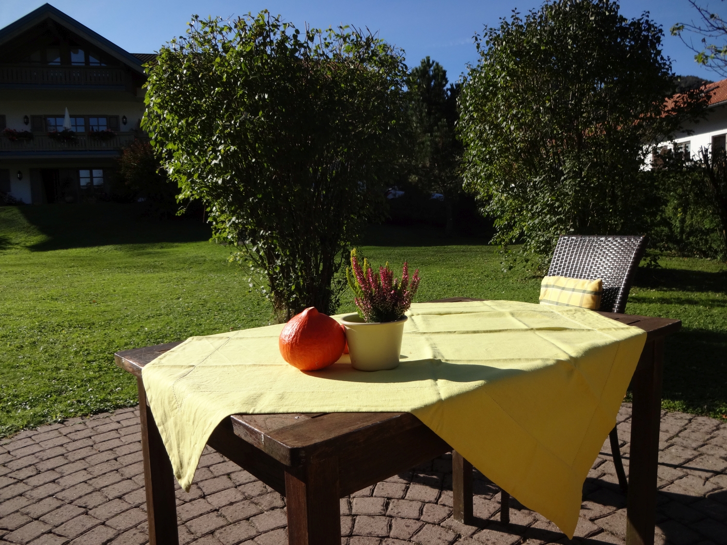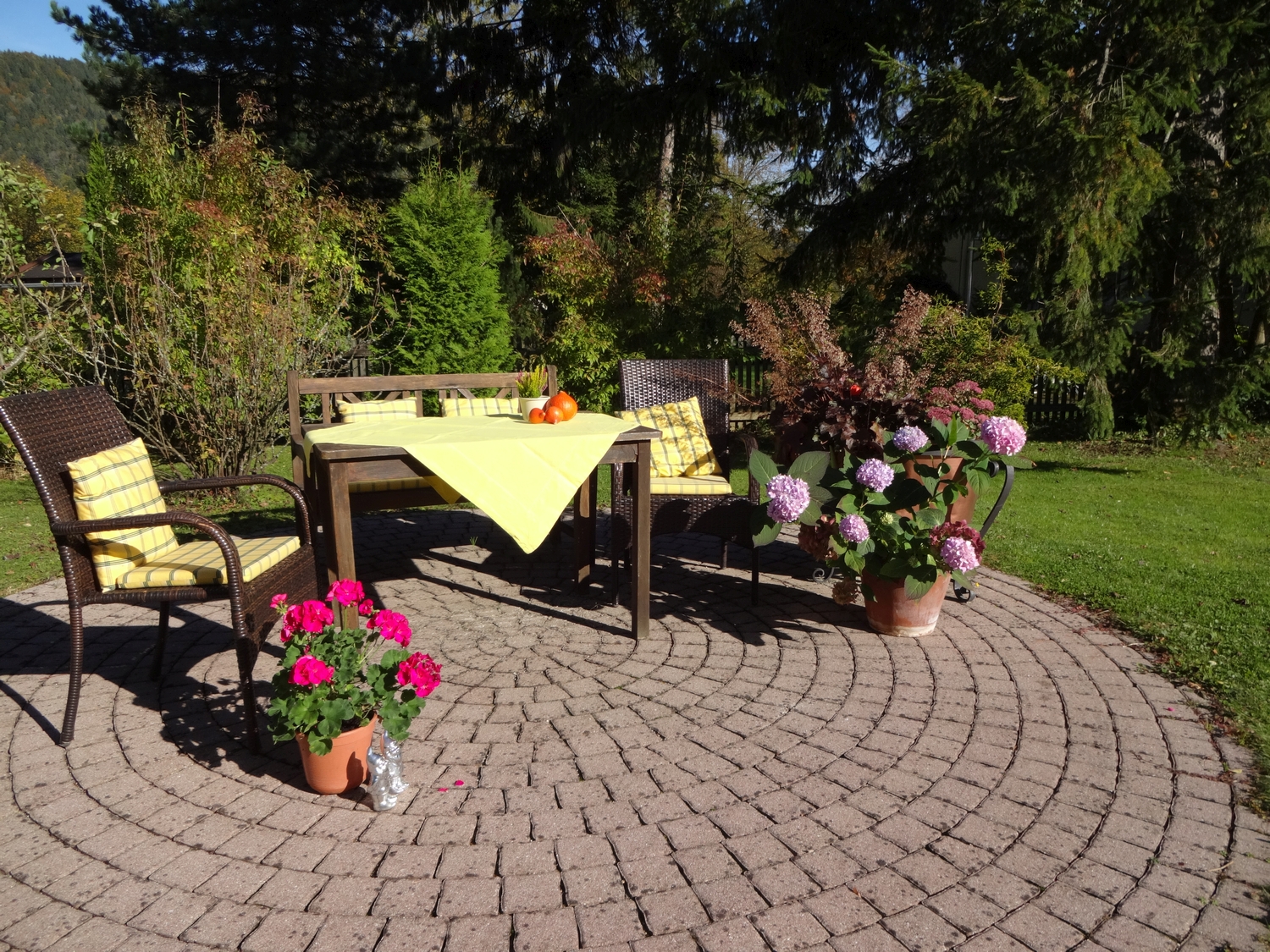 Eine Wohnung (61 qm) mit Terrasse und direktem Zugang zum Garten, schöner Blick auf die Berge, im Landhausstil eingerichtet, Küche extra mit Kühlschrank, Backofen und Geschirrspüler sowie Essplatz. Wohnzimmer mit Couchgarnitur, Schlafzimmer mit Parkettboden, Dusche / WC, Fön.