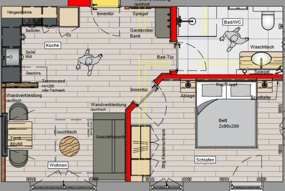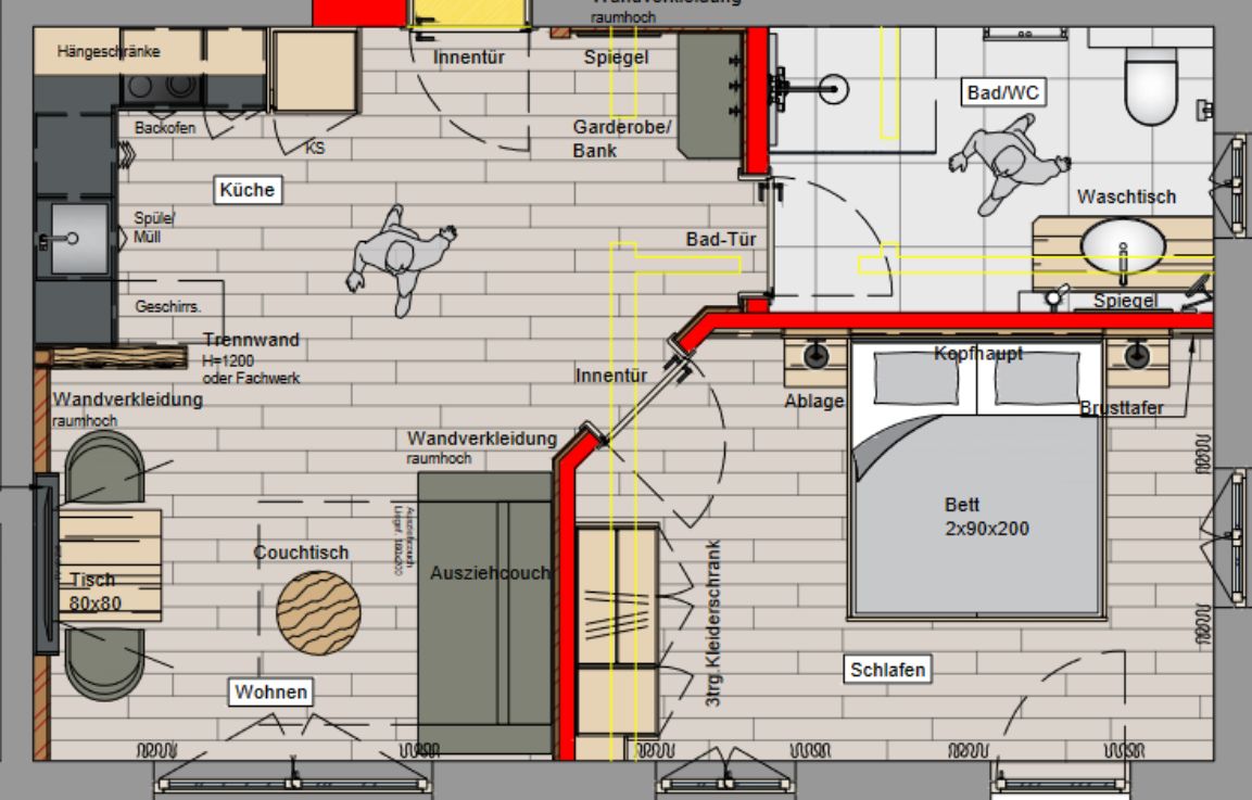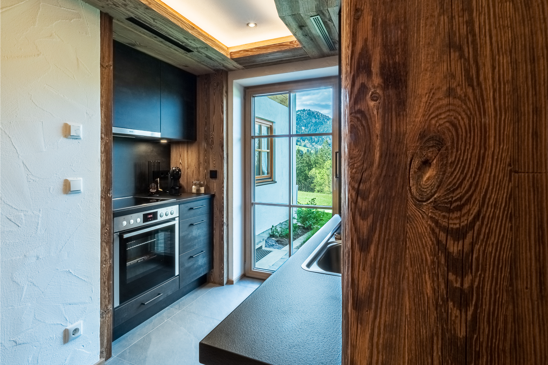 Appartment mit Altholz, 40qm, Doppelbett 1,80 x 2,00, eine Schlafcouch mit Lattenrost und Matratze ist in der Wohnküche vorhanden, Breite 1,60 Küche, Bad, Fön, Terasse mit Bergblick.