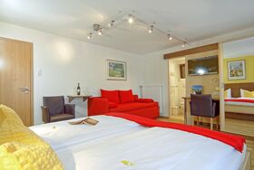 Diese neue moderne Ferienwohnung mit Terrasse ist für Allergiker geeignet, sie ist mit Parkettböden ausgestattet und bietet Platz für 5 Personen. Unsere Dreizimmerwohnung verfügt über eine voll ausgestattete Küche mit großem Kühl-/Gefrierschrank, Mikrowelle, Backofen, Cerankochfeld, Kaffeemaschine, Küchenutensilien, Spülmaschine und Spüle. Ein Esstisch mit 5 Stühlen und kleiner Couch lädt zu einem gemütlichen Beisammensein ein. Ein LCD-Flachbildschirm DVBT -TV und eine Mikro-Stereoanlage sorgen für Ihre Unterhaltung. Zwei getrennte Schlafzimmer mit je einem Doppelbett 180 x 200 cm, eines davon mit einem zusätzlichen Einzelbett 90 x 180 cm, LCD-Flachbildschirm, Radiowecker, Bettwäsche, Schlummerkissen, Kuscheldecke. Zu jedem Zimmer gehört ein eigenes Bad mit Dusche/WC, Handtüchern, Föhn, Kosmetikspiegel, Handtuchwärmer, Toilettenartikeln und Schuhlöffel sowie eine Sitzecke mit Tisch und Stühlen und ein Schreibtisch, Safe und Infomappe. Kostenloses W-LAN ist selbstverständlich verfügbar. Die Terrasse verfügt über Sitzgelegenheiten und ist mit Tisch/Liegen und Sonnenschirm ausgestattet. Der begehbare Kleiderschrank bietet zusätzlichen Stauraum. Ein Akkustaubsauger ist ebenfalls in der Wohnung vorhanden. Gerne können Sie auch unseren täglichen Brötchenservice gegen eine Gebühr in Anspruch nehmen. Die Wohnung kann nur wochenweise gebucht werden, Anreise am Samstag - kürzere Zeiträume nur auf Anfrage! Babybetten/Hochstühle sind auf Anfrage erhältlich.Bitte beachten Sie, dass wir keine Tiere in unserem Haus aufnehmen können. Wir empfehlen Ihnen den Abschluss einer Reiserücktrittsversicherung!