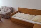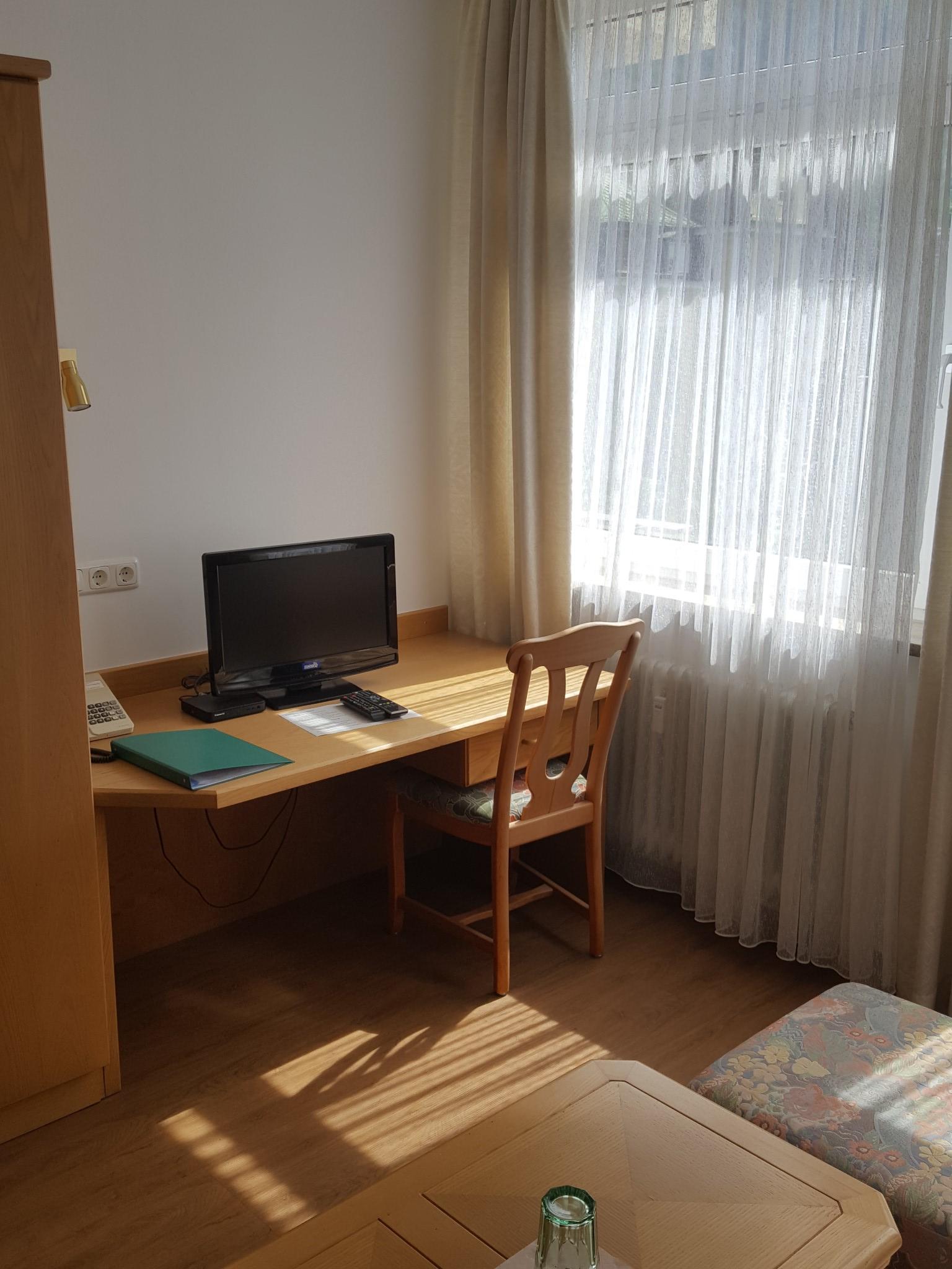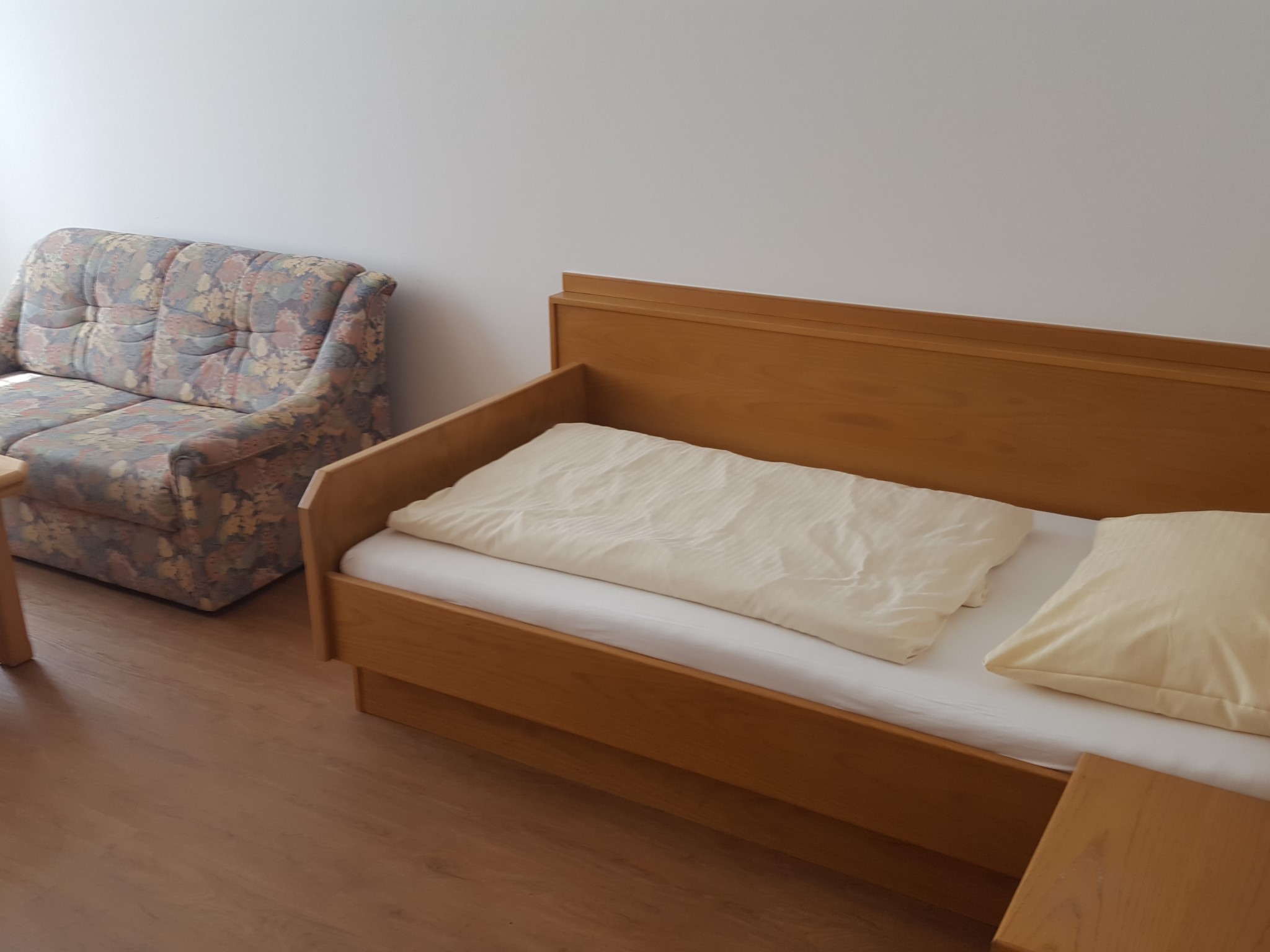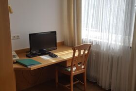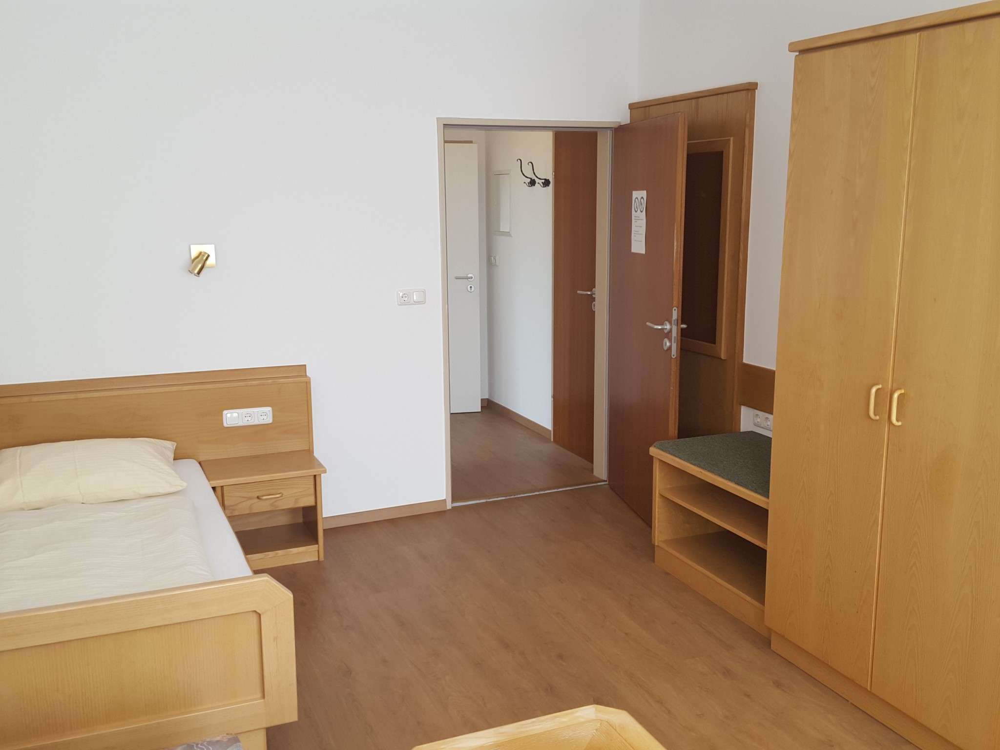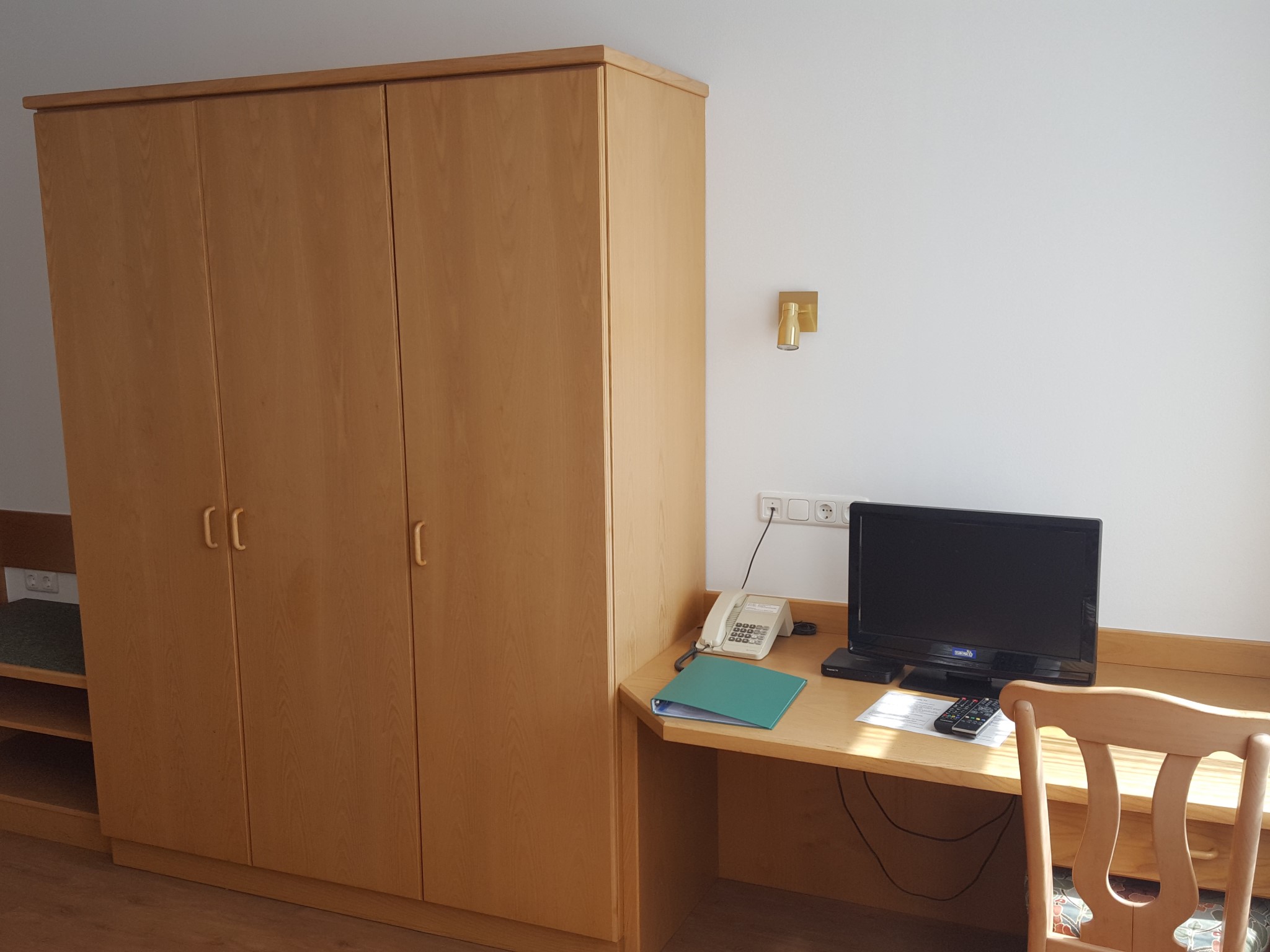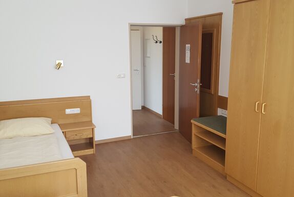 Das etwa 26 m² große Einzelzimmer 210 befindet sich im 2. Stock nach Südwesten zur Mozartstraße (mit Nachtfahrverbot) gelegen mit wunderschönem Blick auf den Predigtstuhl, das Lattengebirge sowie Staufen und Zwiesel. Es ist mit einem neuen PVC Boden in Eichenoptik, einem Einzelbett (100 x 200 cm), einem gemütlichen Sitzbereich mit Ausziehcouch, einem Tisch, einem großen Einbauschrank, einem Kofferbock und einem Schreibtisch mit Flachbild-TV ausgestattet. Steckdosen sind in großer Zahl und gut erreichbar in Bettnähe und beim Schreibtisch vorhanden.