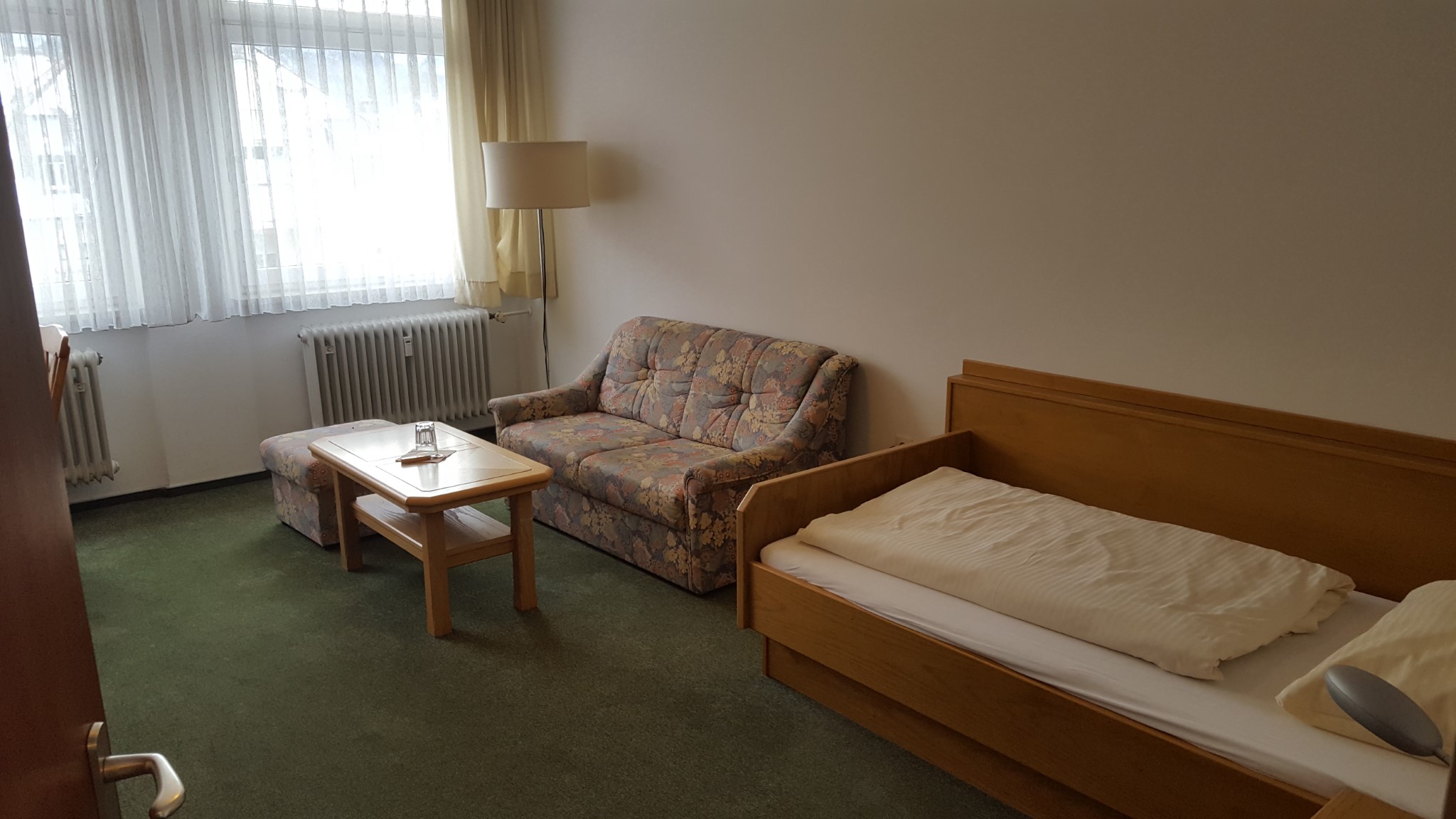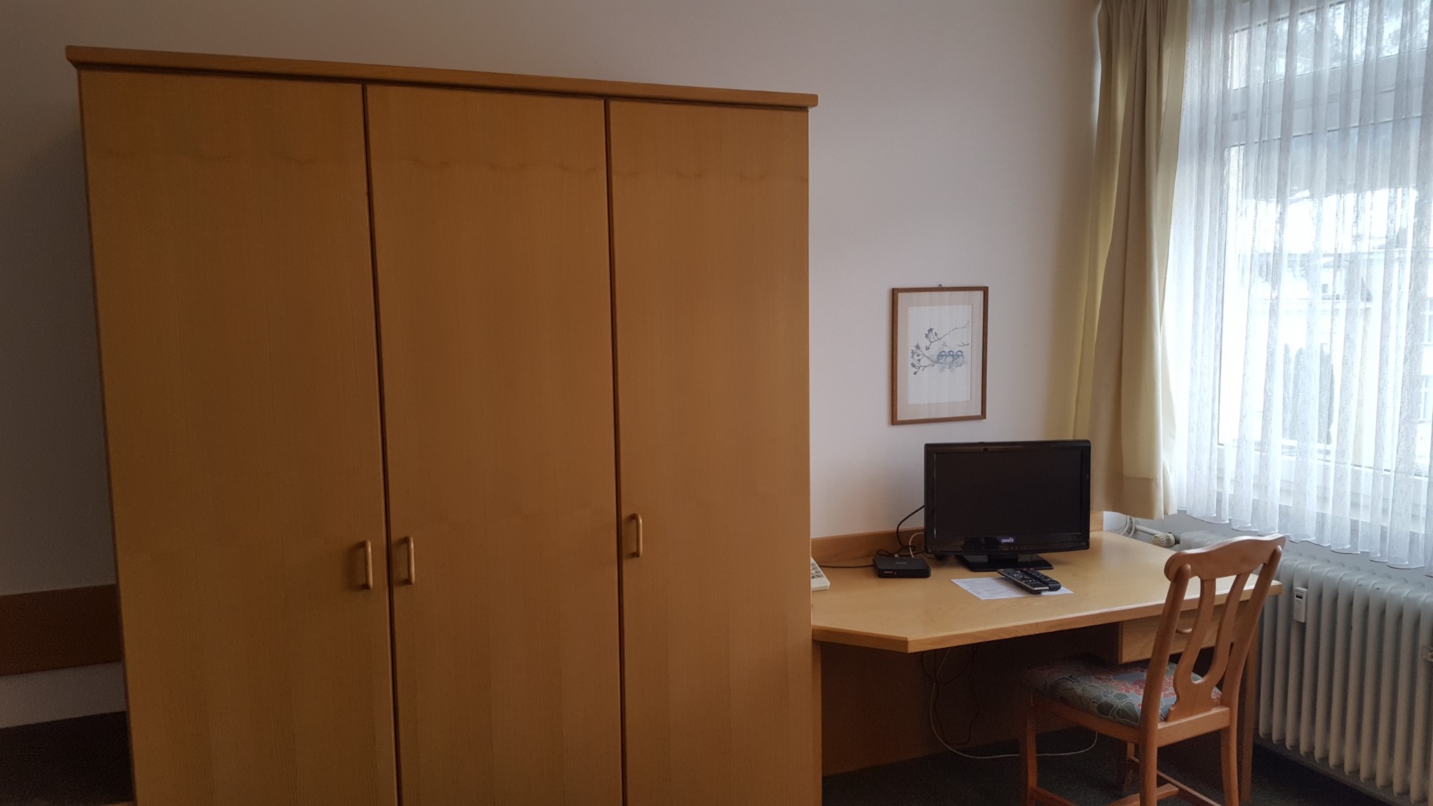 Das etwa 26 m² große Einzelzimmer 310 befindet sich im 3. Stock nach Südwesten zur Mozartstraße (mit Nachtfahrverbot) gelegen mit wunderschönem Blick auf den Predigtstuhl, das Lattengebirge sowie Staufen und Zwiesel. Das Zimmer ist mit Teppichboden, einem Einzelbett (100 x 200 cm), einem gemütlichen Sitzbereich mit Ausziehcouch und Tisch, einem großen Einbauschrank, Kofferbock und einem Schreibtisch mit Flachbild-TV ausgestattet.