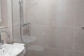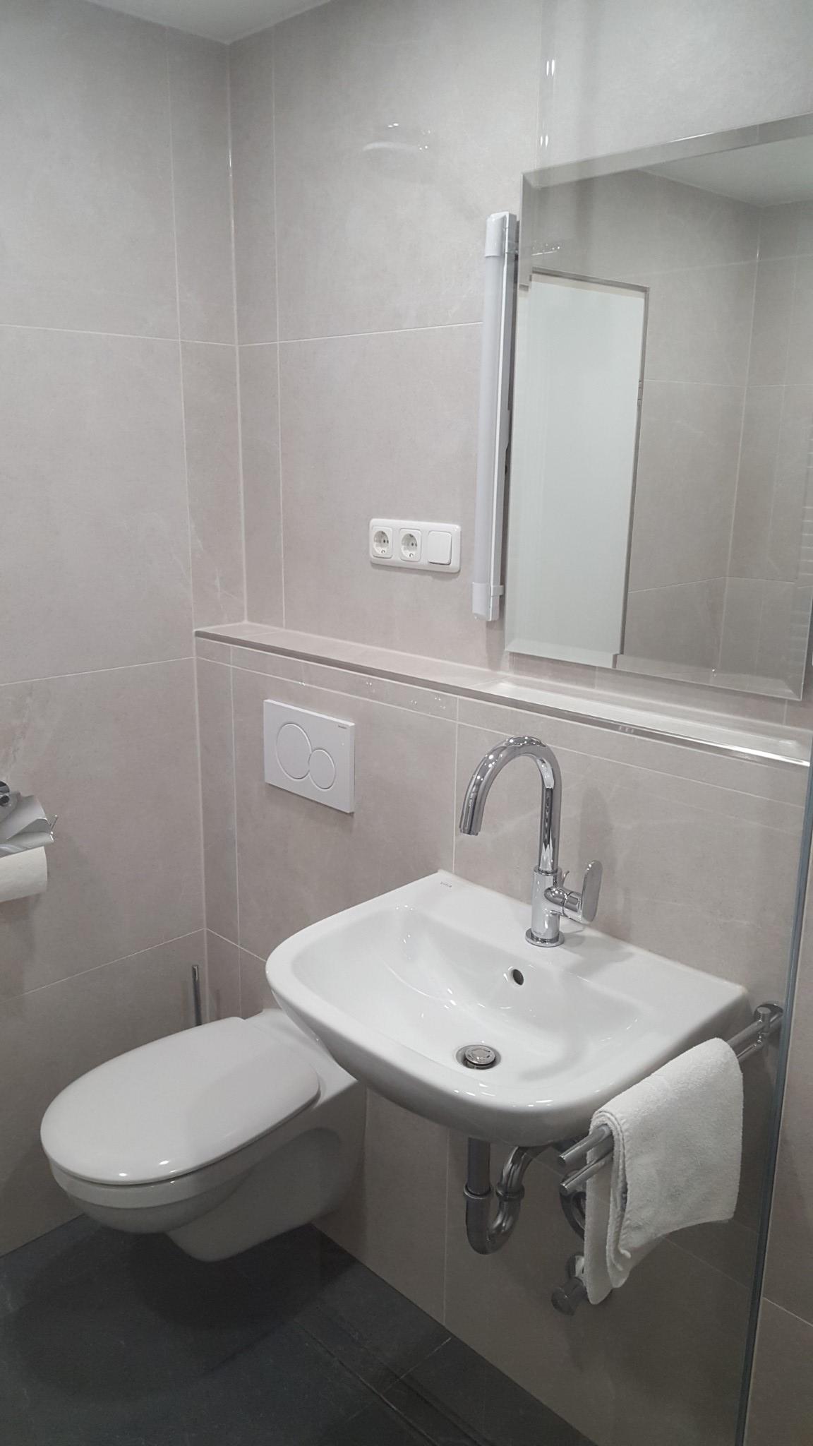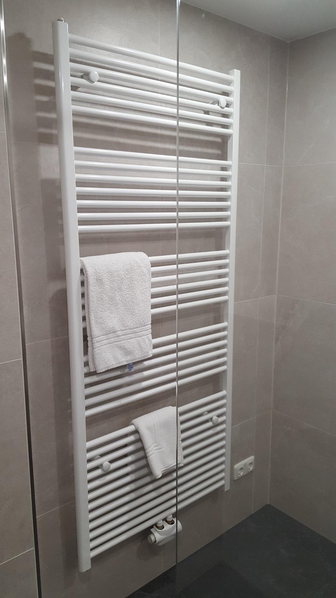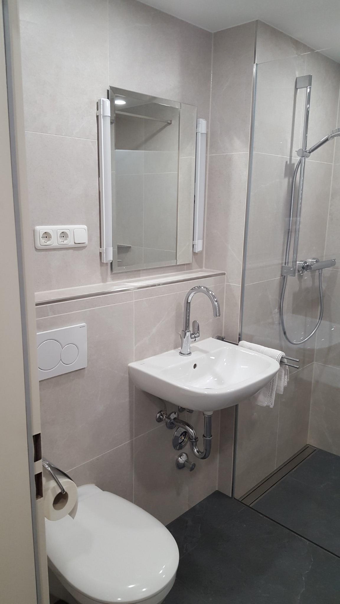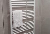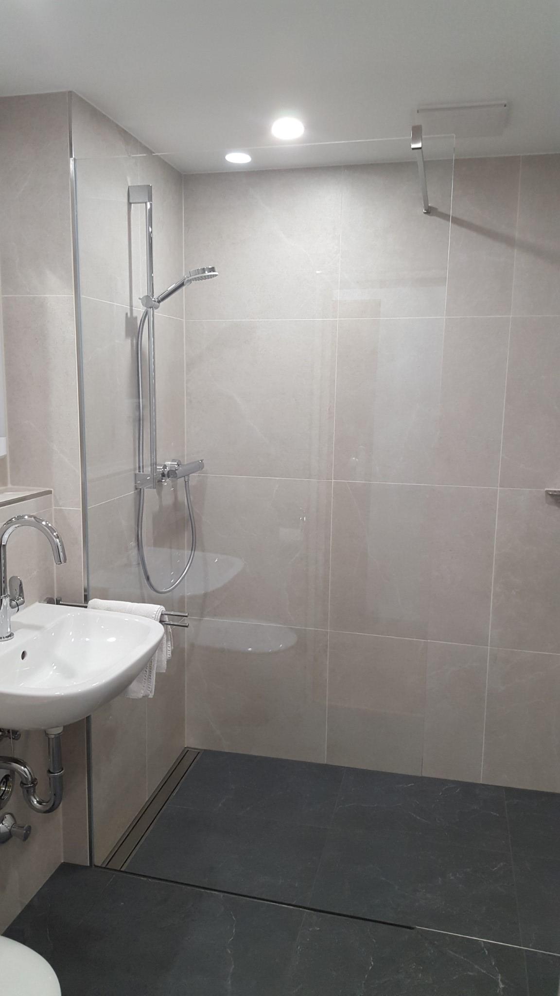 Das Bad ist komplett neu und verfügt über eine bodenebene Walk-in-Dusche mit Glaswand, WC, Waschbecken mit beleuchtetem Spiegel und großem Handtuchheizkörper. Ein Haartrockner ist vorhanden.
