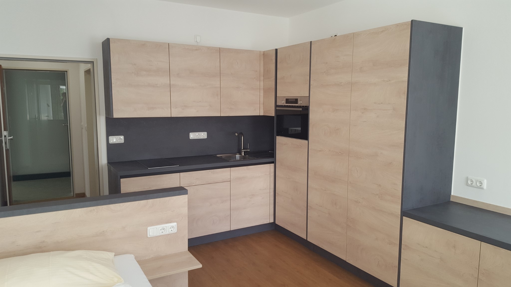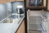 Die Einbauküche fügt sich perfekt in das Ensemble der restlichen Einbaumöbel ein. Sie ist mit einem 2-fach Induktionskochfeld, Backofen, großen Kühlschrank mit Gefrierfach, Wasserkocher, Kaffeemaschine sowie einer Grundausstattung an Töpfen, Geschirr, Besteck etc. ausgestattet.